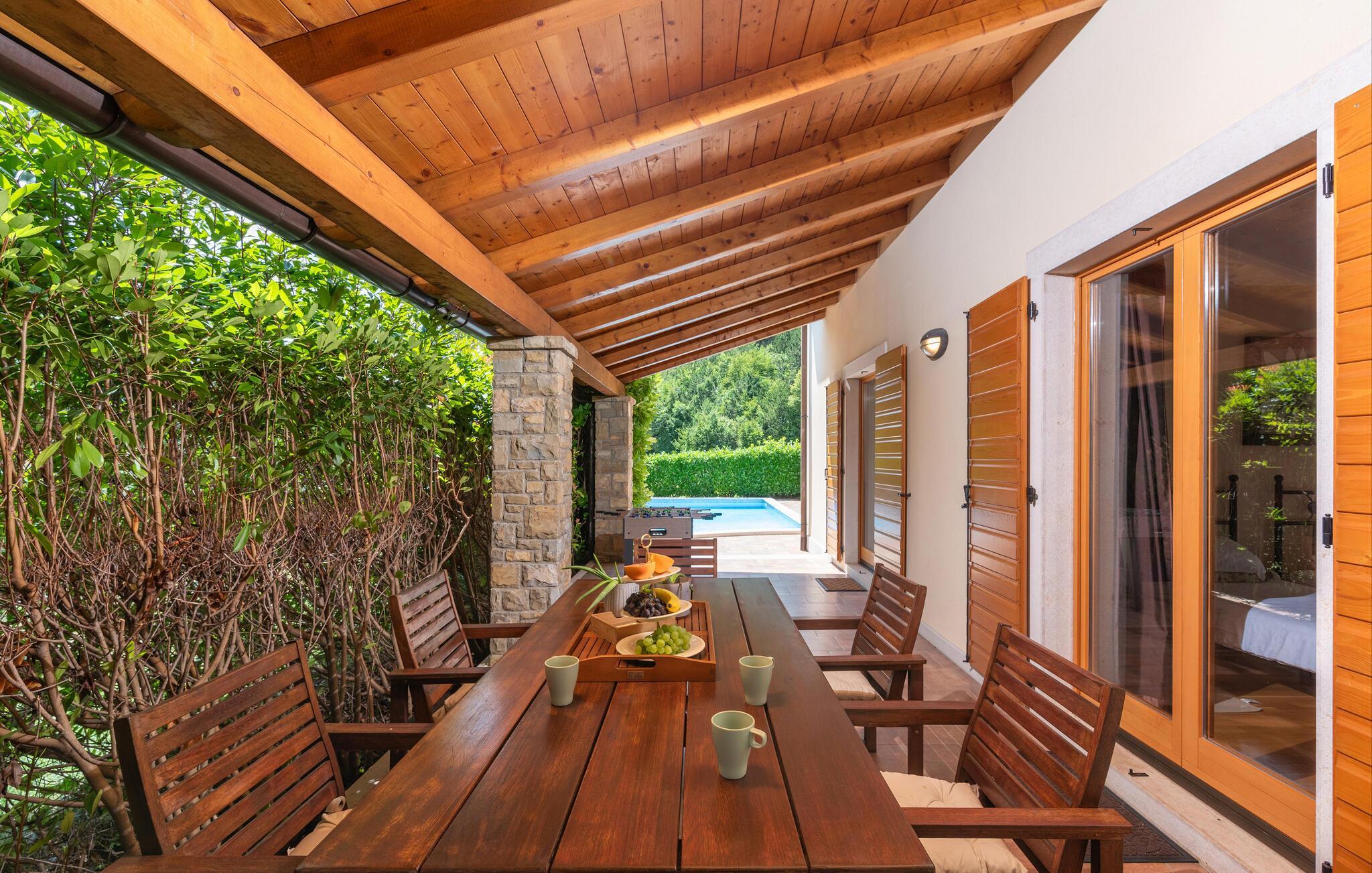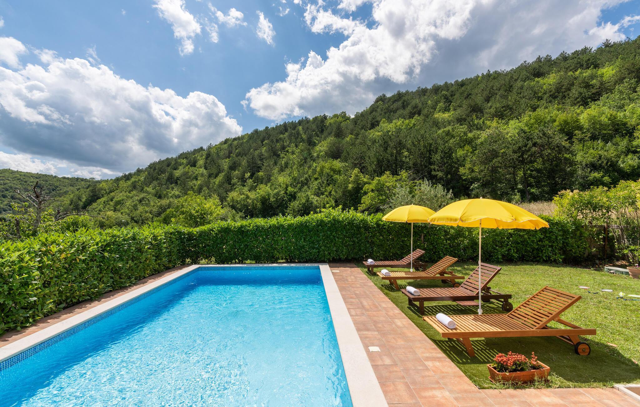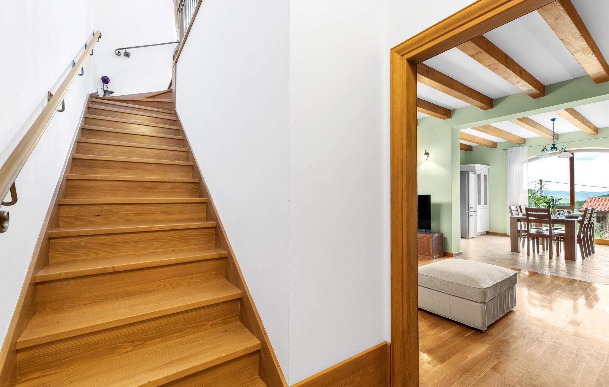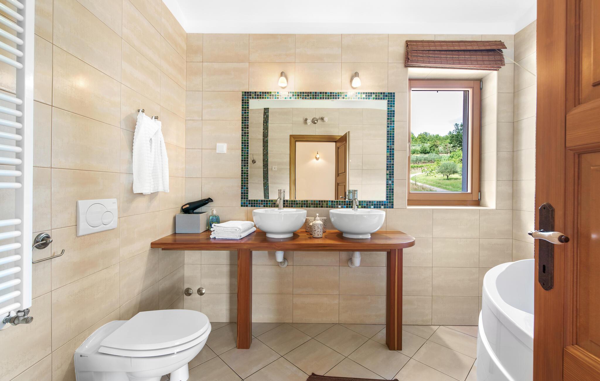 Villa Dol ist ein charmanter, rustikaler Rückzugsort in einer ruhigen Umgebung, perfekt zum Entspannen. Der Außenbereich der Villa umfasst einen Pool, drei überdachte Terrassen für Mahlzeiten im Freien, einen gepflegten Garten und zwei Parkplätze. Im Inneren trifft Komfort auf rustikalen Charme auf zwei klimatisierte Etagen. Das Erdgeschoss umfasst ein gemütliches Wohnzimmer mit Kamin, eine gut ausgestattete Küche mit Essbereich und zwei Schlafzimmer – eines mit Doppelbett und das andere mit getrennten Betten – jedes mit eigenem Bad sowie eine zusätzliche separate Toilette. Im Obergeschoss finden Sie ein geräumiges Schlafzimmer mit Doppelbett und eigenem Bad, das zu einer großen Terrasse führt, die einen atemberaubenden Panoramablick auf die umliegende Landschaft bietet. Villa Dol liegt am Rande eines ruhigen Dorfes im grünen Inland Istriens. Das nächste Restaurant liegt 7 km entfernt in Sovinjak und die 12 km entfernte Stadt Buzet bietet Supermärkte, Bäckereien, Geldautomaten, Apotheken und mehr. Der nächste Strand befindet sich in Novigrad. Die Gegend ist für ihre Trüffel bekannt, die Sie in den örtlichen Restaurants genießen können. Bitte beachten Sie, dass diese Unterkunft keine Jugendgruppen oder Junggesellenabschiede akzeptiert. Eine Jugendgruppe in dieser Unterkunft besteht aus Personen im Alter von 26 Jahren oder darunter.