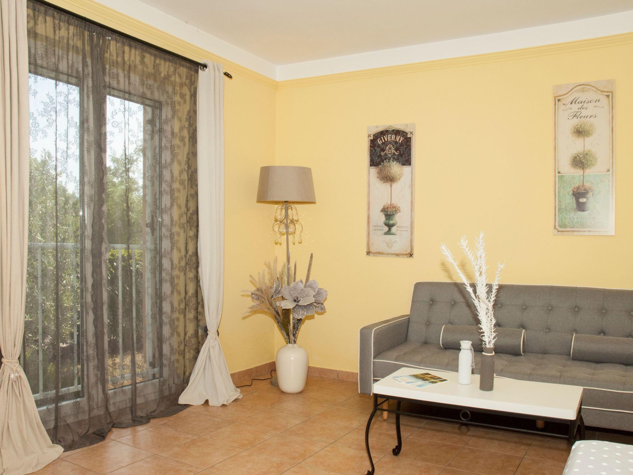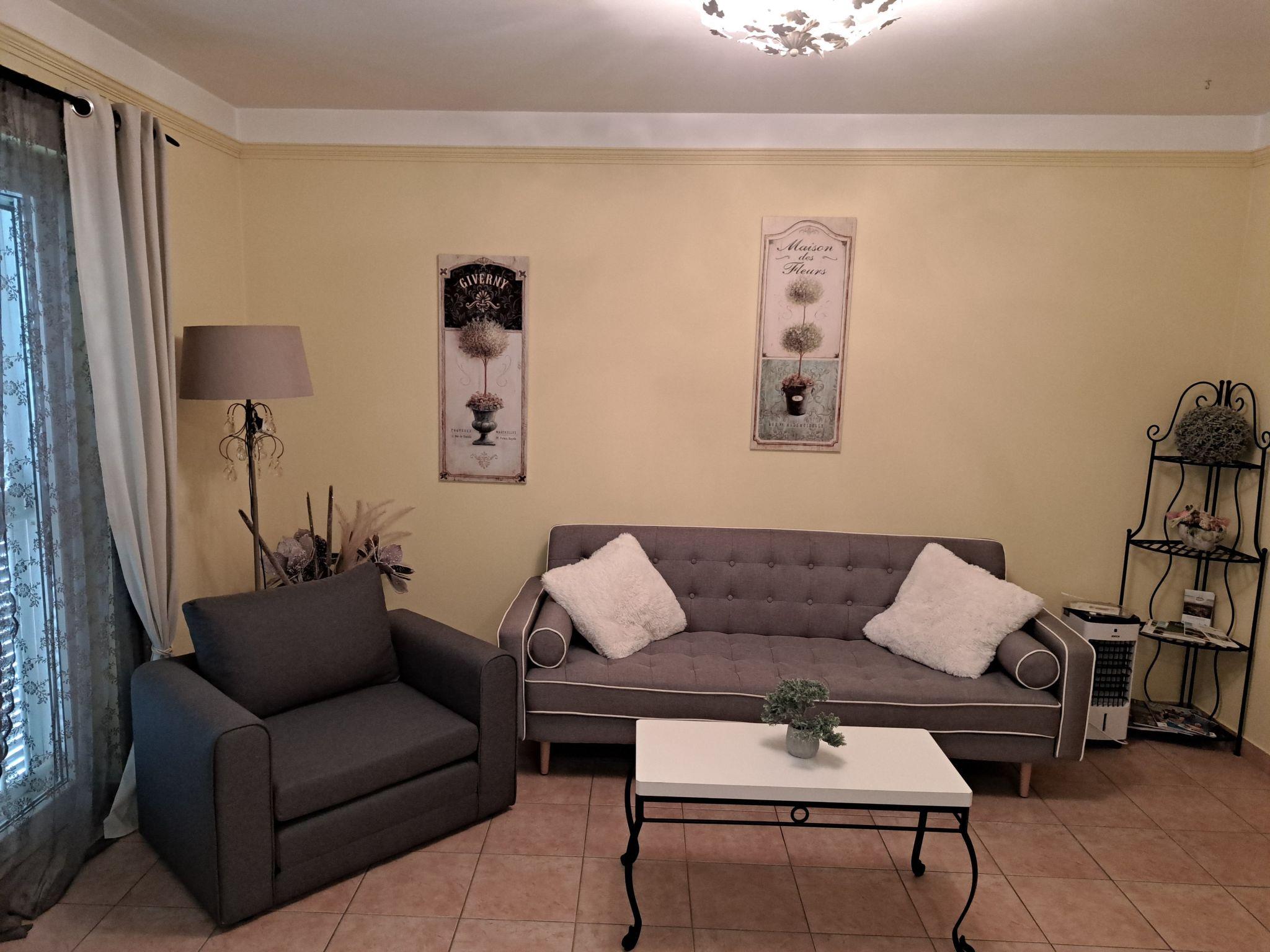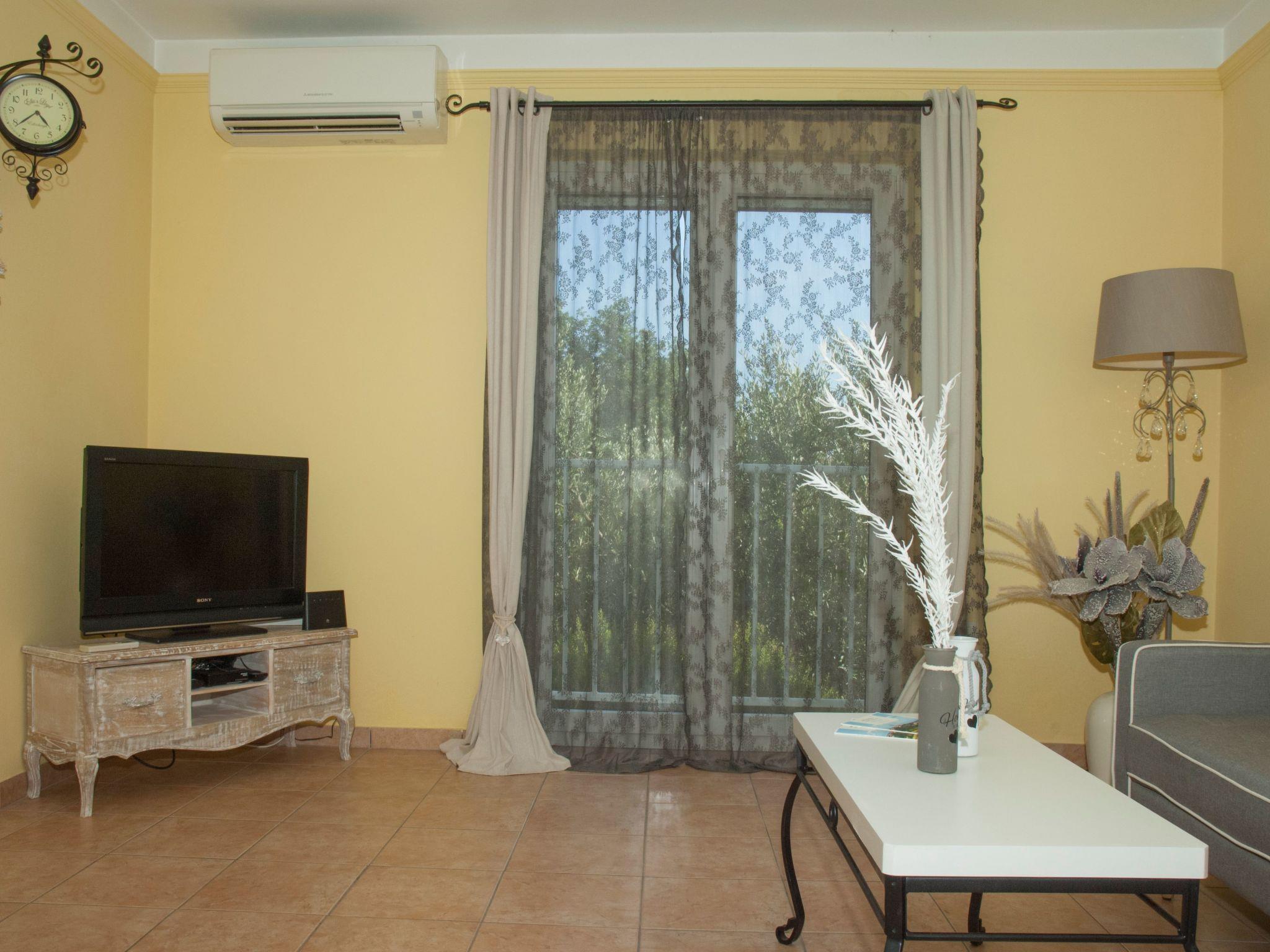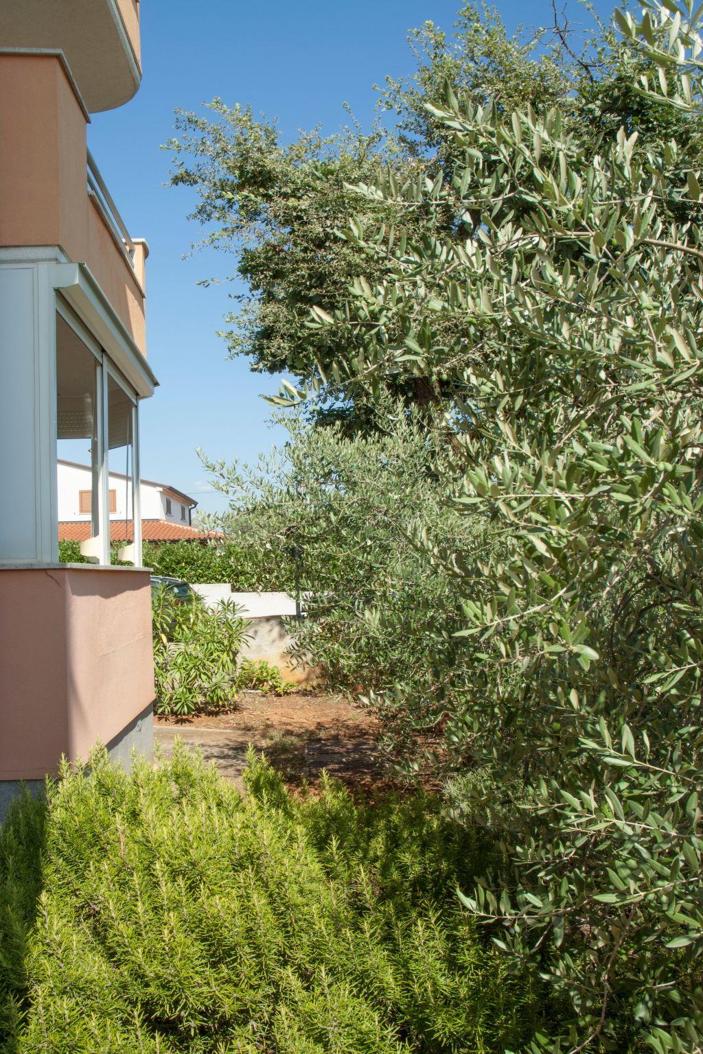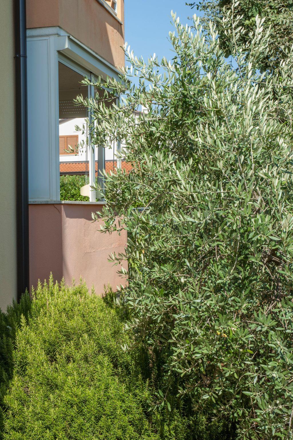 Umgeben von Olivenbäumen, Garten und Parkplatz neben dem Balkon.