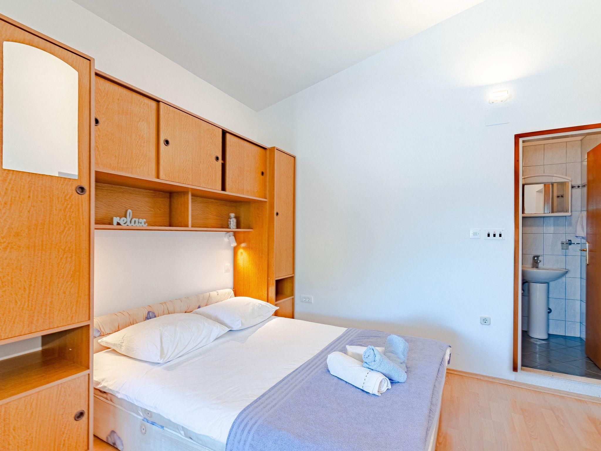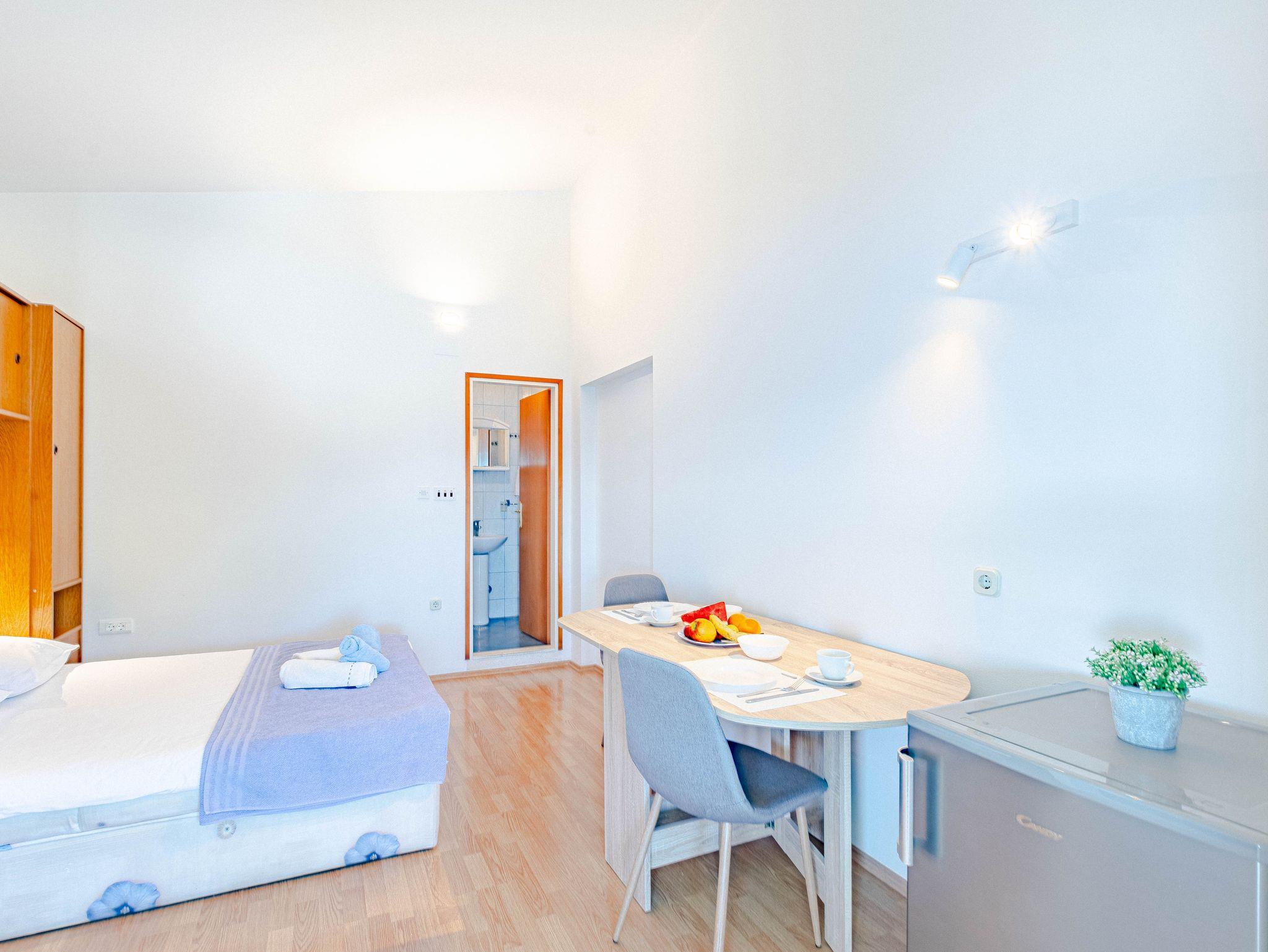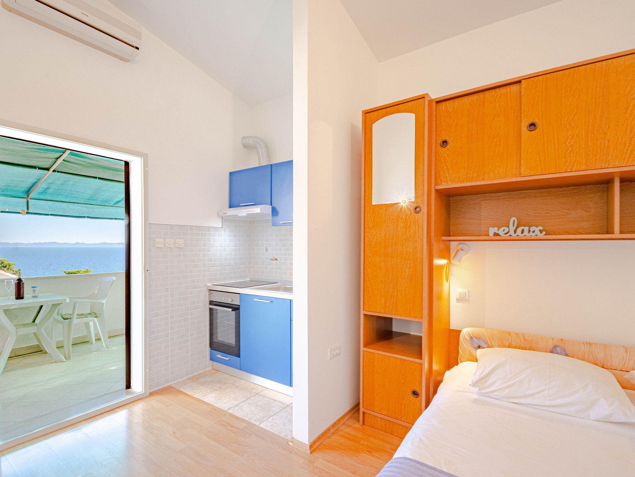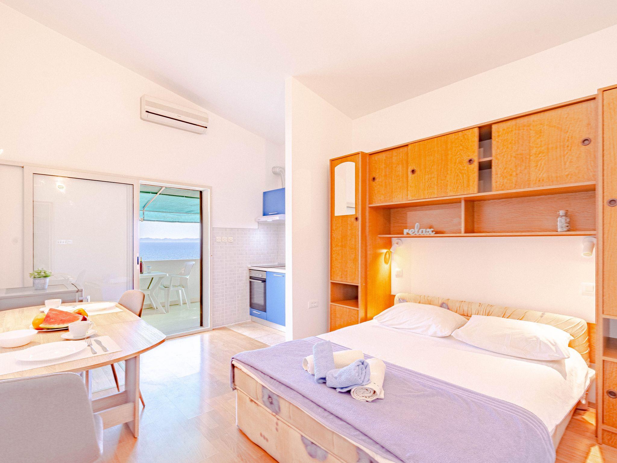 Studio bietet Platz für 2 Gäste. Die Betten sind in Schlafzimmern, die es 1 gibt, innerhalb einer Gesamtfläche von 18m2, angeordnet. Die Gäste haben eine eigene Terrasse zur Verfügung, auf der sie in warmen Sommernächten genießen können. Das Studio-Apartment bietet Meerblick. Es ist erlaubt, Speisen auf dem Gemeinschafts-Grill vorzubereiten. IM PREIS INBEGRIFFEN: Kurtaxe, Endreinigung, Klimatisierung, Parkplatz, Internet. VERBINDLICHE ZUSÄTZLICHE KOSTEN: Aufzahlung für Kurzaufenthalte (prozentualer Zuschlag pro Nächtigungsanzahl: 30% - 1, 20% - 2, 10% - 3). Die Verfügbarkeit zusätzlicher Dienstleistungen in Ihrem reservierten Termin und die Preise derselben (falls nicht aufgeführt) müssen im Voraus überprüft werden. Zusätzliche Dienstleistungen die in der Zahlungsaufforderung nicht aufgeführt sind werden direkt beim Vermieter bezahlt, angenommen der Gast nutzt auch diese. Ermäßigung auf den Grundpreis: Gratistag 14=13 (bei einem Aufenthalt von 14 Tagen oder mehr erhalten Sie einen Gratistag für den Aufenthalt bis 31.12.26).