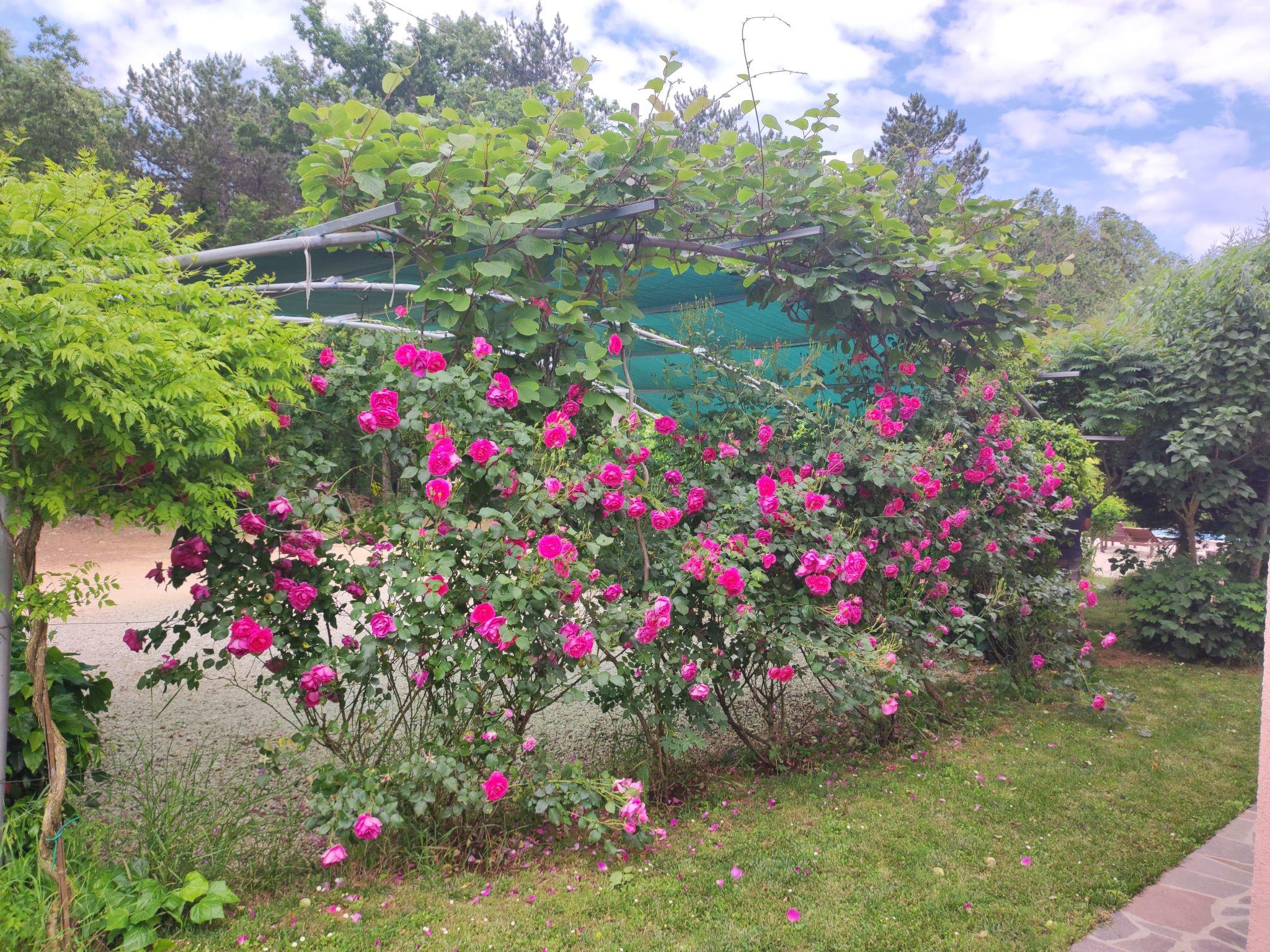 Der Garten von 1000 m2 enthält einen Außenpool von 50 m2 mit Liegewiese, Grill, Parkplatz mit 3 überdachten Stellplätzen grasbewachsenen Garten mit verschiedenen Obstbäumen, grünen Bambuszaun, aromatische Kräuter: Rosmarin, Lavendel, Minze, Salbei und Strohblume und viele Ecken für Kinder spielen.