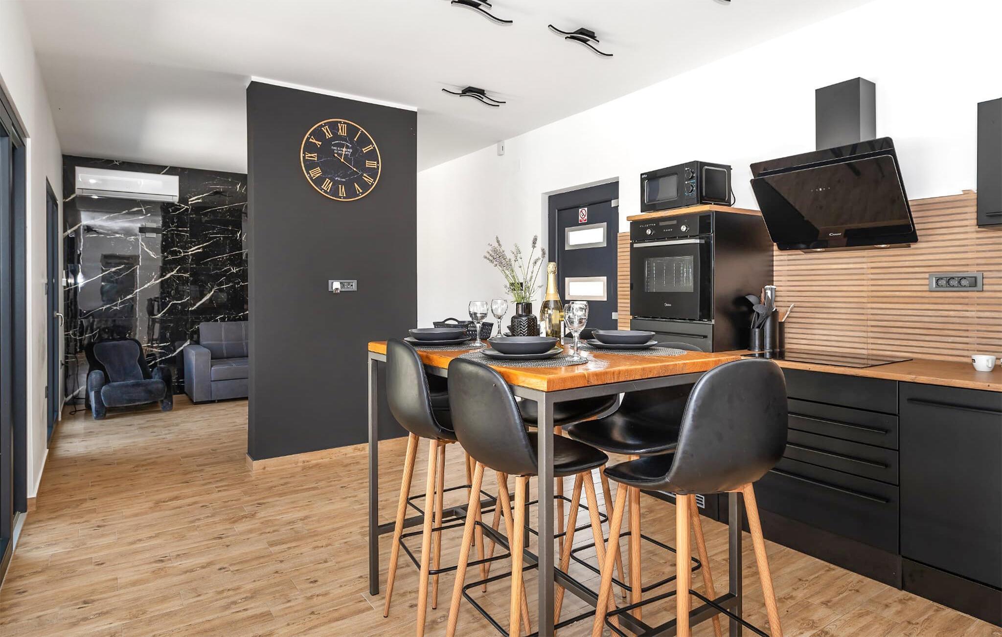 In diesem modernen und komfortablen Haus fühlen sich alle Familienmitglieder vom ersten Tag an wohl. Entspannen Sie in den gemütlichen Räumen, denen die moderne Einrichtung in dezenten Farben einen eleganten Ausdruck verleiht. Das Wohnzimmer wird schnell zum Zentrum der gemeinsamen Aktivitäten. Nach einem erlebnisreichen Tag können Sie es sich hier mit einem Film gemütlich machen.