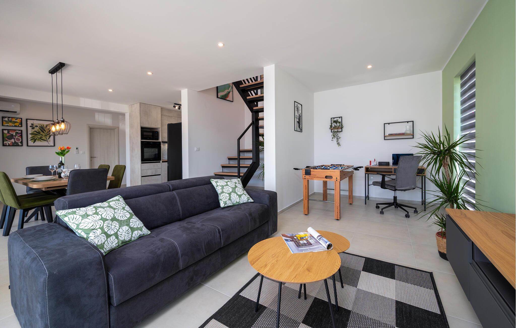 Reisen Sie mit Ihrer Familie an und freuen sich auf einen tollen Urlaub in diesem schönen Haus. Auf zwei Etagen verteilen sich geschmackvoll eingerichtete Räume, die für Sie eine einladende und warme Atmosphäre schaffen. Genießen Sie gemütliche Stunden im Wohnzimmer oder auf der Veranda, während die Abendsonne das Haus in ein sanftes Licht taucht. Der Swimmingpool lädt zum Abkühlen ein, und am Abend wird der Grill zur zentralen Anlaufstelle für gemeinsame Mahlzeiten. Spaß und Unterhaltung bieten Tischfußball und der großzügige Balkon mit Blick aufs Meer.
