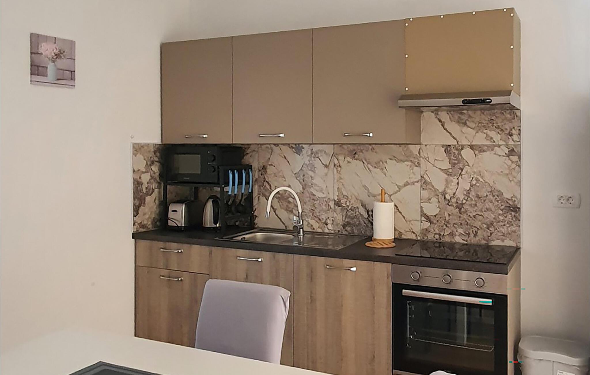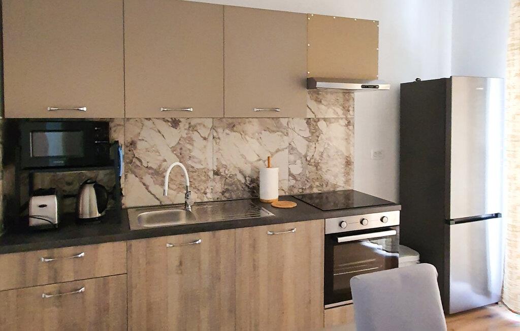 Nutzen Sie die praktische Küchenzeile, um kleine Urlaubsgerichte zuzubereiten. Nehmen Sie am angrenzenden Esstisch Platz und genießen Sie gemeinsame Mahlzeiten in angenehmer Atmosphäre. Helle Farben, geschmackvolle Details und eine funktionale Einrichtung sorgen für Wohlbefinden während Ihres Aufenthalts.