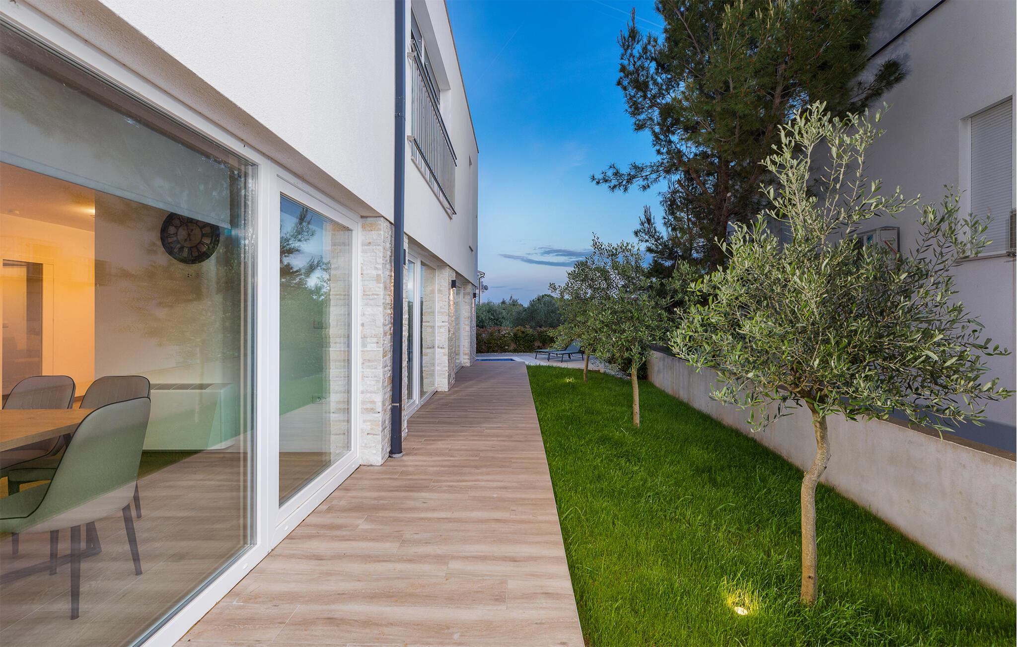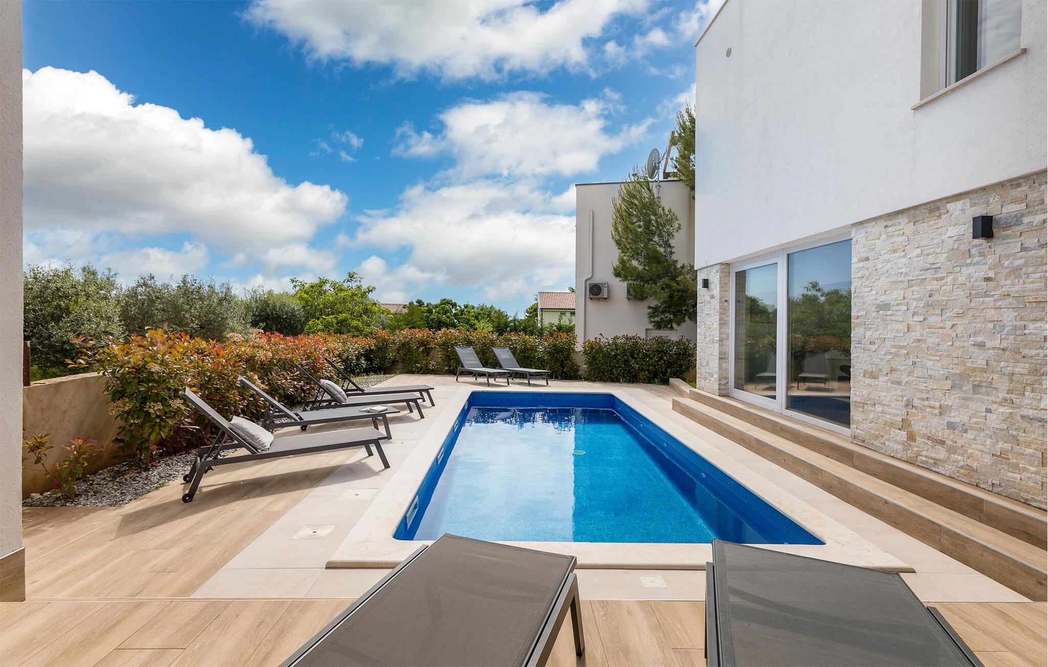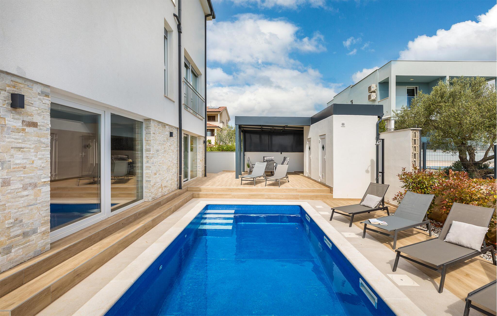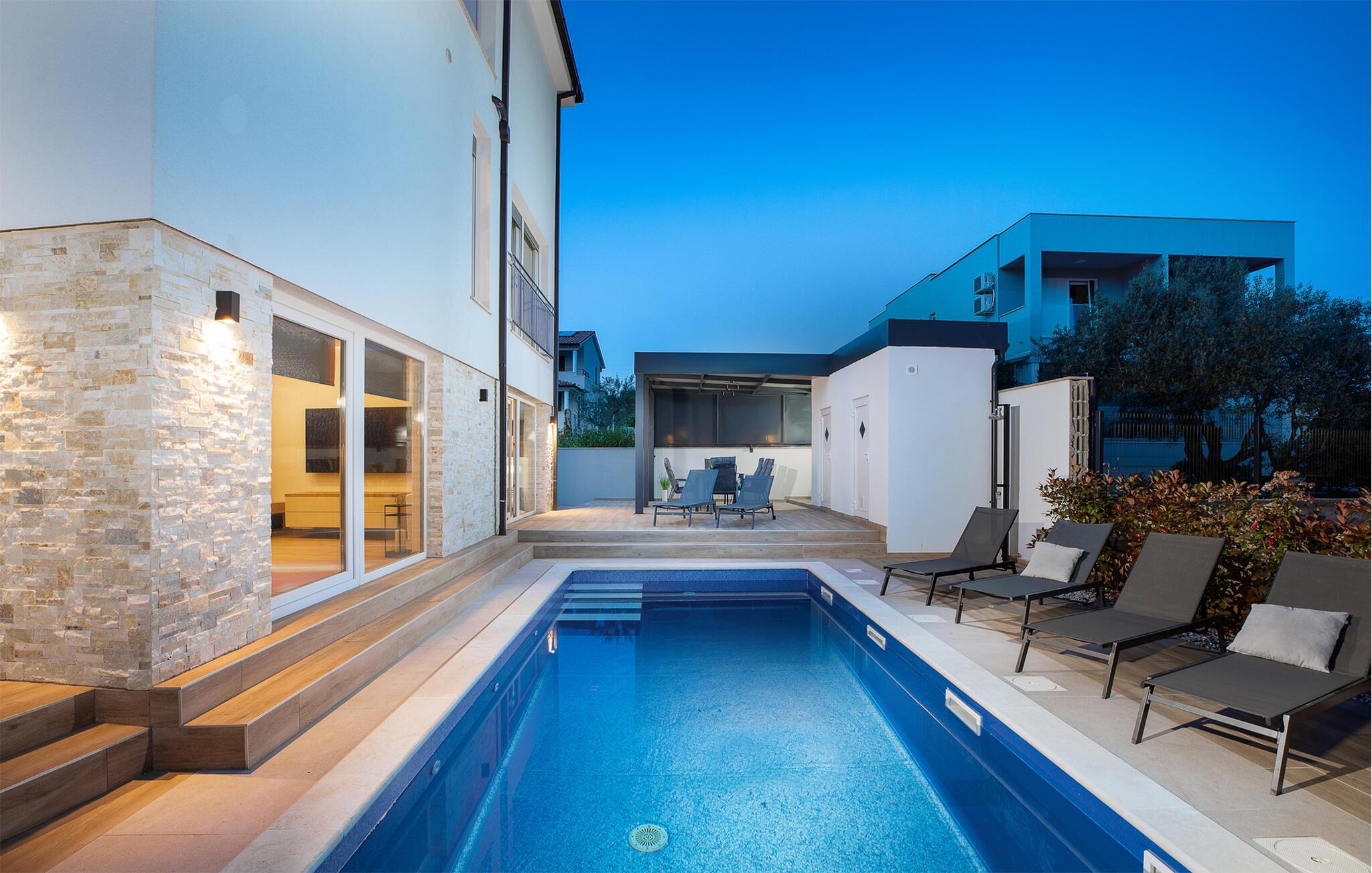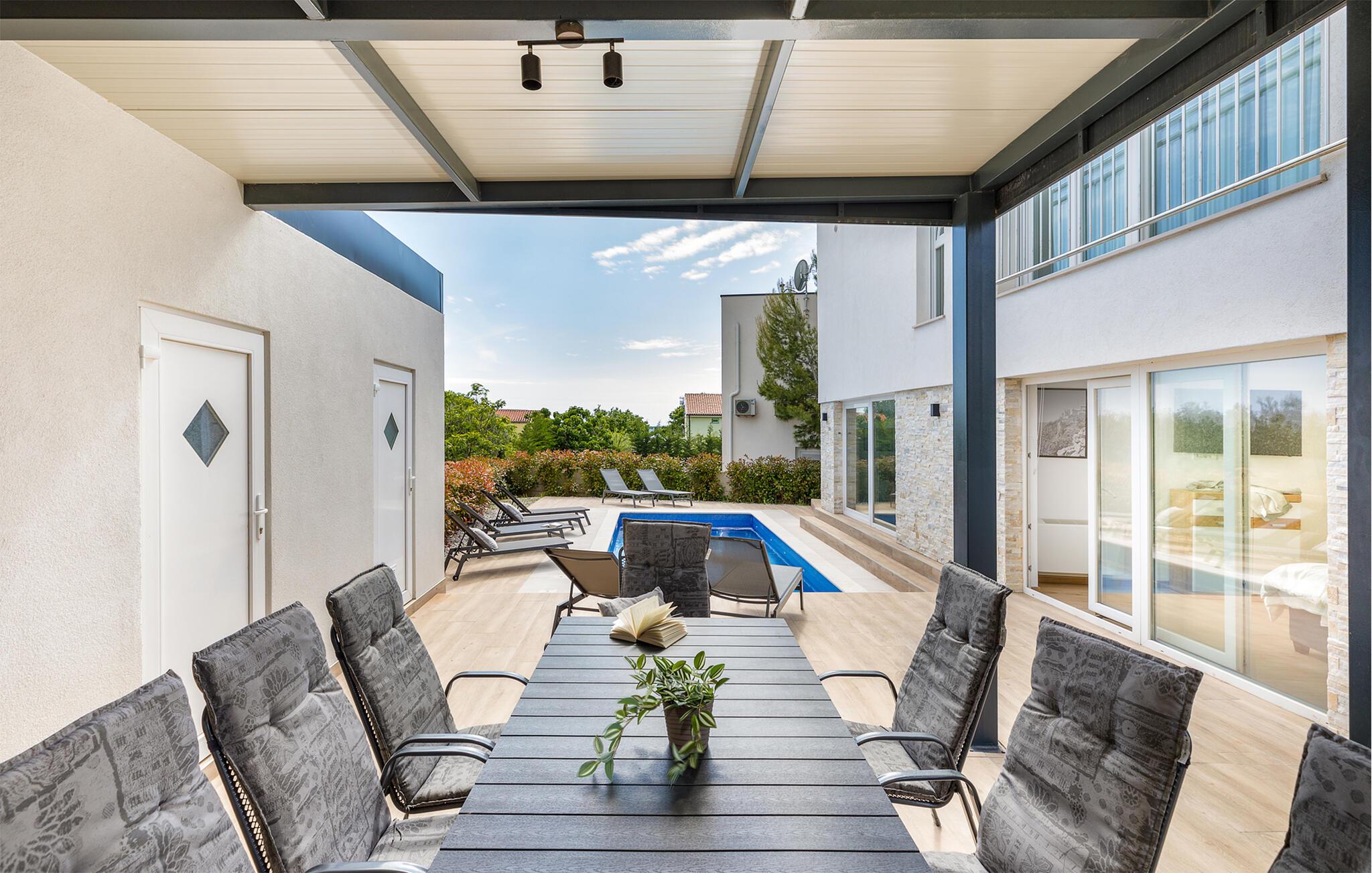 Ihr modernes und luxuriöses Ferienhaus bietet einen beeindruckenden Außenbereich. Hier können Sie die sonnigen Tage und lauen Abende in vollen Zügen genießen. Der großzügige Poolbereich lädt zum Schwimmen und Entspannen ein. Lehnen Sie sich auf den bequemen Liegestühlen zurück und lassen Sie die Seele baumeln. Genießen Sie Ihre Mahlzeiten im überdachten Essbereich im Freien und lassen Sie sich von der frischen Luft und der schönen Umgebung inspirieren. Bewundern Sie den atemberaubenden Blick von der Terrasse aus. Die gemütlichen Sitzgelegenheiten bieten Ihnen den idealen Ort, um den Sonnenuntergang zu beobachten und den Tag entspannt ausklingen zu lassen. Nutzen Sie die verschiedenen Terrassenbereiche, um sich zurückzuziehen und die Ruhe zu genießen.