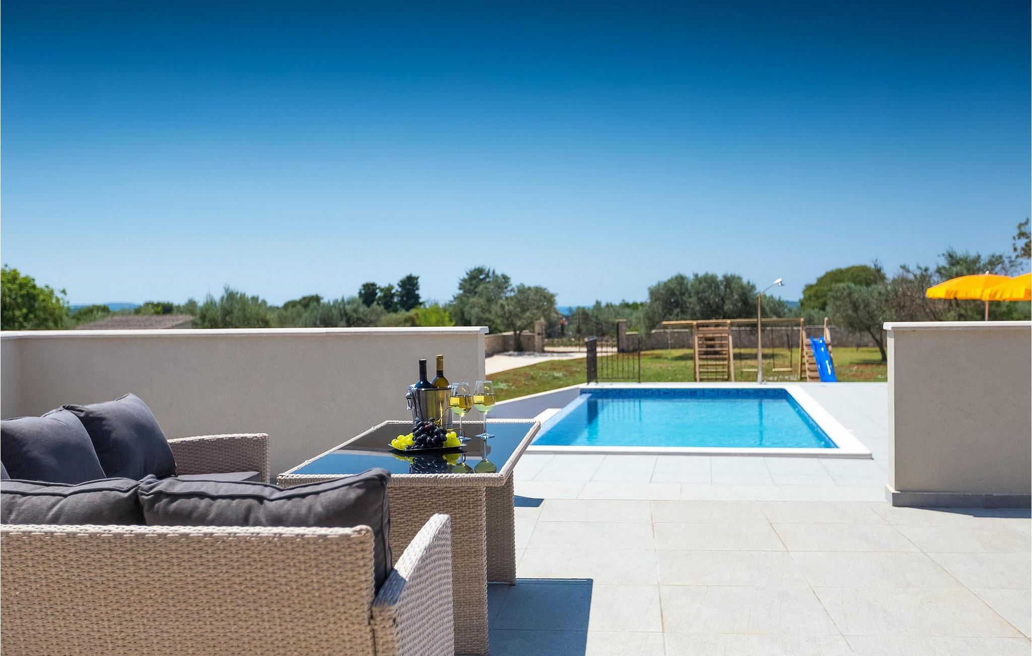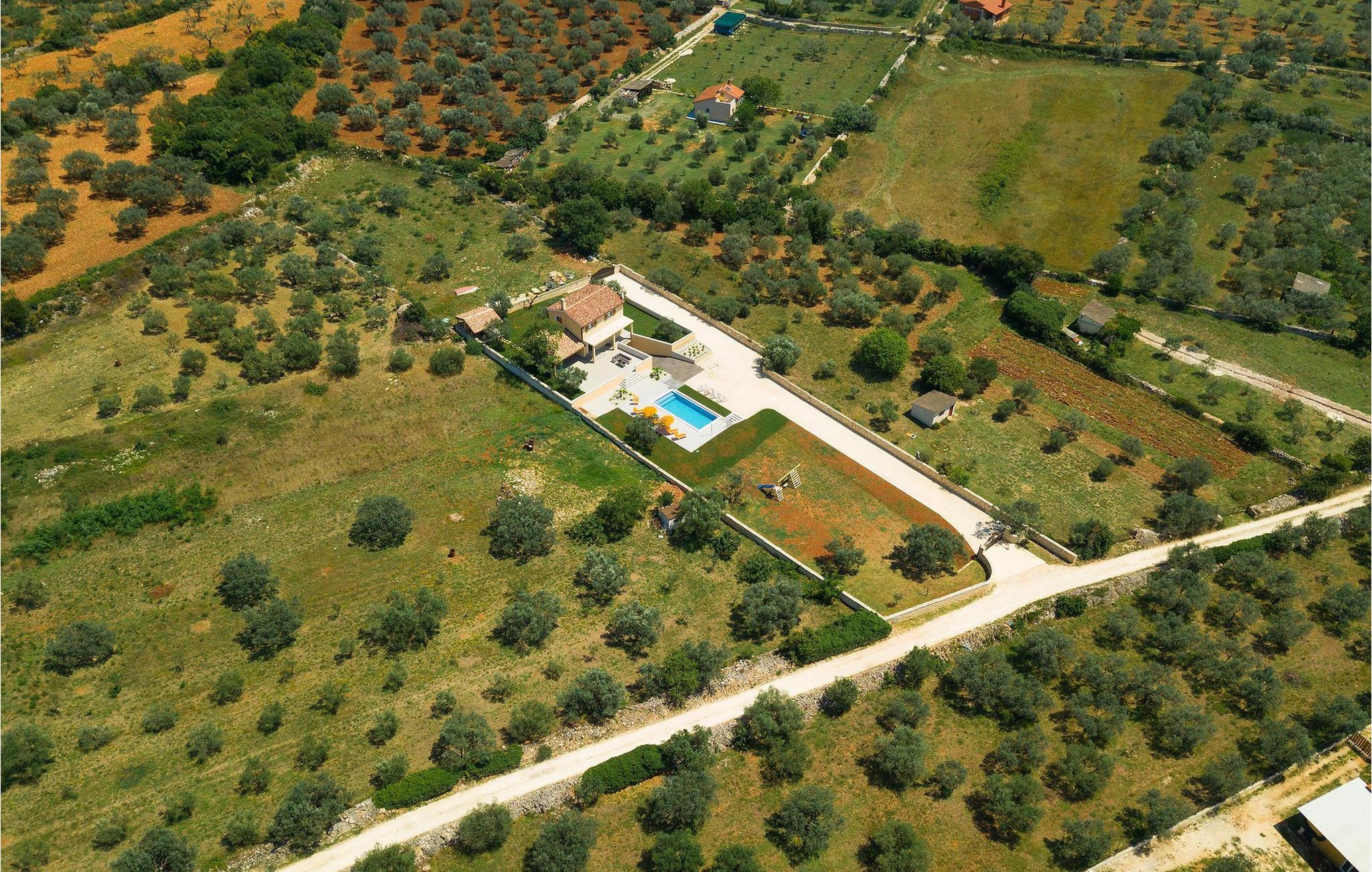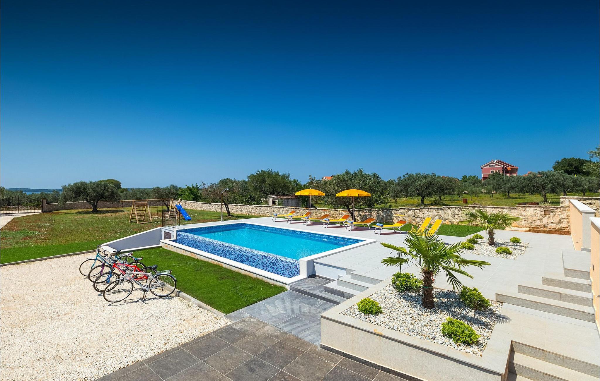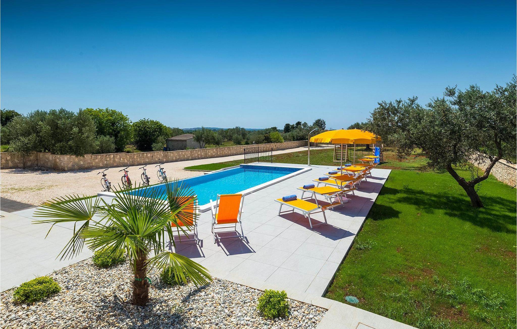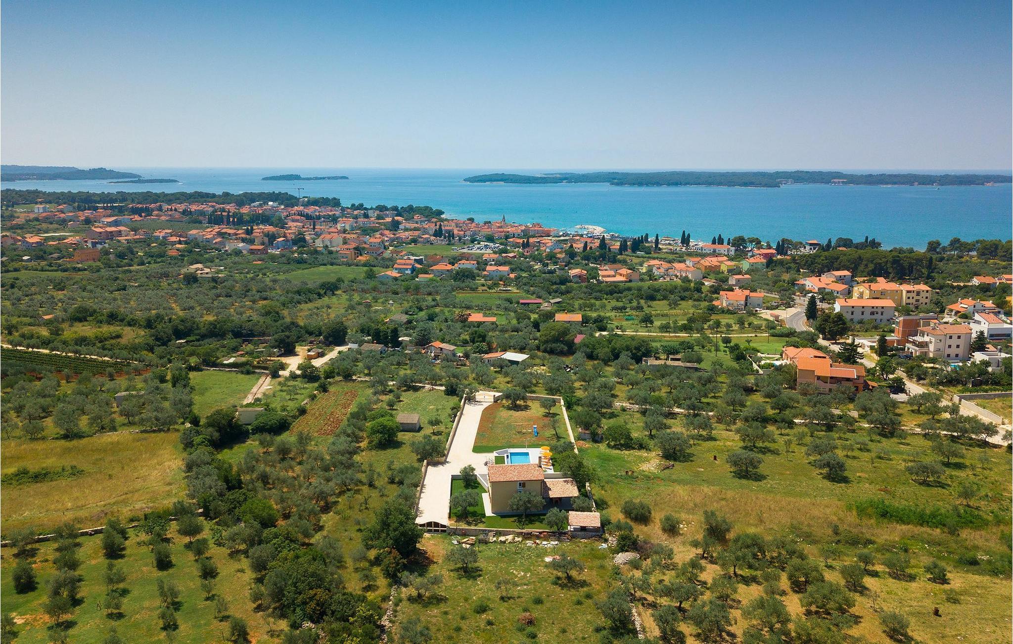 Diese wunderschöne Villa befindet sich in der ländlichen Umgebung von Pula, mit Blick auf die herrliche Adria und die Brioni Inseln, einem der Nationalparks Kroatiens. Die Villa ist für bis zu sechs Personen geeignet, da sie aus drei Schlafzimmern besteht. Zwei Schlafzimmer verfügen über ein Doppelbett, und ein über zwei Einzelbetten. Alle Schlafzimmer befinden sich im Obergeschoss der Villa. Im Erdgeschoss finden Sie ein großes Wohnzimmer mit gemütlichen Sofas, einem Essbereich mit Kamin und einer völlig ausgestatteten Küche. Genießen Sie Ihre Mahlzeiten vom Gasgrill im Schatten der überdachten Terrasse, mit Blick auf den Poolbereich. Die Villa befindet sich auf einem 2300 m2 großen Grundstück, ist komplett umzäunt und bietet drei private Parkplätze. Entspannen Sie sich auf den Liegestühlen neben dem schönen privaten Pool, wahrend die Kleinsten auf den Schaukeln und der Rutsche Spaß haben. Um die Umgebung zu erkunden, stehen Ihnen vier Fahrräder zur Verfügung. Villa Felice bietet alles für einen angenehmen Familienurlaub, nah zum Meer und allen notwendigen Annehmlichkeiten. Die Villa ist klimatisiert und verfügt über wifi. Beachten Sie bitte: Jugendgruppen sind nicht erlaubt.