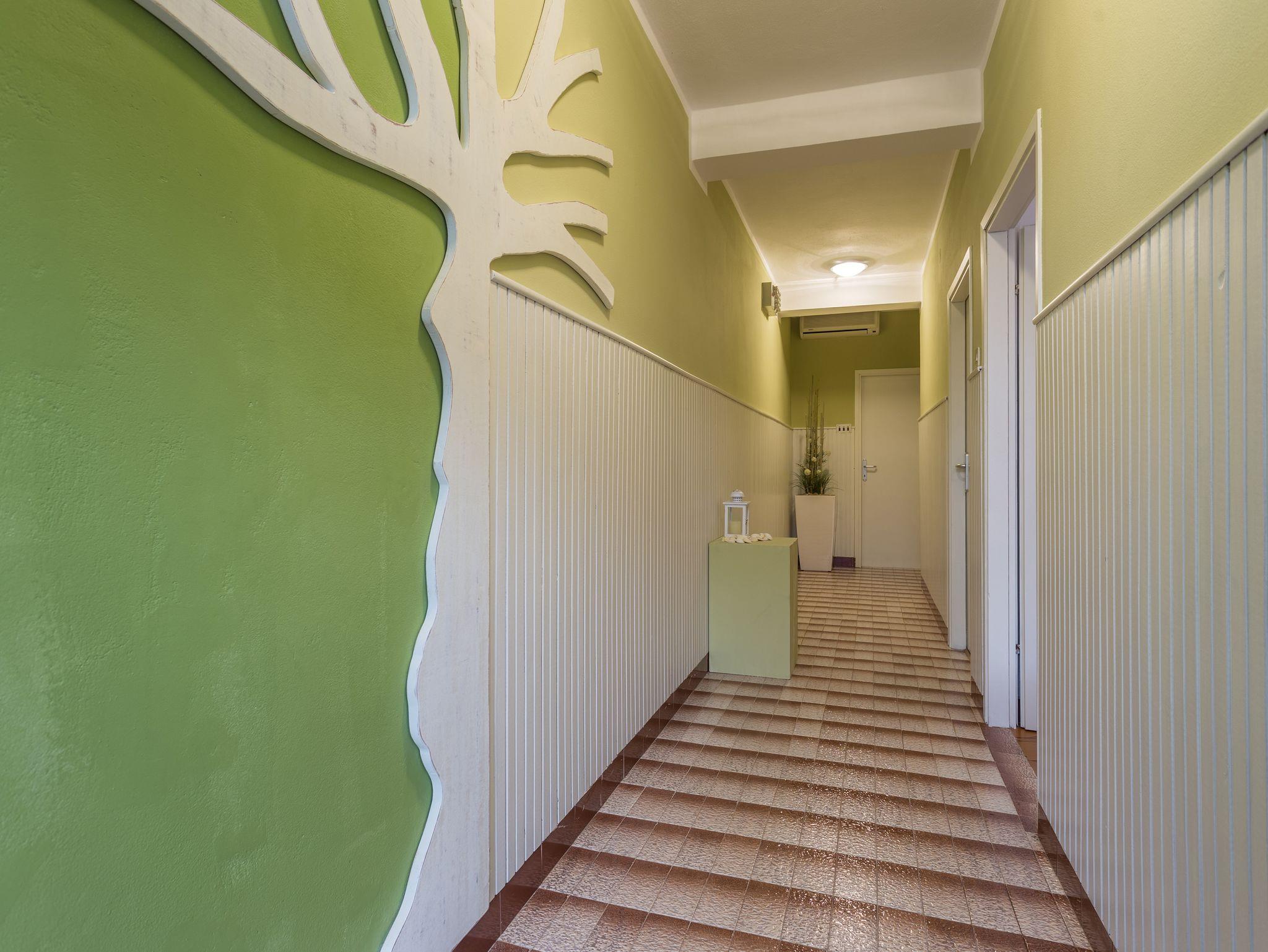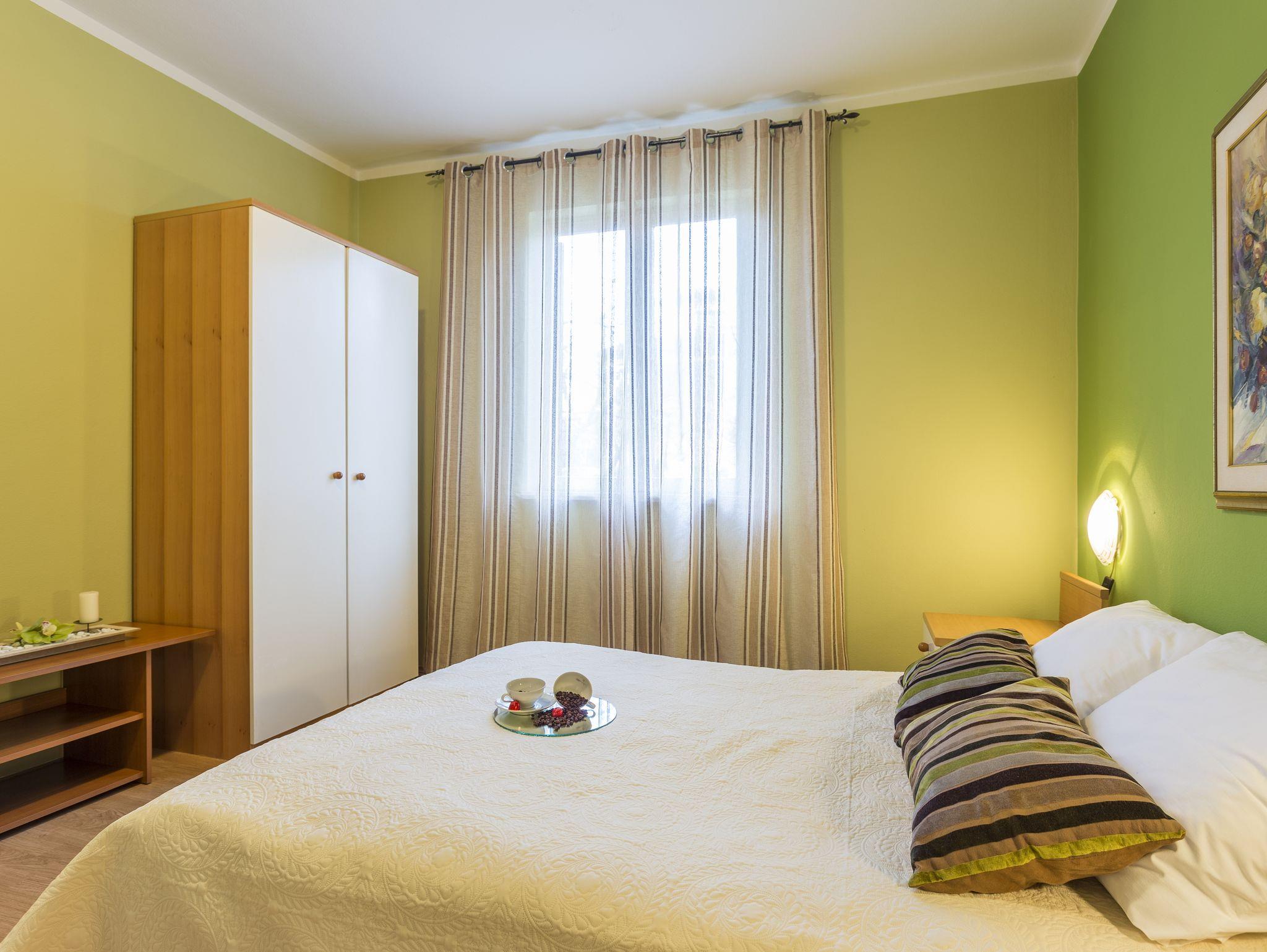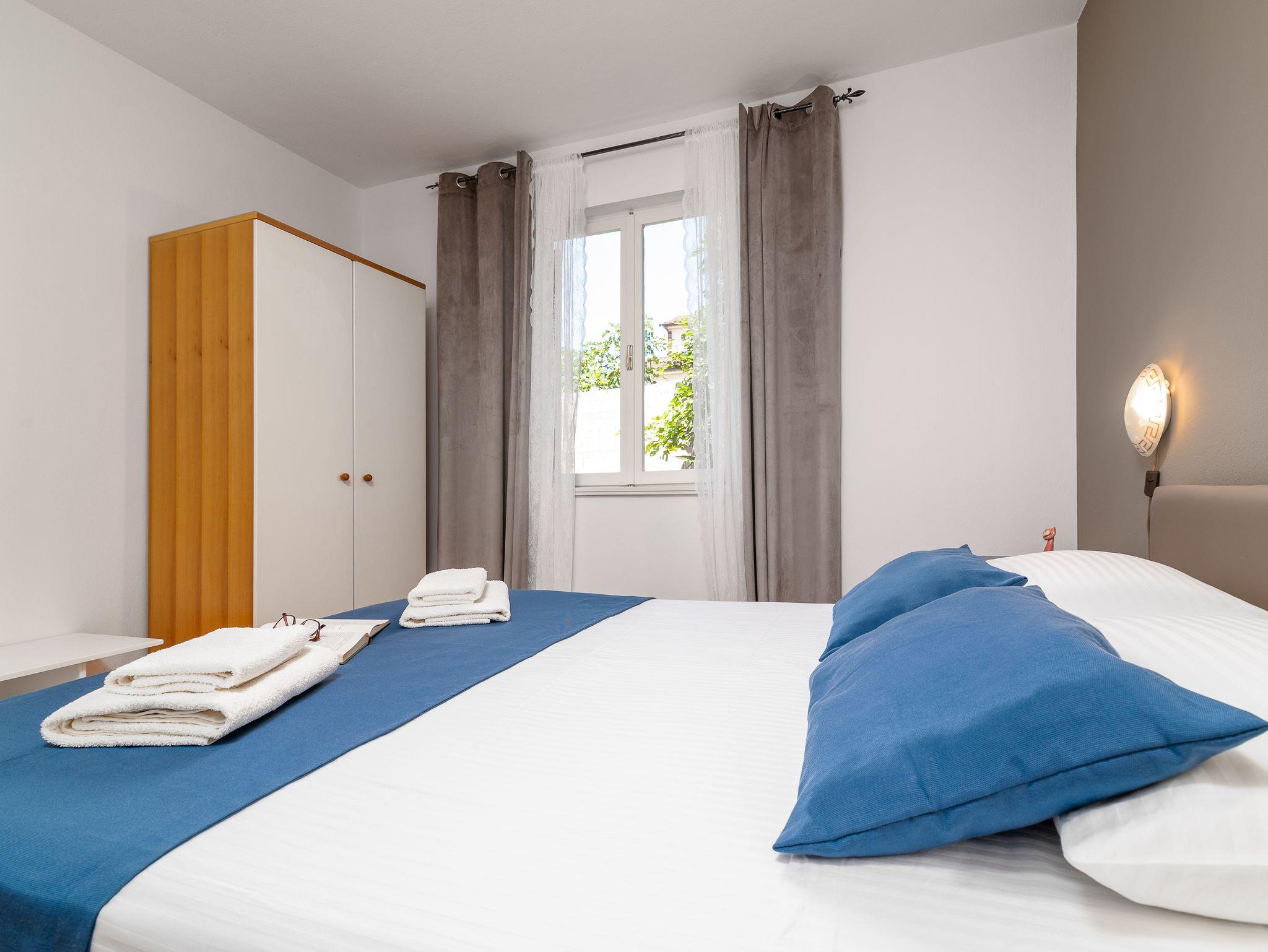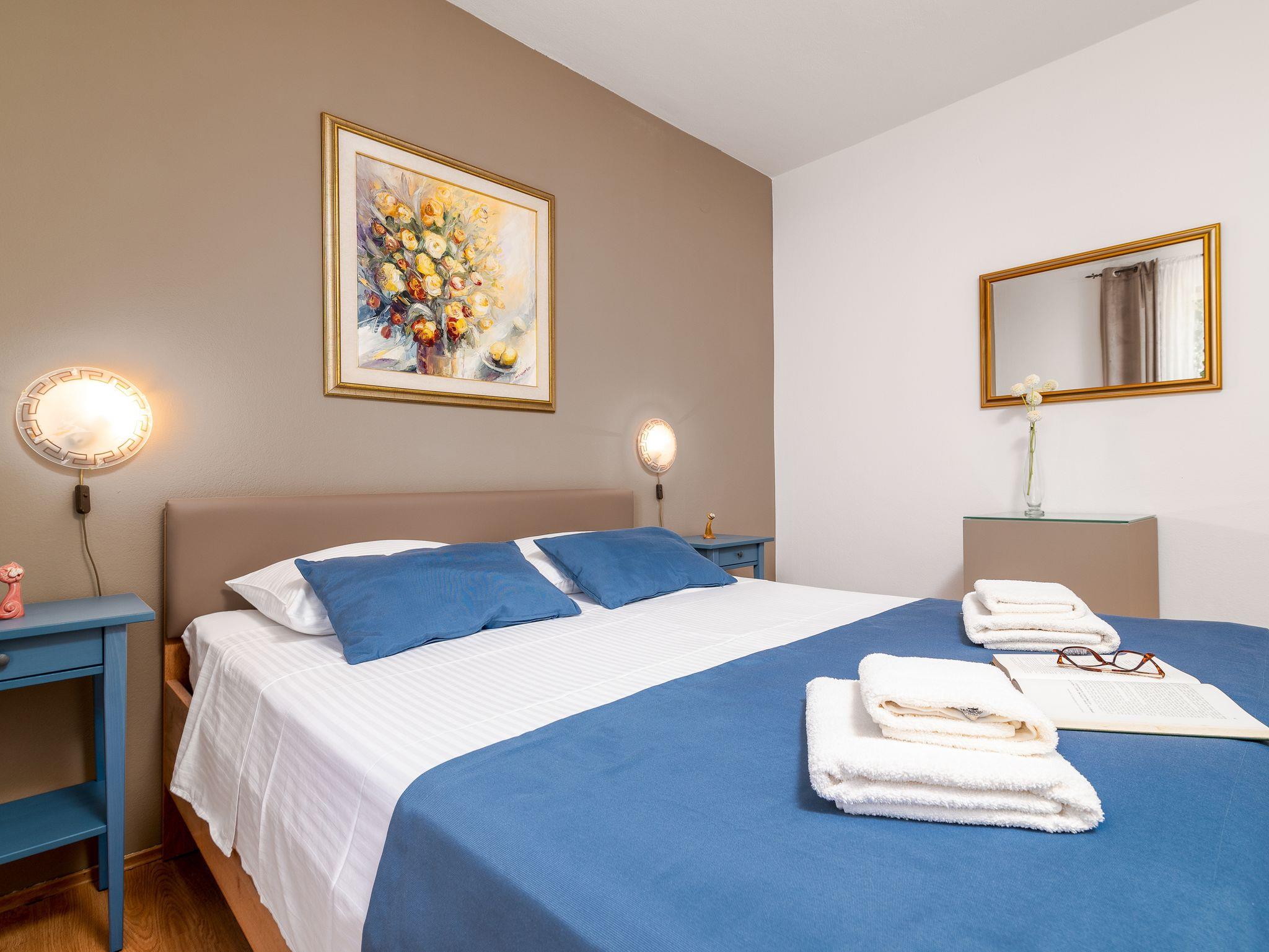 Ferienwohnung bietet Platz für 4 Gäste. Die Betten sind in Schlafzimmern, die es 2 gibt, innerhalb einer Gesamtfläche von 56m2, angeordnet. Die Gäste haben eine eigene Terrasse zur Verfügung, auf der sie in warmen Sommernächten genießen können. Es ist erlaubt, Speisen auf dem Gemeinschafts-Grill vorzubereiten. In der Unterkunftseinheit besteht die Möglichkeit des Mitbringens von Haustieren gegen Aufpreis. IM PREIS INBEGRIFFEN: Kurtaxe, Endreinigung, Klimatisierung, Parkplatz, Internet, Fahrrad, Kinderbett, Bügeleisen, Bügelbrett, Föhn, tragbarer Grill, Liegestühle. VERBINDLICHE ZUSÄTZLICHE KOSTEN: Aufzahlung für Kurzaufenthalte (prozentualer Zuschlag pro Nächtigungsanzahl: 30% - 1, 20% - 2, 10% - 3). UNVERBINDLICHE ZUSÄTZLICHE KOSTEN: Haustiere (5,00 € pro Nacht). Die Verfügbarkeit zusätzlicher Dienstleistungen in Ihrem reservierten Termin und die Preise derselben (falls nicht aufgeführt) müssen im Voraus überprüft werden. Zusätzliche Dienstleistungen die in der Zahlungsaufforderung nicht aufgeführt sind werden direkt beim Vermieter bezahlt, angenommen der Gast nutzt auch diese.