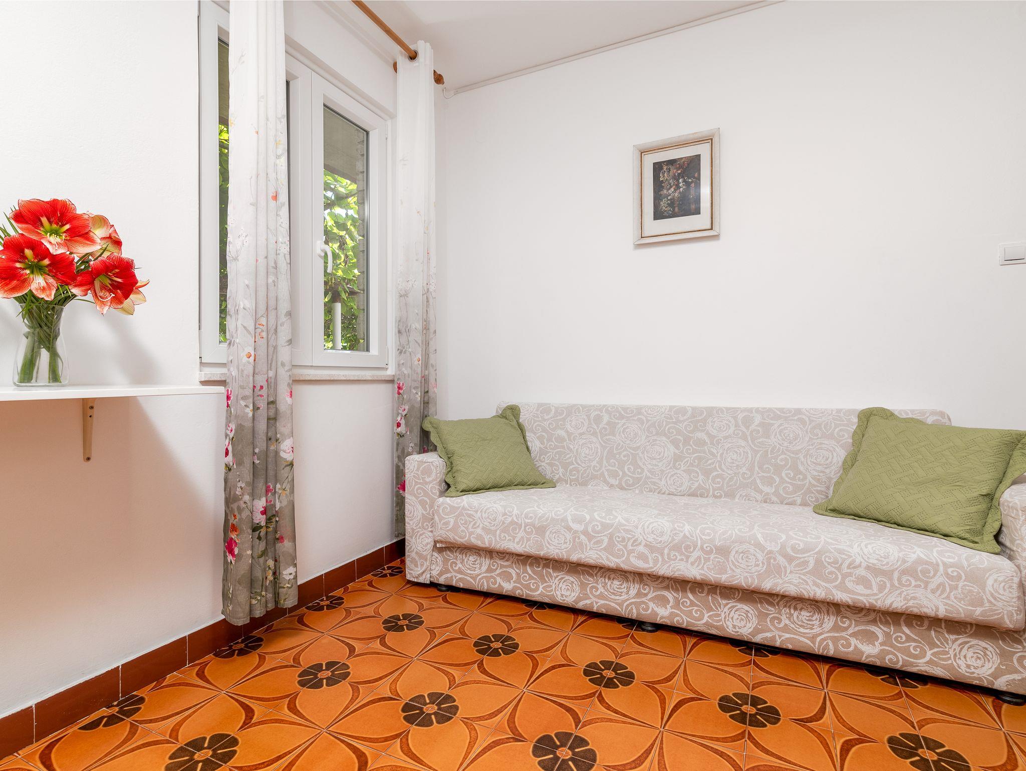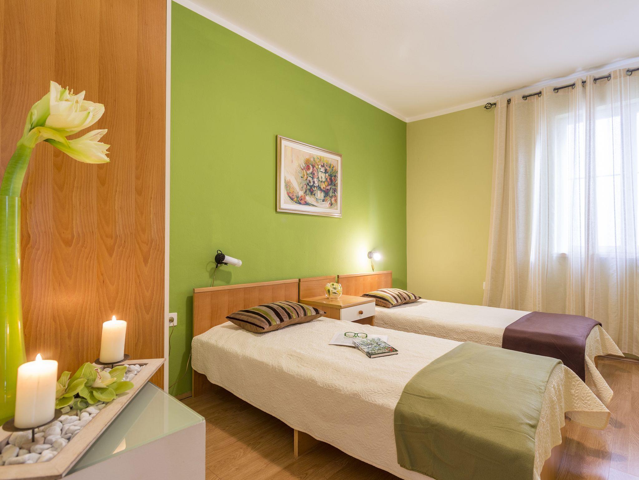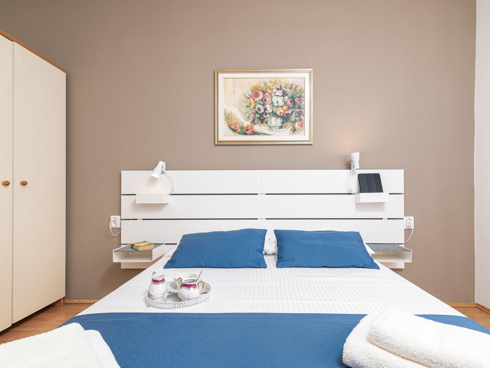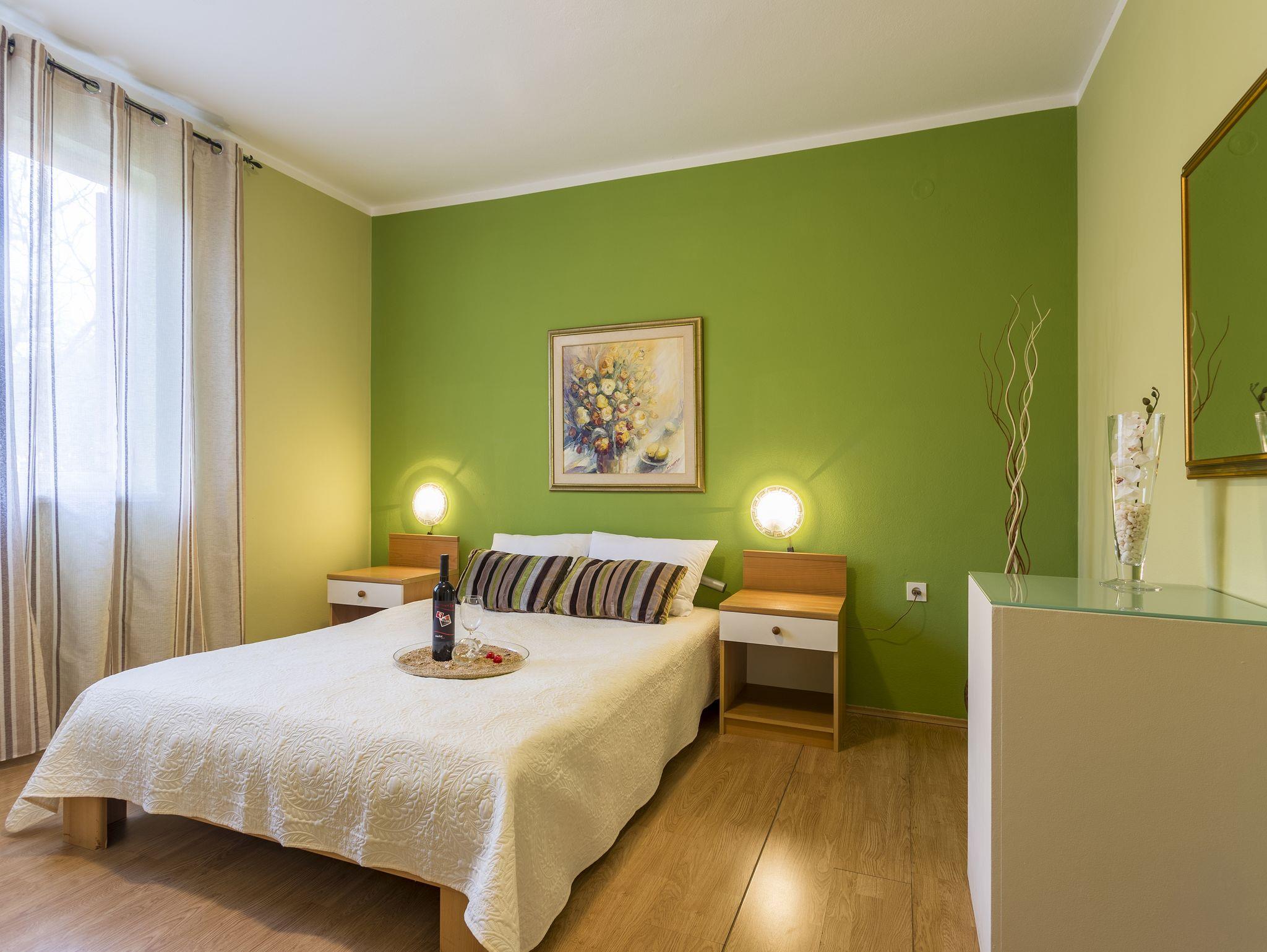 Ferienwohnung bietet Platz für 4 Gäste. Die Betten sind in Schlafzimmern, die es 2 gibt, innerhalb einer Gesamtfläche von 56m2, angeordnet. Die Gäste haben eine eigene Terrasse zur Verfügung, auf der sie in warmen Sommernächten genießen können. Es ist erlaubt, Speisen auf dem Gemeinschafts-Grill vorzubereiten. In der Unterkunftseinheit besteht die Möglichkeit des Mitbringens von Haustieren gegen Aufpreis. IM PREIS INBEGRIFFEN: Kurtaxe, Endreinigung, Klimatisierung, Parkplatz, Internet, Fahrrad, Kinderbett, Bügeleisen, Bügelbrett, Föhn, tragbarer Grill, Liegestühle. VERBINDLICHE ZUSÄTZLICHE KOSTEN: Aufzahlung für Kurzaufenthalte (prozentualer Zuschlag pro Nächtigungsanzahl: 30% - 1, 20% - 2, 10% - 3). UNVERBINDLICHE ZUSÄTZLICHE KOSTEN: Haustiere (5,00 € pro Nacht). Die Verfügbarkeit zusätzlicher Dienstleistungen in Ihrem reservierten Termin und die Preise derselben (falls nicht aufgeführt) müssen im Voraus überprüft werden. Zusätzliche Dienstleistungen die in der Zahlungsaufforderung nicht aufgeführt sind werden direkt beim Vermieter bezahlt, angenommen der Gast nutzt auch diese.