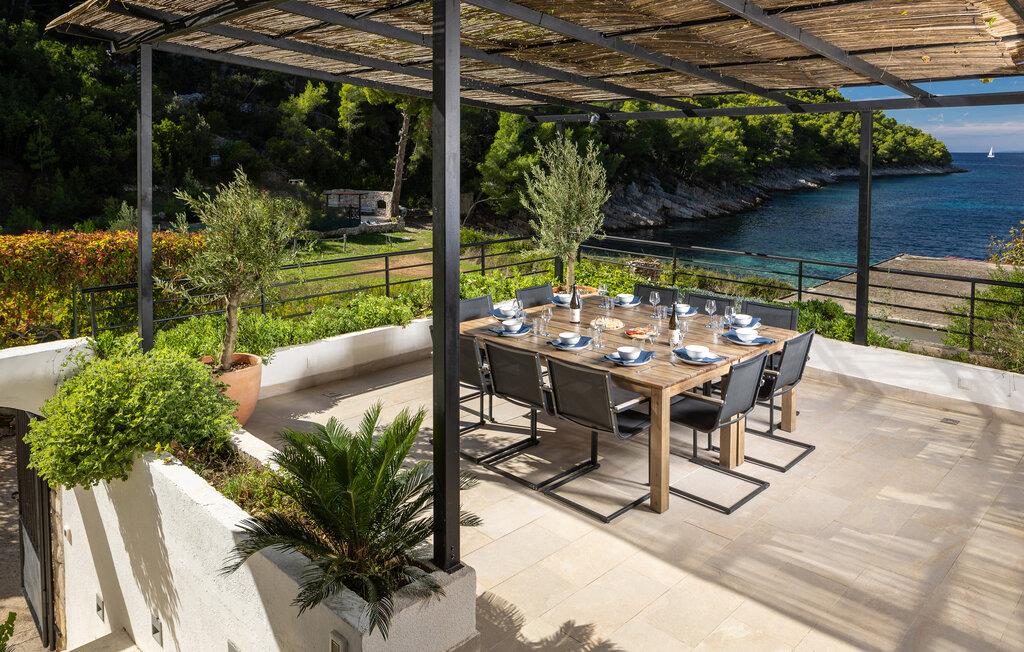 Entspannen Sie auf den Liegen auf dem Balkon, lesen Sie ein gutes Buch oder lassen einfach den Blick über die glitzernde Bucht schweifen. Auf der großzügigen Terrasse können Sie gemütlich im Schatten speisen und dabei den Blick auf das Meer und die Landschaft genießen. Versammeln Sie sich zu einem geselligen Abendessen mit Familie oder Freunden, während die Sonne langsam hinter den Bäumen versinkt. So erleben Sie den mediterranen Zauber Kroatiens in jeder Stunde des Tages.