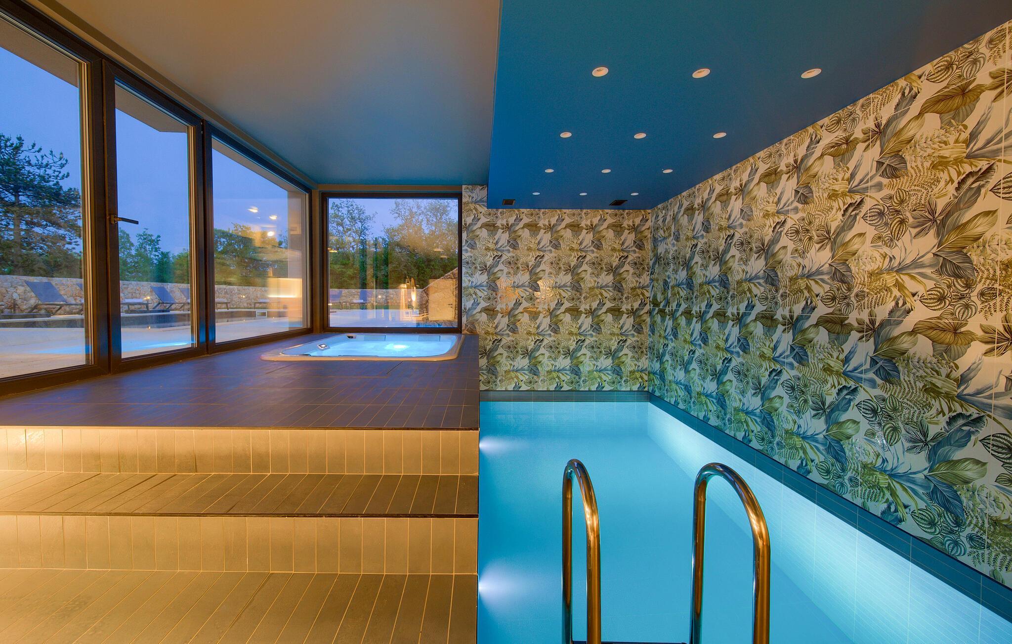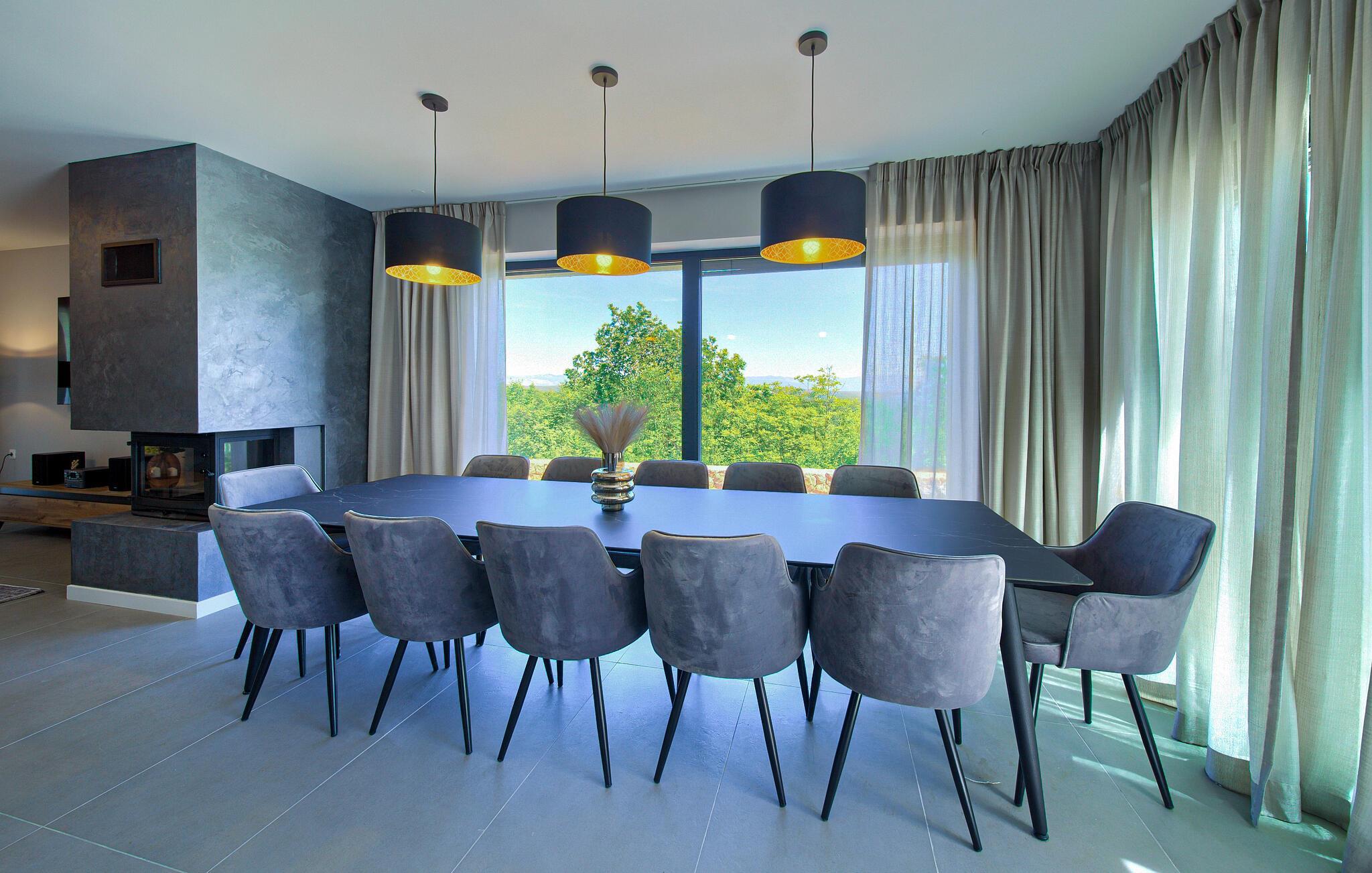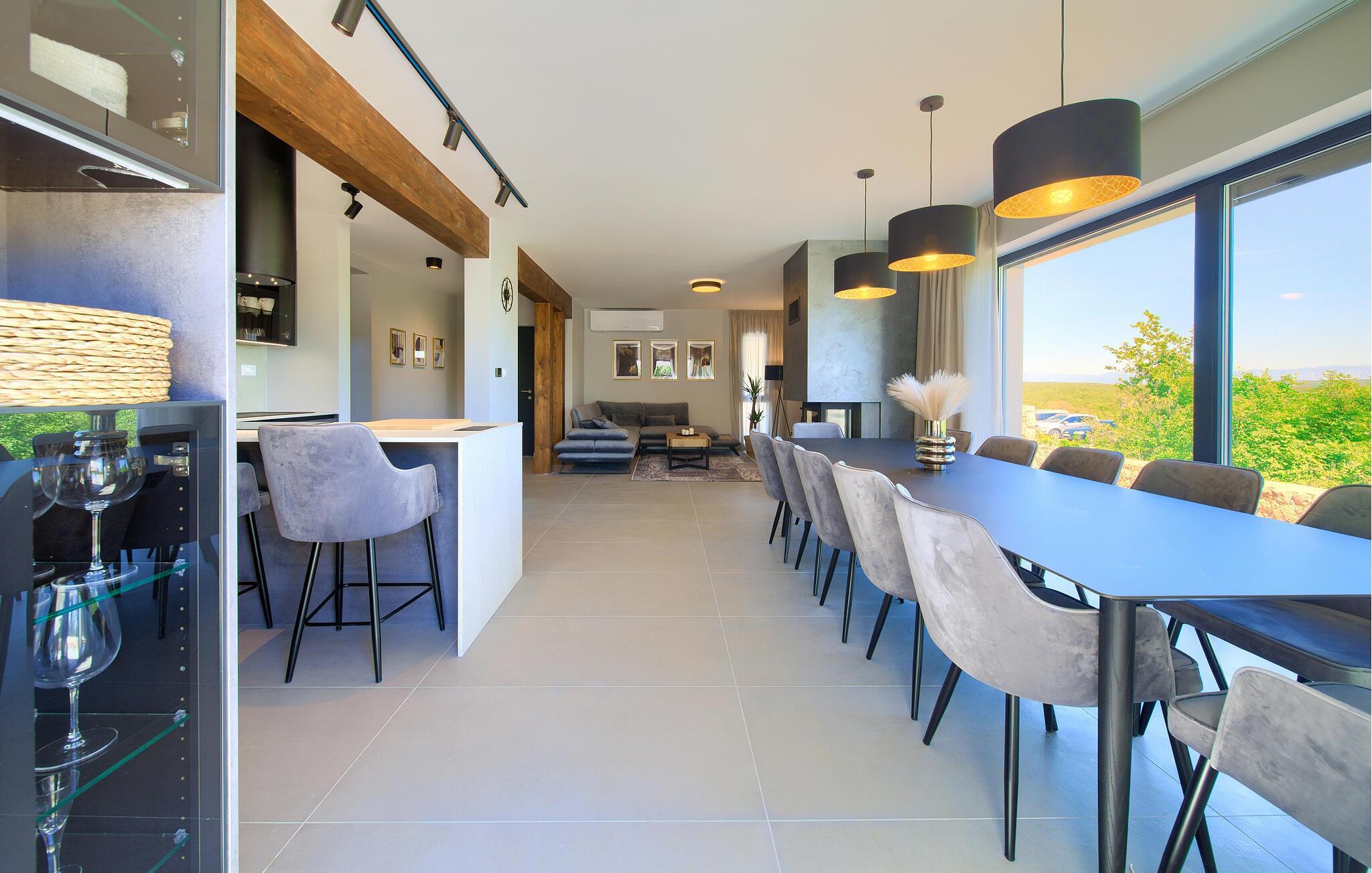 Erleben Sie diese exklusive Oase und lassen Sie den Alltag hinter sich. Ihre stilvolle Unterkunft bietet alles, was Sie für erholsame Tage in Ihrem Urlaubsort Vrh brauchen. Es erwarten Sie hier schöne Innen- und Außenbereiche, die mit modernem Design und hochwertiger Ausstattung bestechen. Starten Sie Ihren Tag mit einem entspannenden Bad im beheizten Innenpool oder verwöhnen Sie sich im Whirlpool. Nutzen Sie die Sauna, um Körper und Geist zu revitalisieren, und bleiben Sie aktiv im gut ausgestatteten Fitnessraum. Lassen Sie sich von der modernen, großzügigen Küche inspirieren und bereiten Sie Ihre Mahlzeiten in einem stilvollen Ambiente zu. Genießen Sie anschließend Ihre Speisen im geräumigen Essbereich, von dem aus Sie durch große Fenster den Blick in die grüne Umgebung schweifen lassen können.