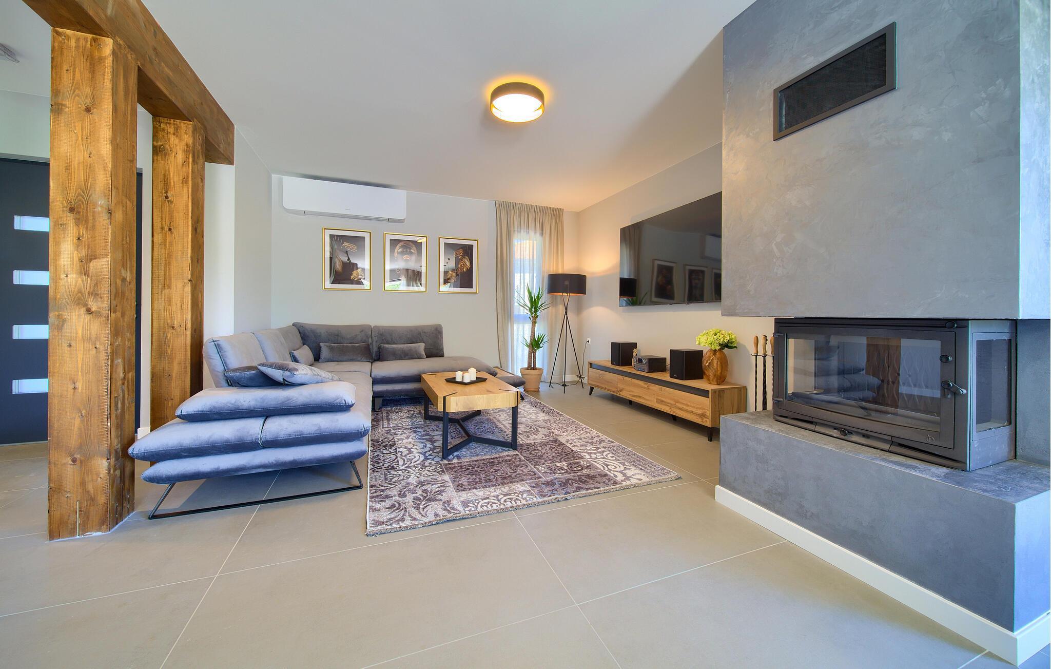 Entspannen Sie auf der großen Außenterrasse und verbringen Sie gesellige Abende am Grill. Die bequemen Sonnenliegen rund um den Außenpool laden zum Relaxen ein. Genießen Sie die Sonne und den klaren Himmel über Krk, während Ihre Kinder sich hüpfend auf dem Trampolin vergnügen. Im gemütlichen Wohnzimmer finden Sie alles für entspannte Stunden. Machen Sie es sich auf der komfortablen Couch vor dem modernen Kaminofen bequem und genießen Sie den Blick ins Freie.