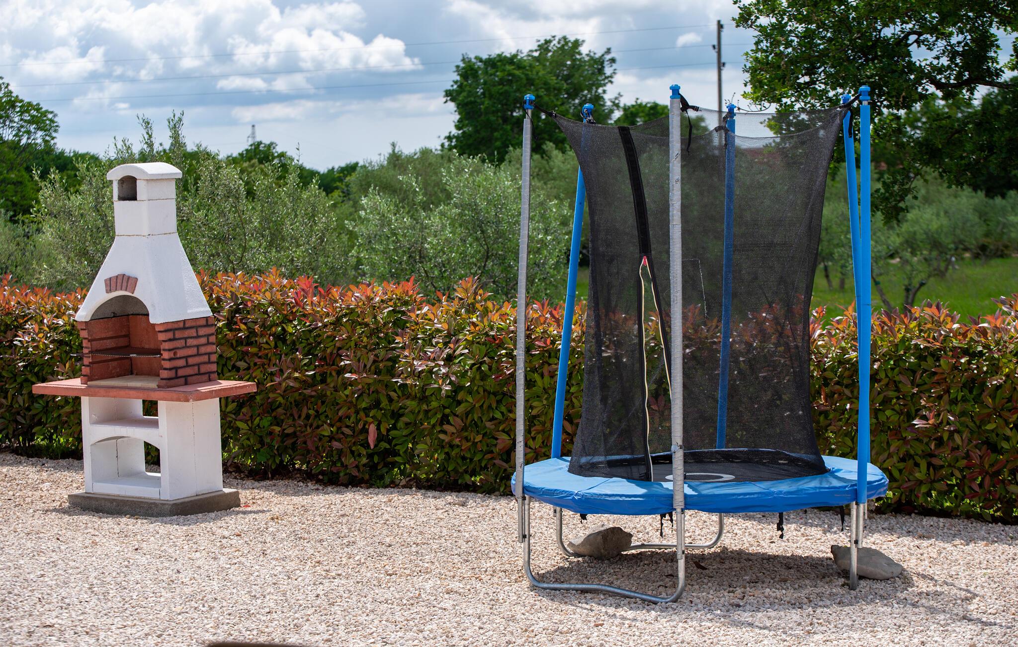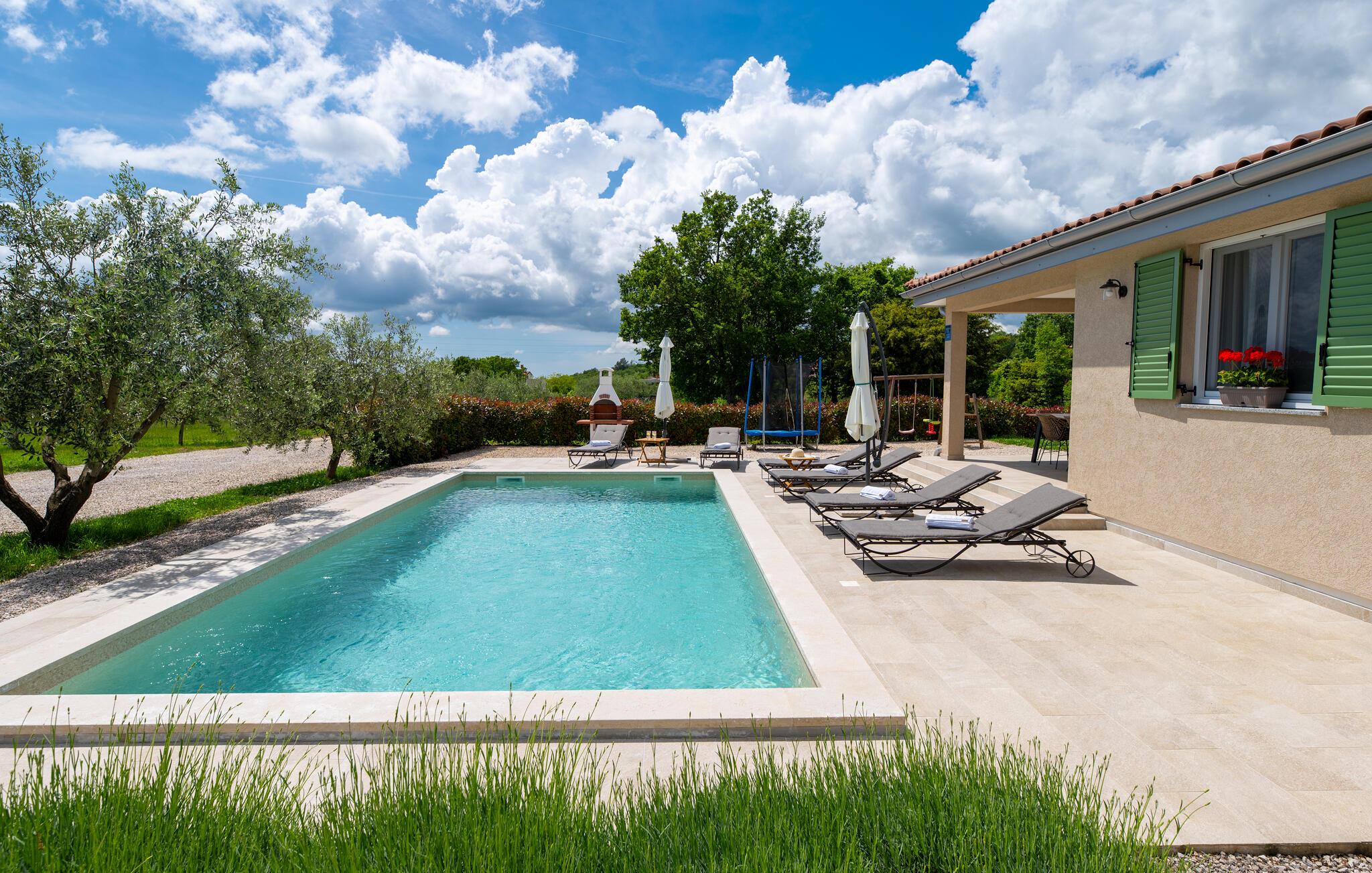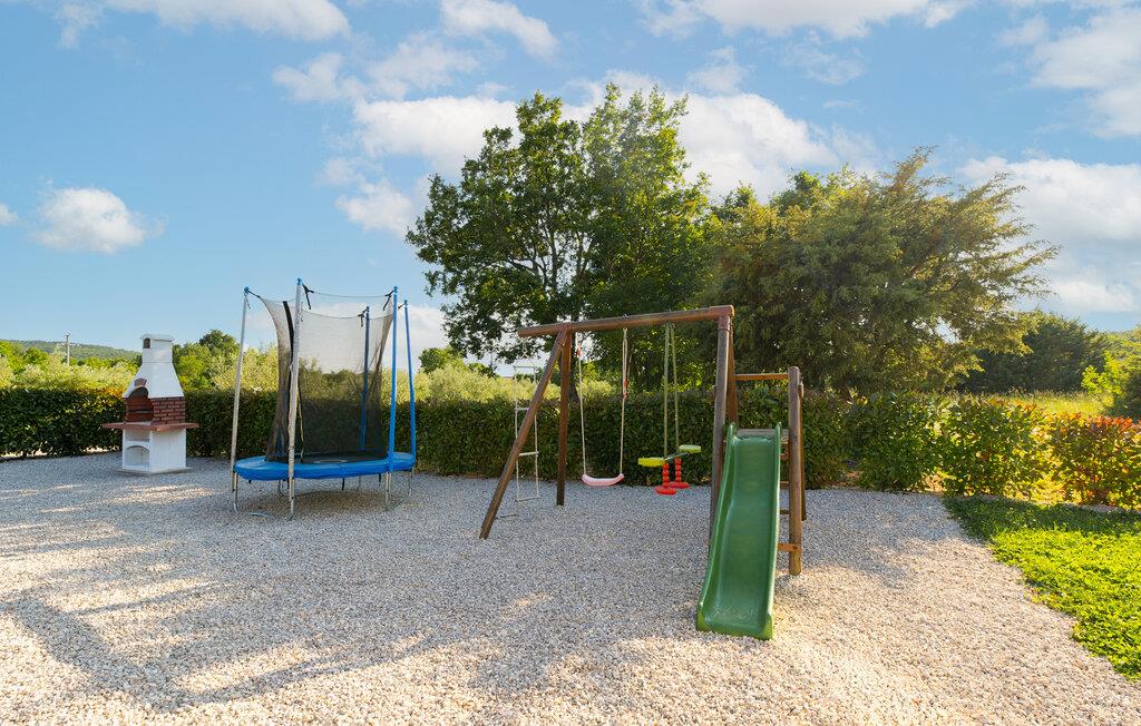 Das schöne Ferienhaus befindet sich auf einem großen Grundstück mit Olivenhain und ist ideal für einen Familienaufenthalt. Entspannen Sie am Pool, auf den Sonnenliegen oder auf der überdachten Terrasse, während die Kinder mit der Rutsche, dem Trampolin oder der Schaukel spielen.