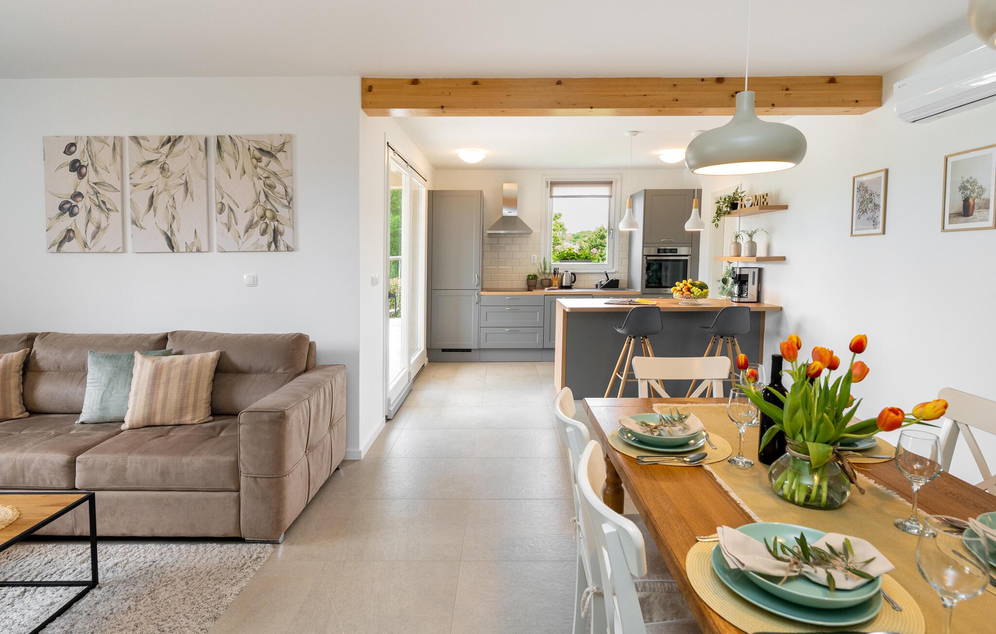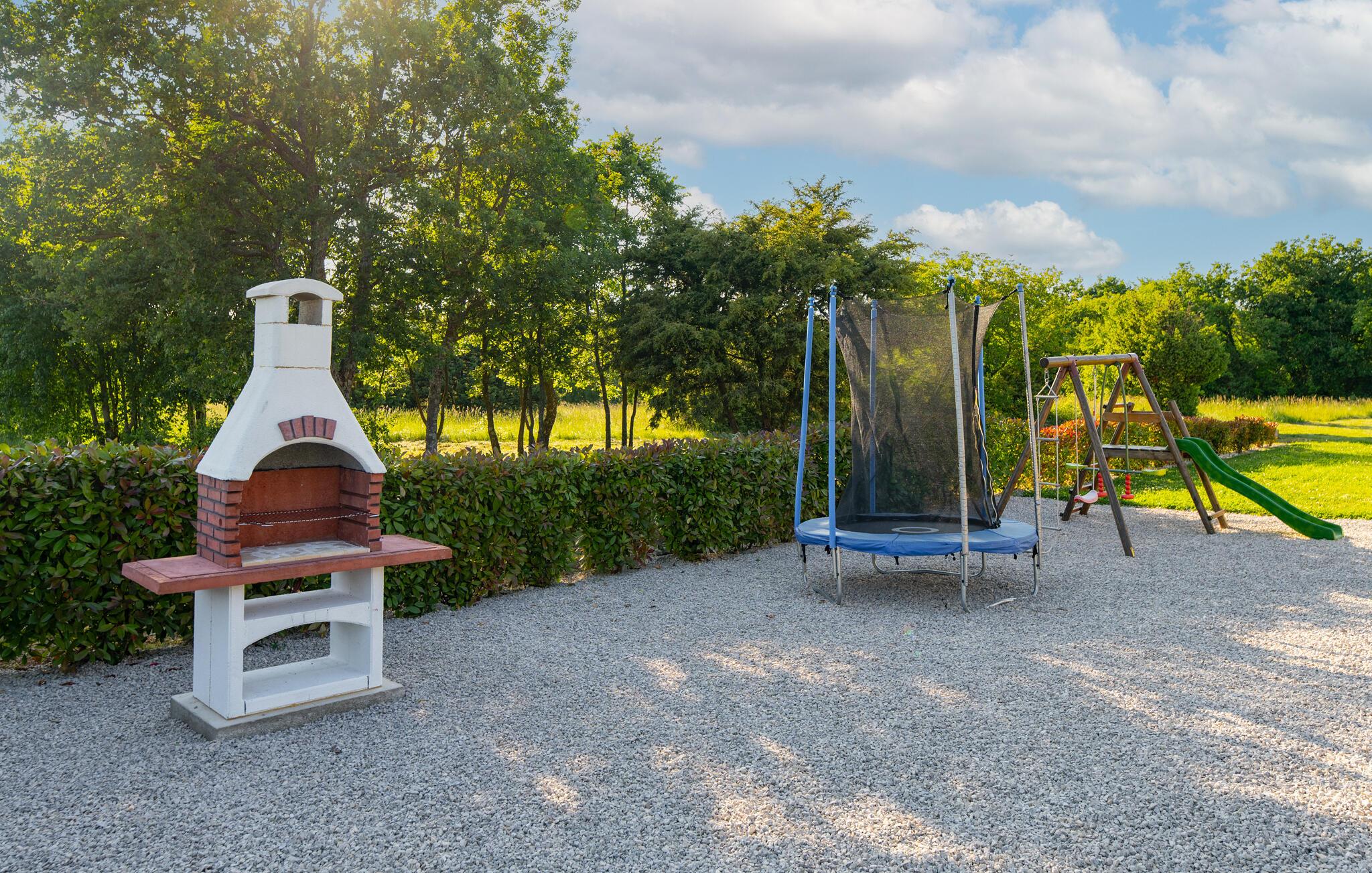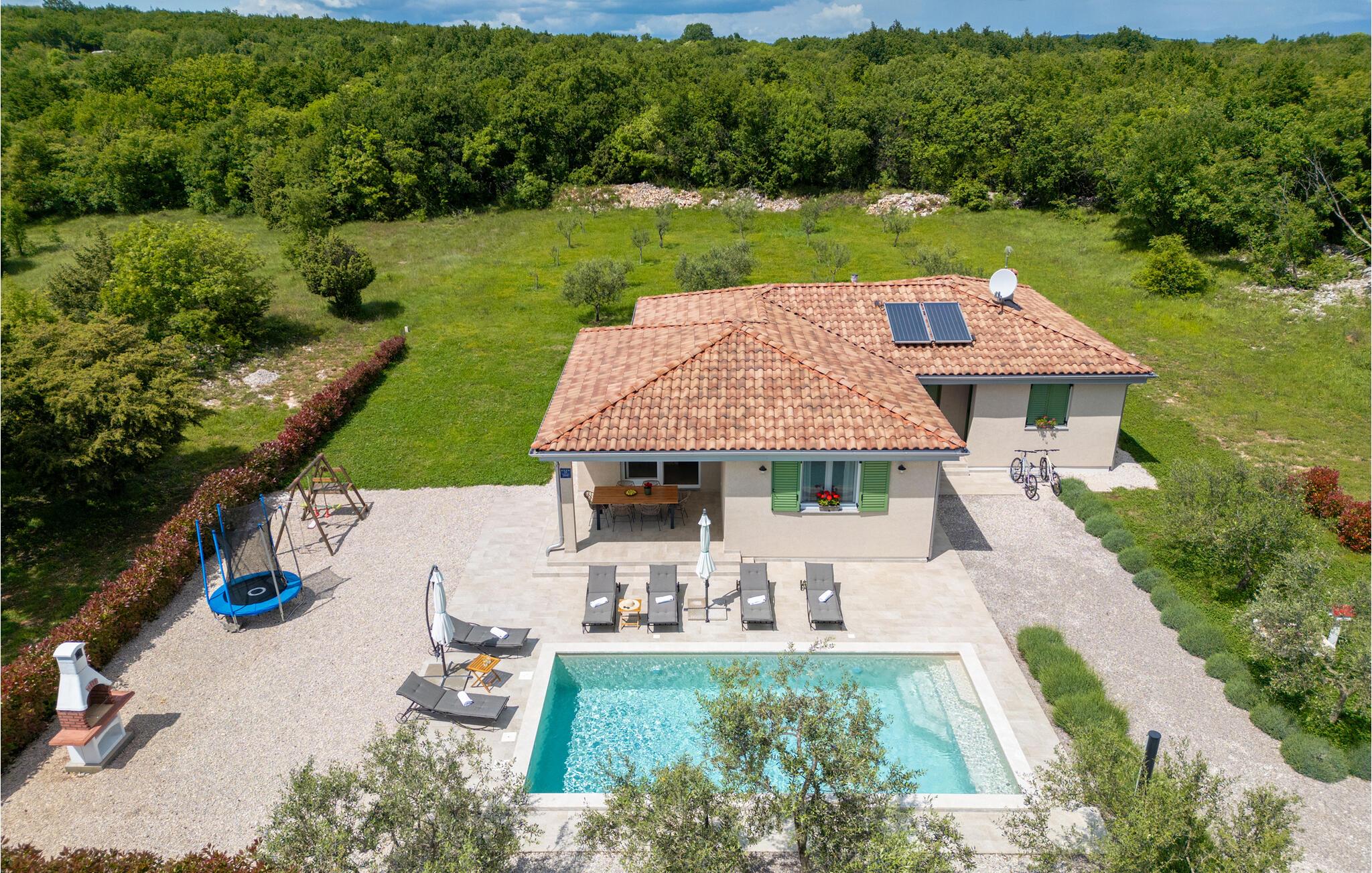 Das schöne Ferienhaus befindet sich auf einem großen Grundstück mit Olivenhain und ist ideal für einen Familienaufenthalt. Entspannen Sie am Pool, auf den Sonnenliegen oder auf der überdachten Terrasse, während die Kinder mit der Rutsche, dem Trampolin oder der Schaukel spielen.