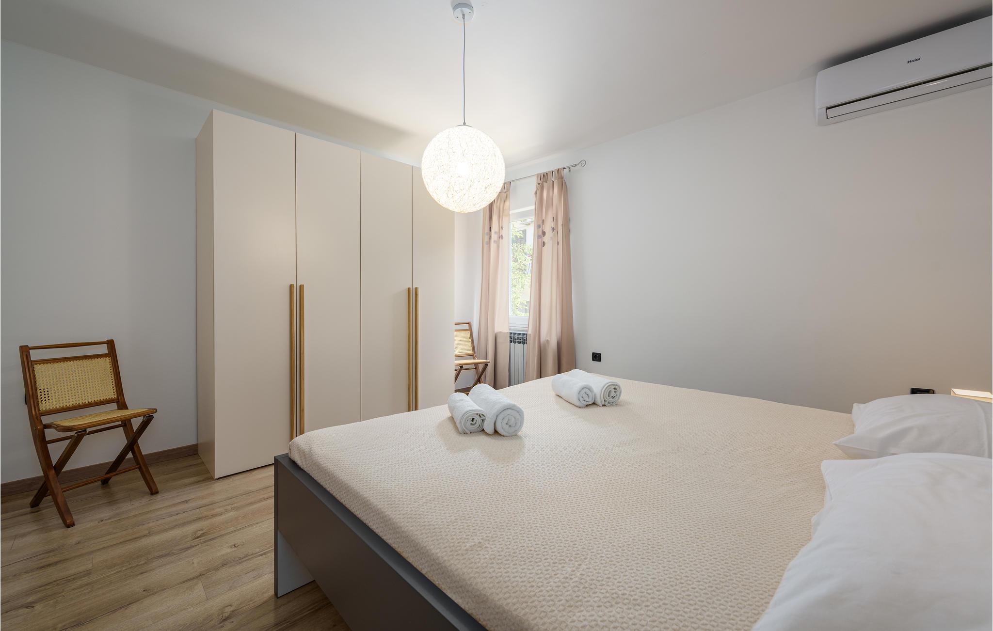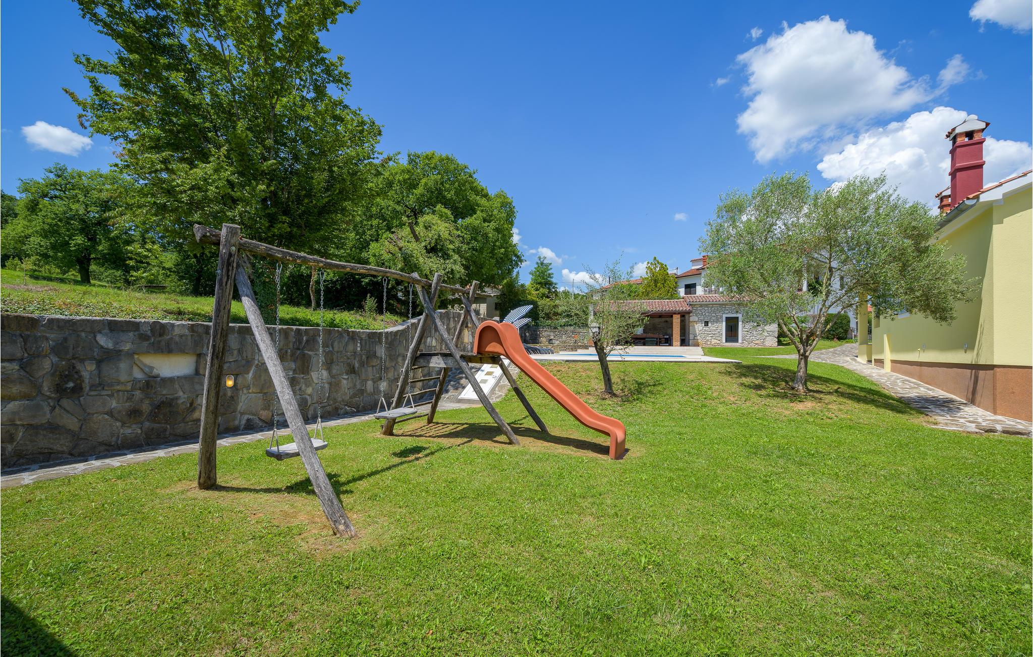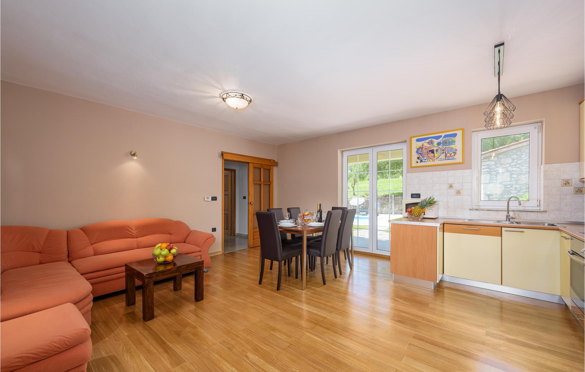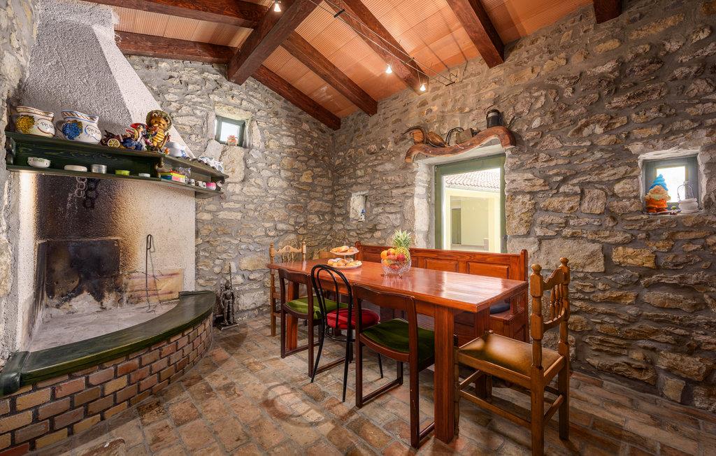 Hier haben Sie es ganz ländlich, das Dorf besteht nur aus wenigen Häusern. Sie werden hier gut im Freien entspannen, denn neben dem Pool liegen die überdachte Terrasse und eine kleine Konoba mit Kamin und einer Küche. Das Grundstück ist ebenso kinderfreundlich. Das Ferienhaus besteht aus zwei Wohneinheiten die von innen oder von außen begehbar sind. In einer Wohnung haben Sie die Küche mit Wohnzimmer und drei Schlafzimmer und in der anderen eine moderne Küche, das Wohnzimmer, das Schlafzimmer und ein Bad. Das Haus ist ideal für zwei Familien geeignet. Den Gästen stehen auch gemeinsame Aufenthaltsräume zu Verfügung. Vom Haus weg führen schöne Radwege. In ungefähr 10 Minuten im Auto erreichen Sie den bekannten Besuchsbauernhof 'Goloricki dol', wo Sie Haustiere sehen und ausgezeichnete, istrische Spezialitäten kaufen können. Das Haus ist die ideale Urlaubsbasis für einen naturnahen Urlaub. Sie müssen jedoch nicht auf Kunst und Kultur verzichten, denn in der Nähe finden Sie das historische Künstlerstädtchen Labin, das antike Pula oder den Ferienort Opatija, eine wahre Perle an der istrischen Küste.
