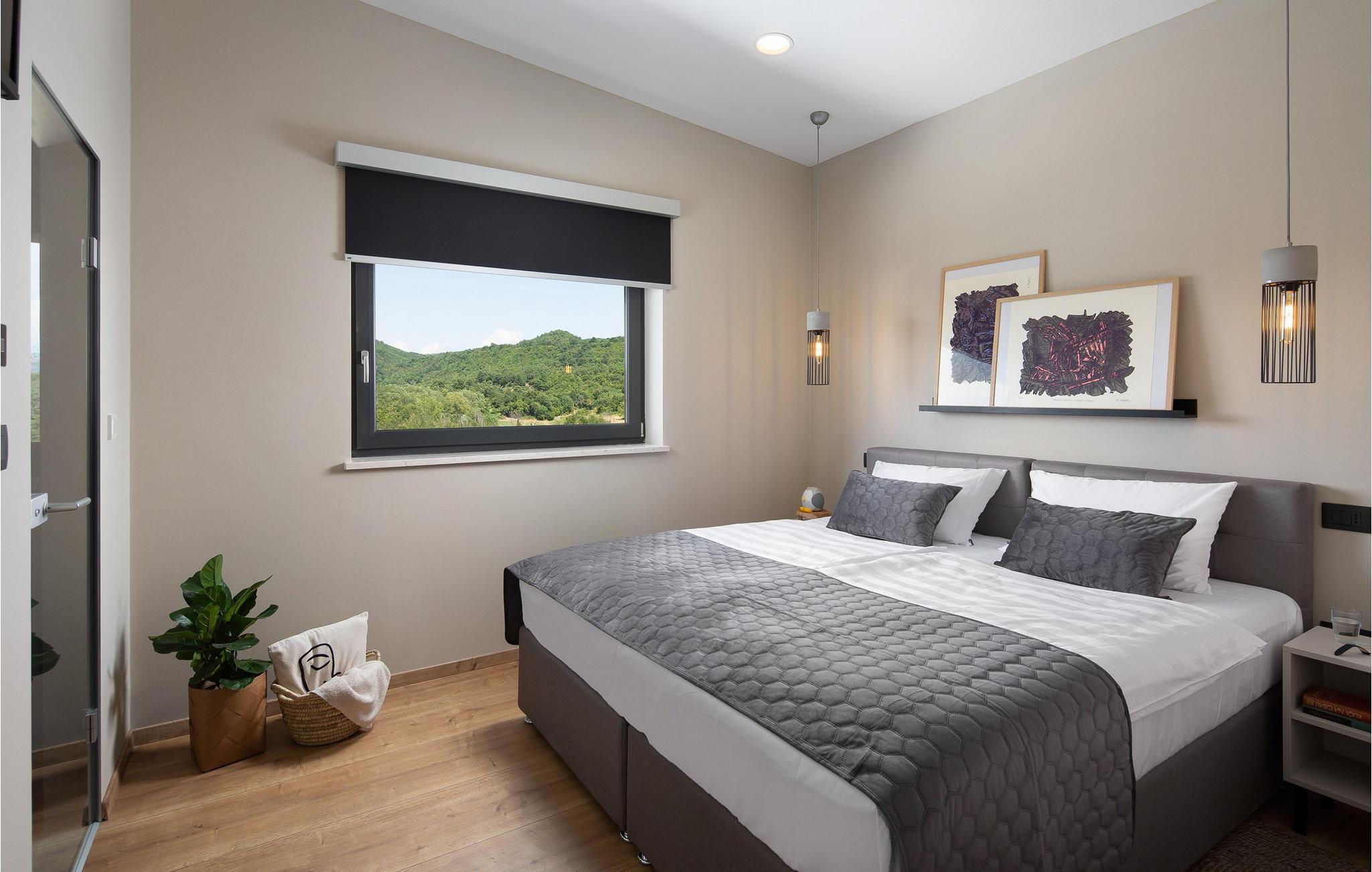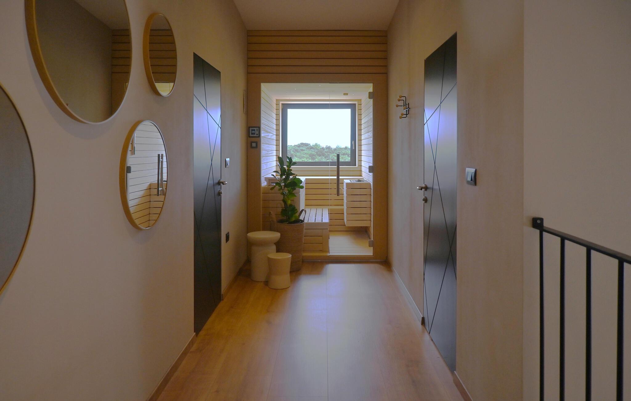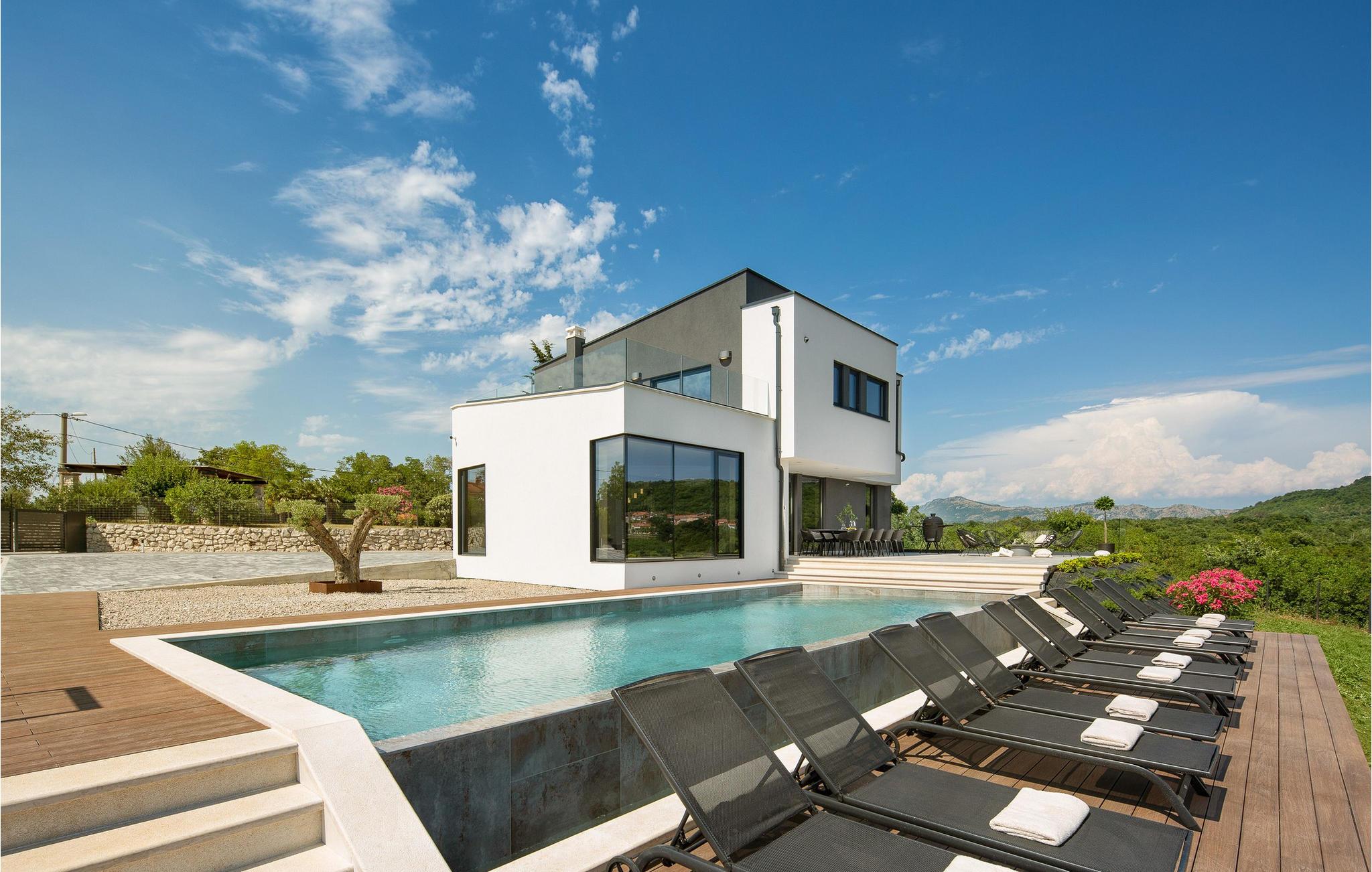 Die Villa wurde 2022 in einem modernen Stil erbaut, der jeden Gast begeistern wird. Ihnen stehen 375 m2 zur Verfügung, während die Gesamtfläche des Grundstücks 2000 m2 beträgt. Die Villa bietet Platz für maximal 10 Personen. Die Villa besteht aus Erdgeschoss, Obergeschoss und Keller. Im Keller befindet sich eine Man Cave-Garage mit einem Weinkeller, einem Spielzimmer (Playstation, Tischfußball, Tischtennis, Darts), einem Fitnessraum, einer Garage für ein Auto, einem Badezimmer mit Dusche und einem Schlafzimmer. Das Erdgeschoss begeistert mit einem Wohnzimmer mit Ecksofa, Couchtisch, Klavier und Fernseher. Es gibt außerdem eine modern ausgestattete Küche und ein Esszimmer mit einem Esstisch für 10 Personen. Sie wohnen komfortabel in fünf Schlafzimmern, zwei davon mit Doppelbetten und eigenem Bad mit Badewanne, und drei Zimmern mit sechs Einzelbetten und eigenem Bad mit Dusche.