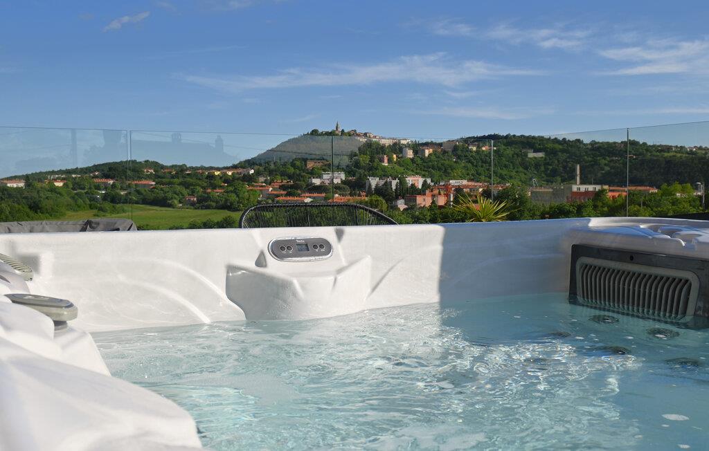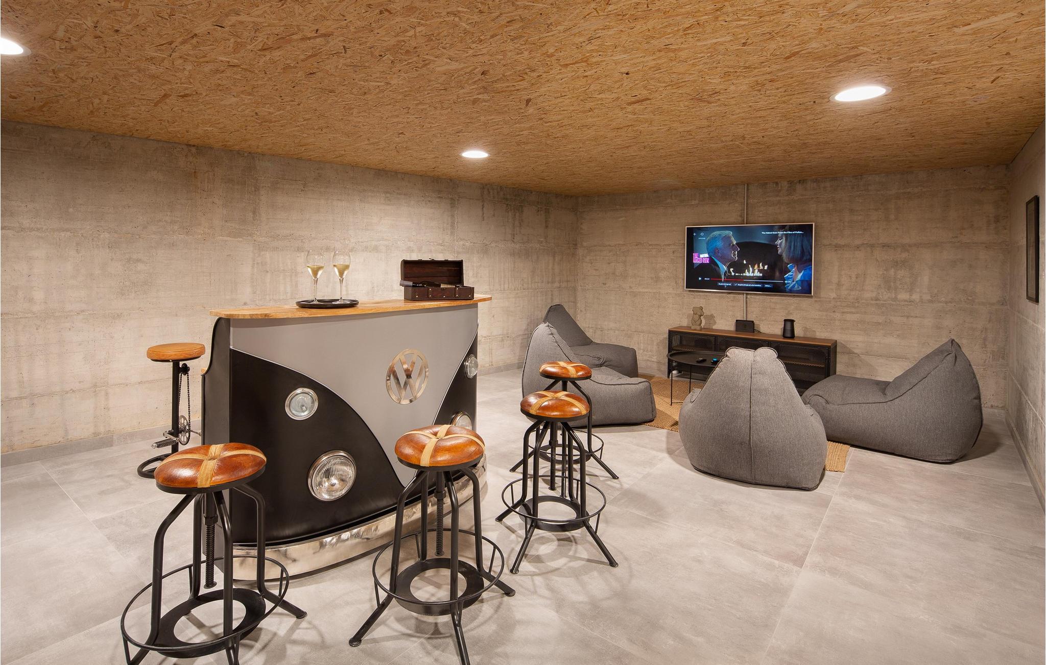 Im Kellerraum befindet sich ein zusätzliches Bett. Das Zimmer im ersten Stock hat direkten Zugang zur Außenterrasse, von der aus Sie den Außen-Whirlpool für fünf Personen genießen können.