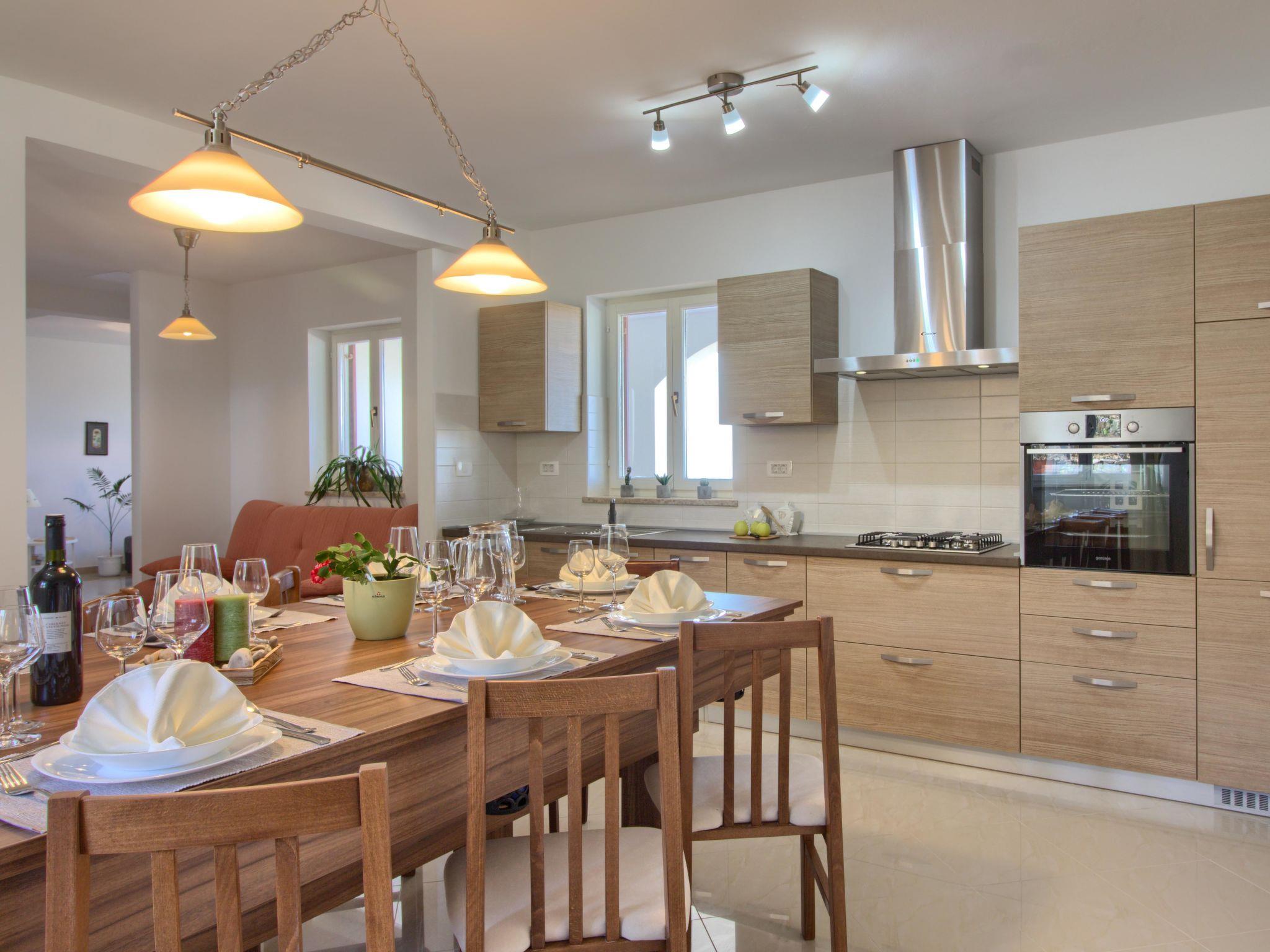 5-Zimmer-Haus 120 m2. Wohn-/Esszimmer 60 m2 mit 1 Doppeldiwanbett (140 cm, Länge 200 cm), Sat-TV (Flachbildschirm), Klimaanlage. Ausgang zur Terrasse. 2 Zimmer, jedes Zimmer mit 1 Doppelbett (2 x 80 cm, Länge 200 cm), Dusche/WC und Klimaanlage. 1 Zimmer mit 1 Doppelbett (2 x 80 cm, Länge 200 cm), Klimaanlage. 1 Zimmer mit 2 Betten (80 cm, Länge 200 cm), Klimaanlage. Offene Küche (4 Kochplatten, Backofen, Geschirrspüler, Mikrowelle, Tiefkühler, elektrische Kaffeemaschine) mit Sat-TV (Flachbildschirm), Klimaanlage. 2 Duschen/WC. Terrasse 30 m2, überdacht, Terrasse 9 m2, überdacht. Terrassenmöbel, Liegestühle. Schöne Panoramasicht auf das Meer. Zur Verfügung: Safe, Babybett, Haartrockner. Internet (WLAN, gratis). Maximal 2 Haustiere/Hunde erlaubt.