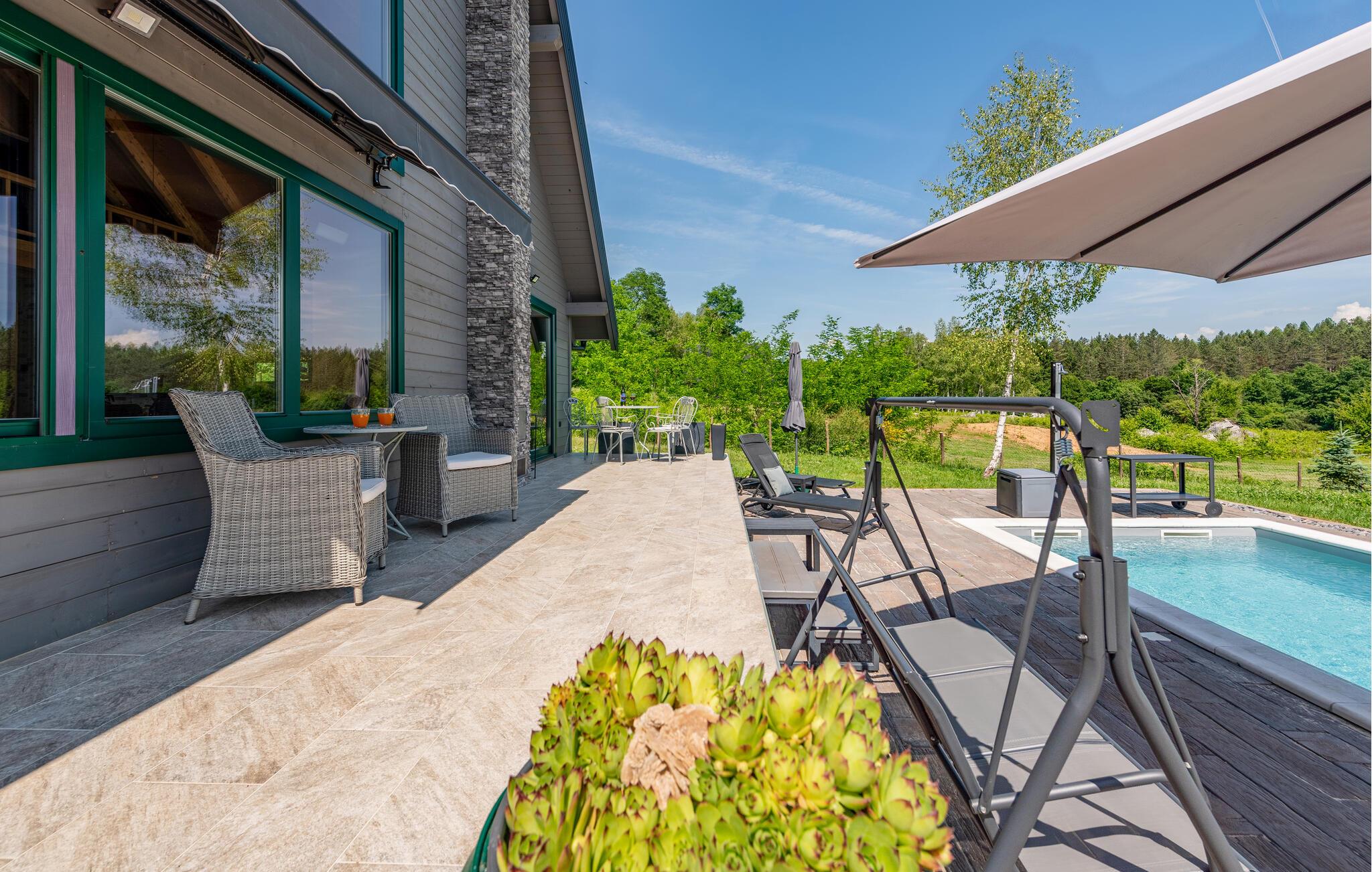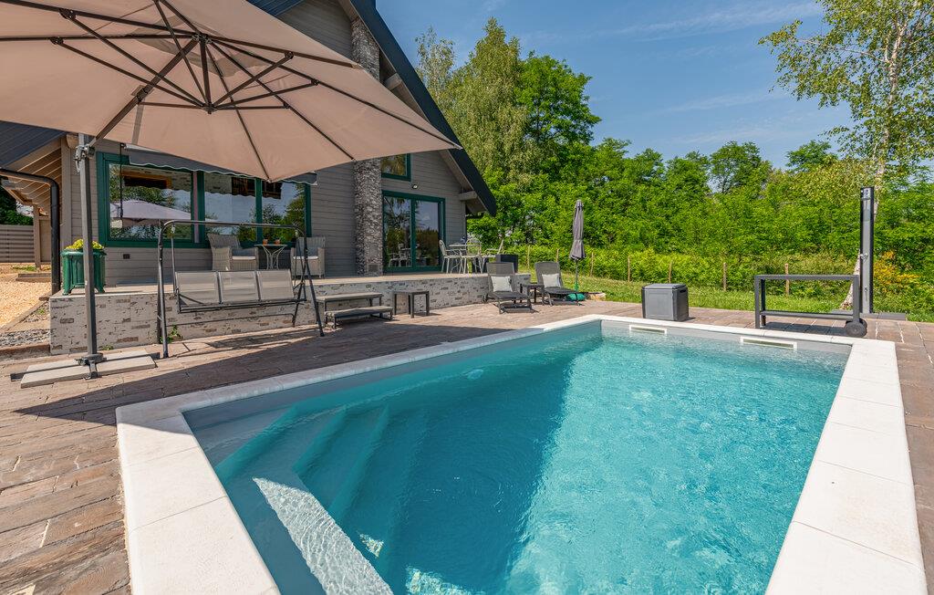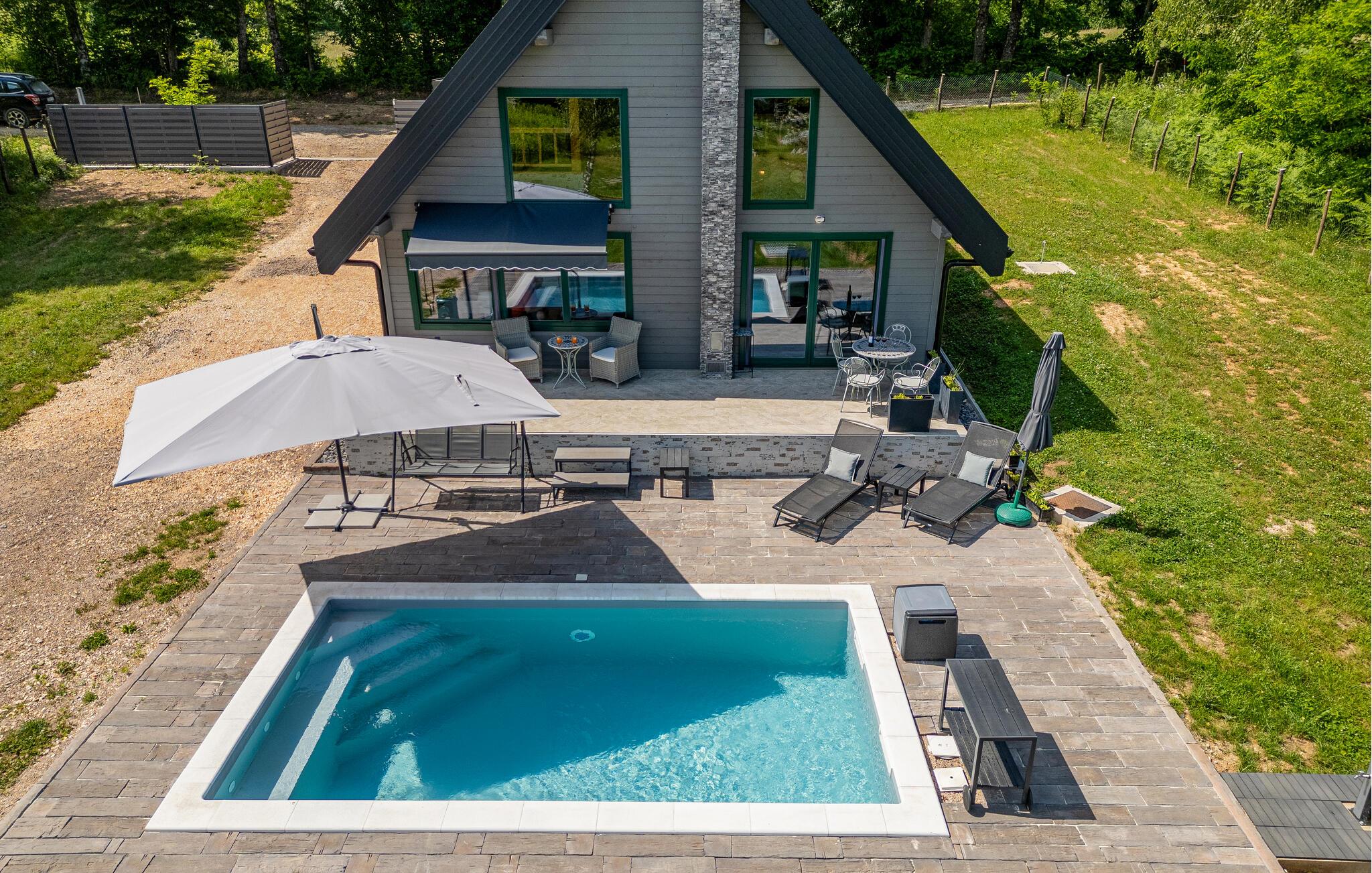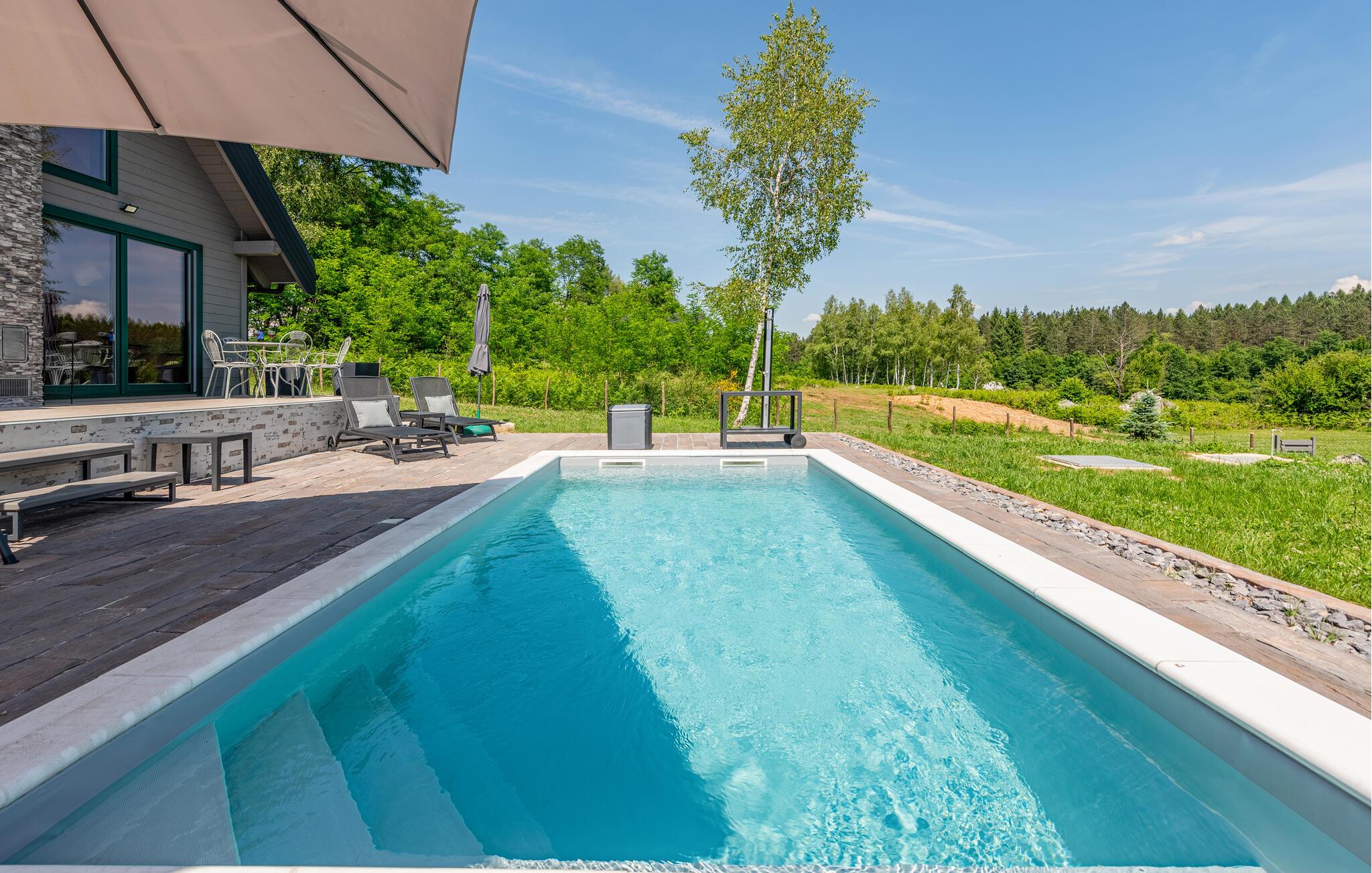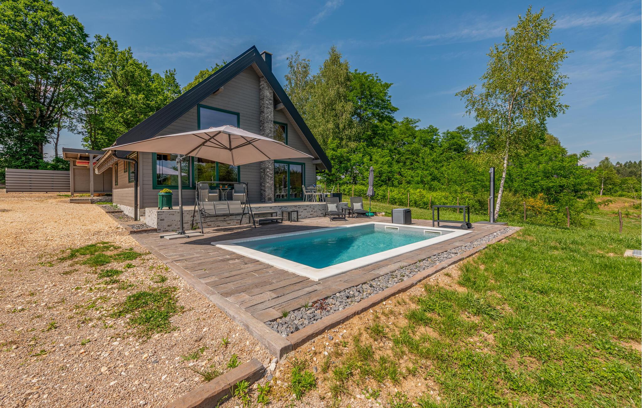 Verbringen Sie einen erholsamen Familienurlaub in diesem komfortablen Ferienhaus mit Pool und Whirlpool.
