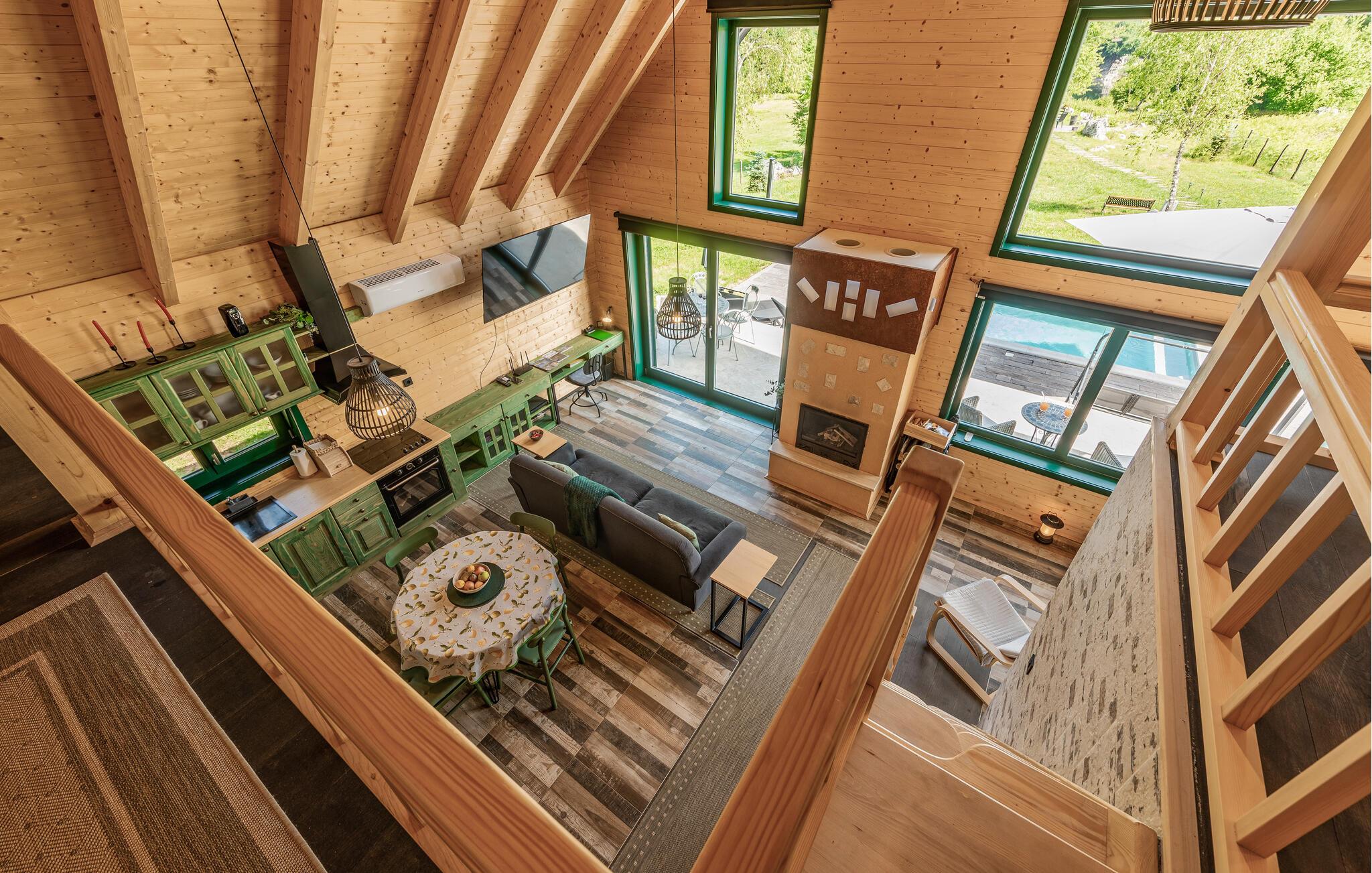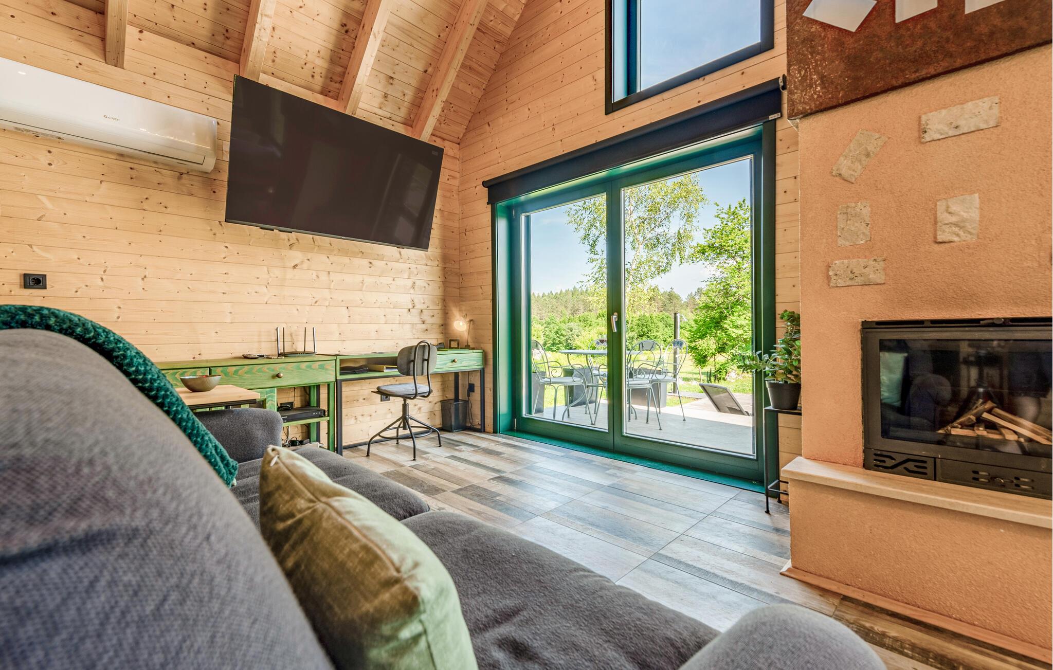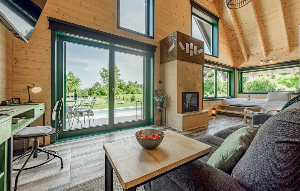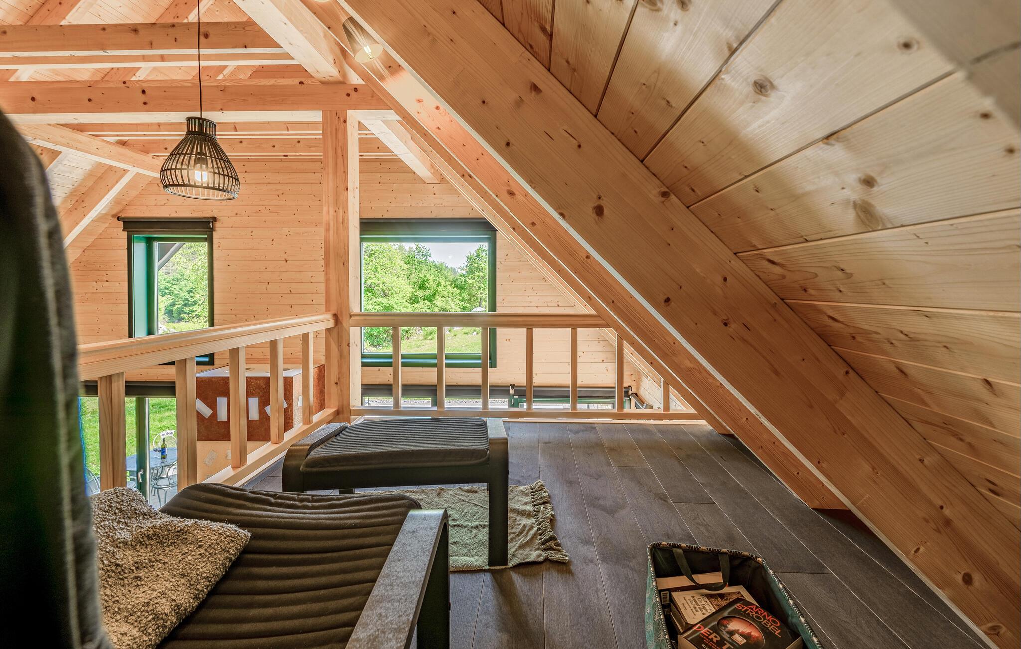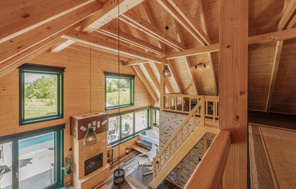 Das moderne Haus empfängt Sie inmitten einer wunderschönen Landschaft, auf die Sie hier eine einzigartige Aussicht genießen, und ist der ideale Ort für eine angenehme Zeit mit Ihren Lieben. Die stilvolle Einrichtung mit schönen Holzelementen macht es Ihnen leicht, hier zu entspannen. Ein absolutes Highlight ist der Whirlpool vor großen Fenstern, durch die Sie den Blick über die Umgebung schweifen lassen können. Machen Sie es sich abends auf den einladenden Sofas am prasselnden Kaminfeuer gemütlich.