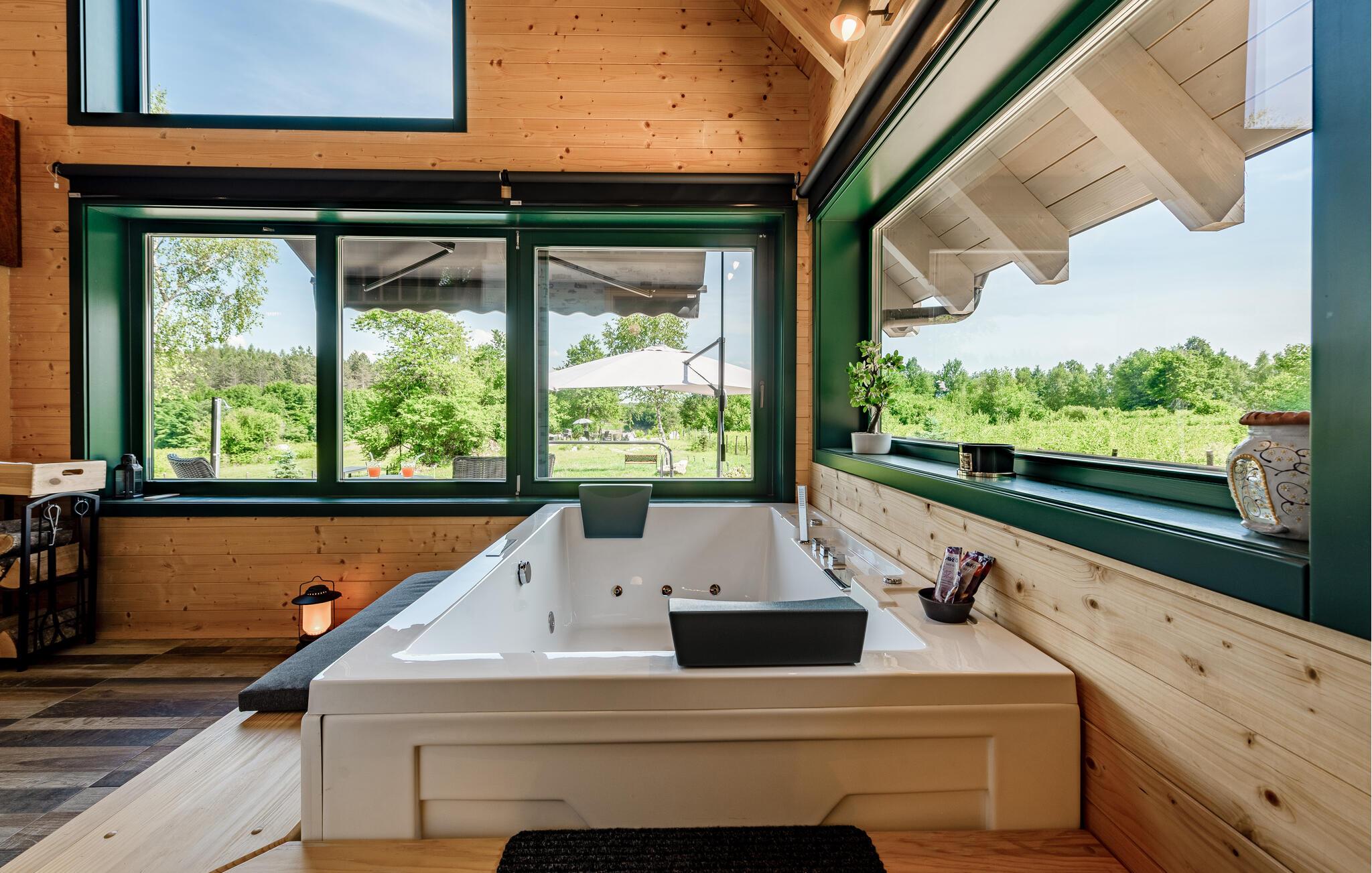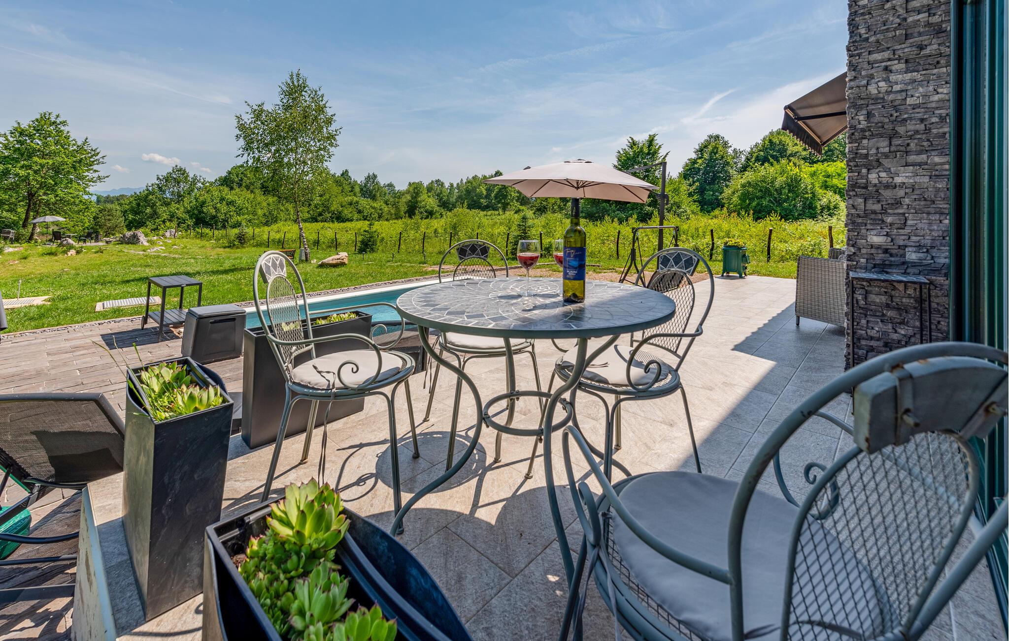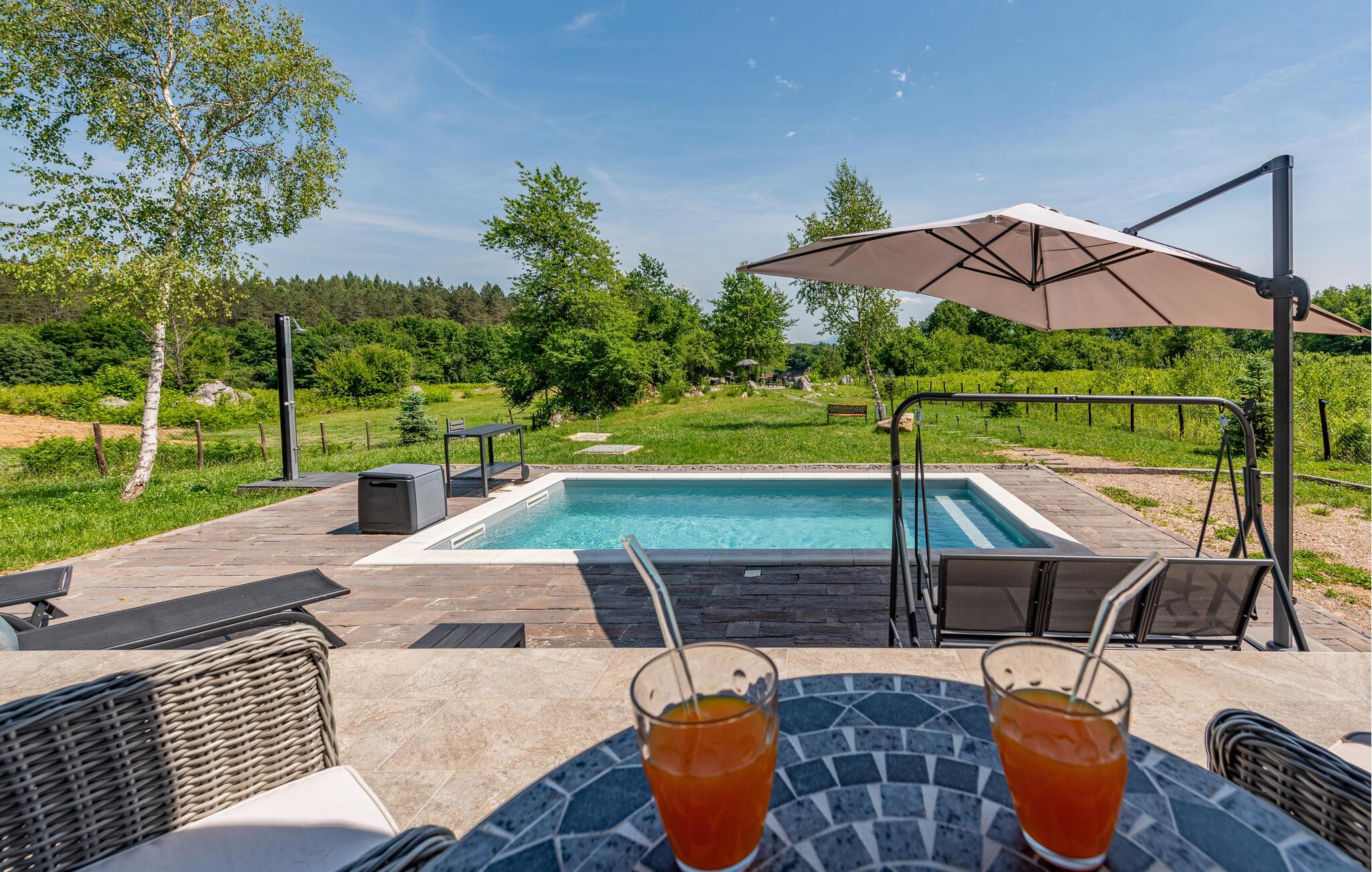 Lassen Sie auch im Freien umgeben von der idyllischen Landschaft die Seele baumeln. Genießen Sie die Mahlzeiten auf der Terrasse, erfrischen Sie sich im Pool, später können Sie Leckereien vom Grill für die ganze Familie servieren oder im Whirlpool unter freiem Himmel entspannen.