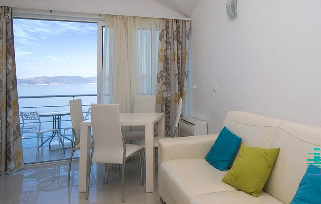Lassen Sie sich beim Betreten Ihrer hellen Ferienwohnung sofort vom weiten Blick auf die Adria begeistern. Nehmen Sie im Wohnbereich auf dem Sofa Platz und genießen Sie das eindrucksvolle Panorama durch die großen Fenstertüren. Der offen gestaltete Raum verbindet Wohnen, Essen und Kochen auf harmonische Weise. Bereiten Sie in der kompakten, funktionalen Küche Ihre Mahlzeiten zu und decken Sie den Esstisch am Fenster, um mit direktem Meerblick zu speisen. Ziehen Sie sich abends in das Schlafzimmer zurück, öffnen Sie die Balkontür und lassen Sie die frische Meeresluft herein. Morgens wachen Sie mit dem wundervollen Meerblick auf.