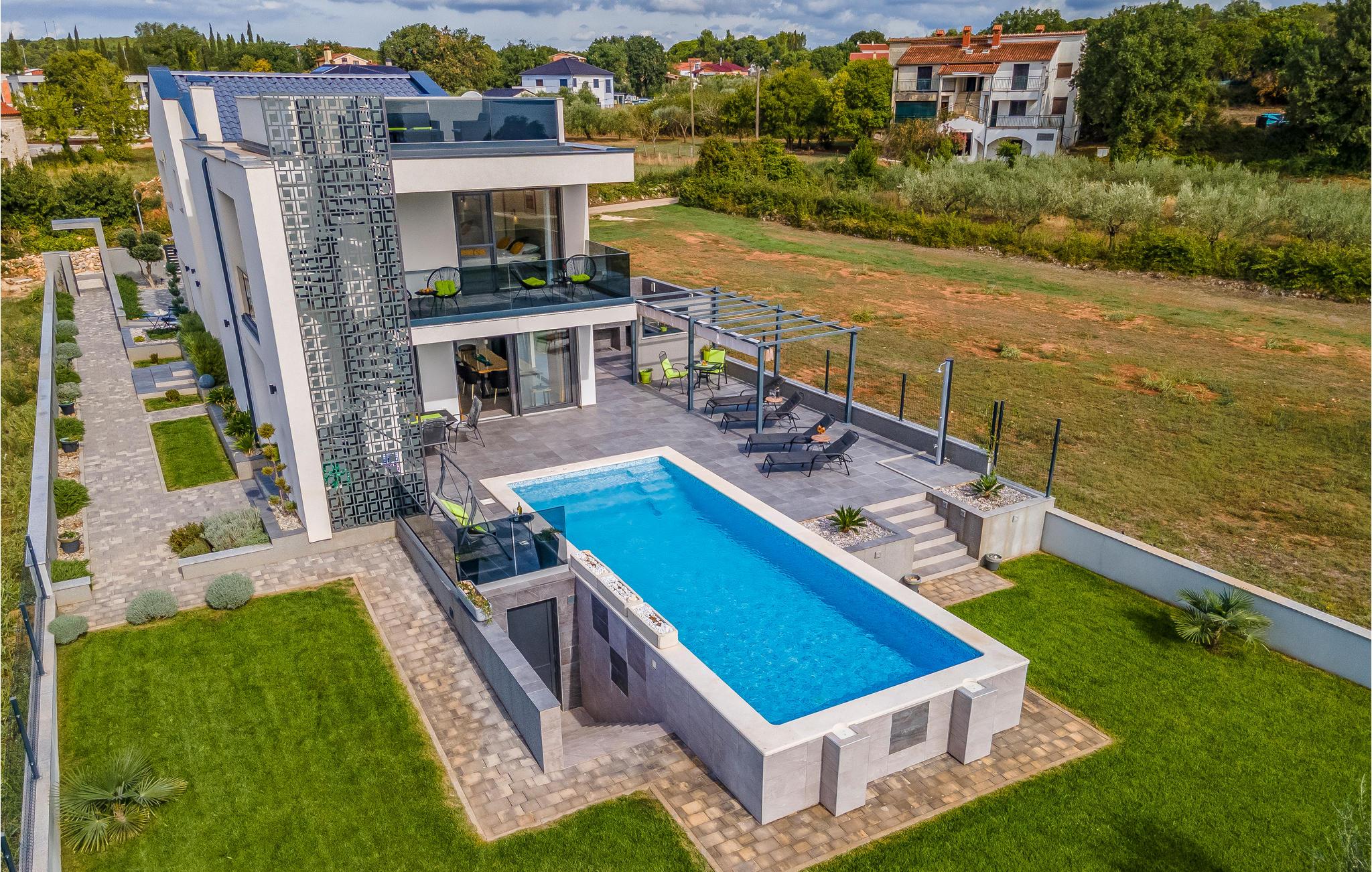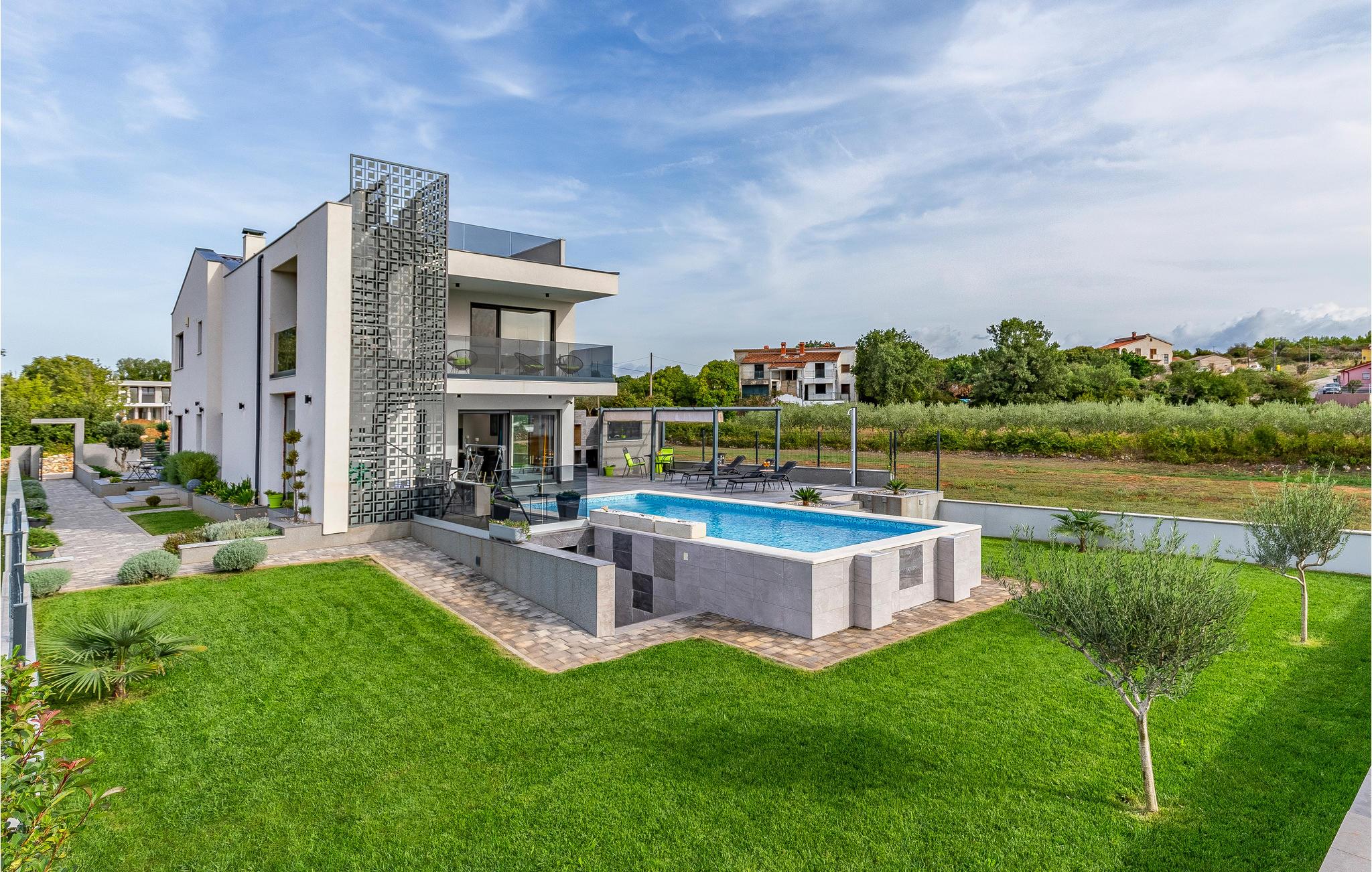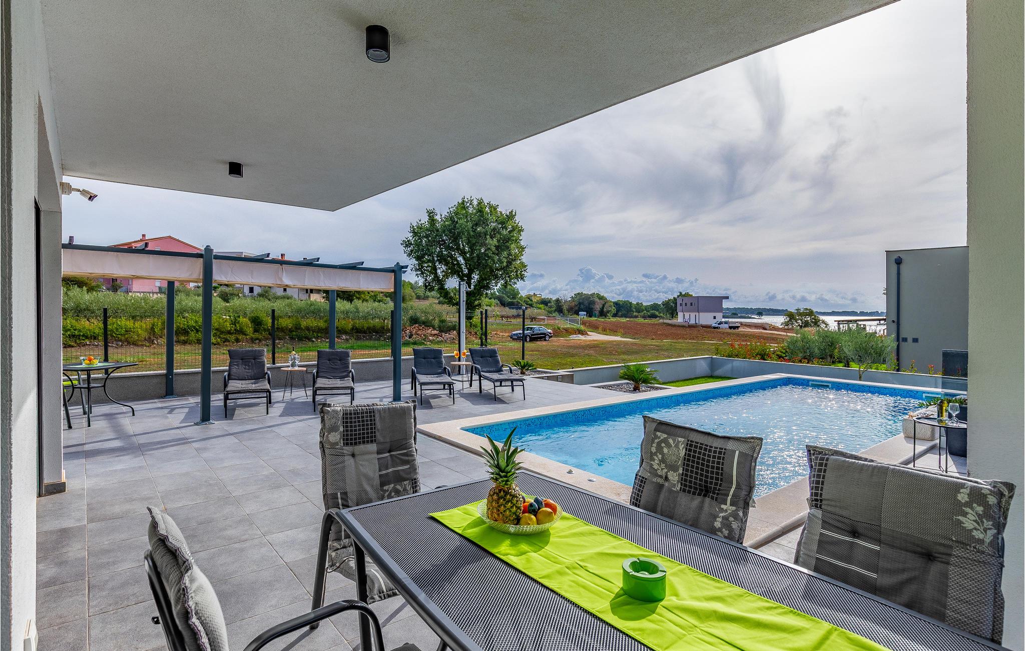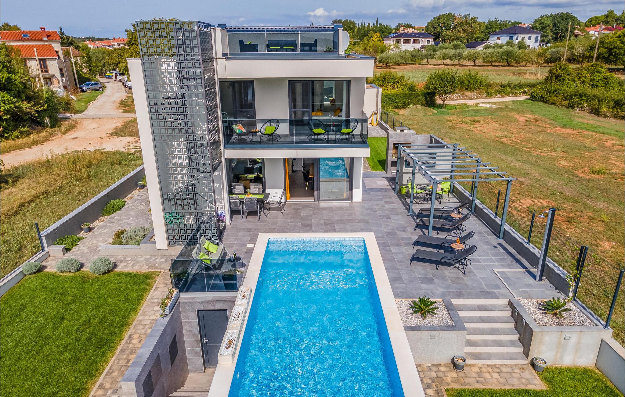Der Außenbereich umfasst eine sehr schöne überdachte Terrasse mit Sonnendeck. Zudem führt eine Außentreppe, entlang des geräumigen Balkons im 1. Stock, hinauf zur Dachterrasse. Von hier können Sie einen fanstatischen Ausblick auf die Bucht von Pomer und Medulin genießen. Im Garten finden Ihre Kinder eine Rasenfläche zum Spielen, dennoch werden Sie sich sicherlich viele Stunden im Wasser des großen Swimmingpools aufhalten. Ein weiteres Highlight ist die Außenküche, wo Sie nach Herzenslust kochen und grillen und Ihre Mahlzeiten unter freiem Himmel einnehmen können.