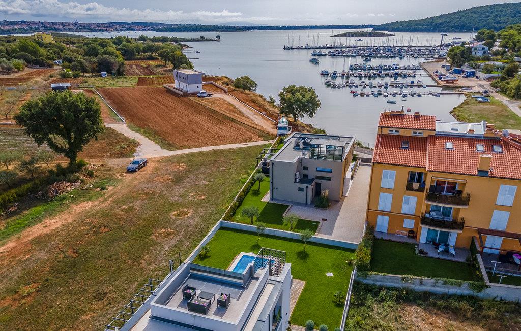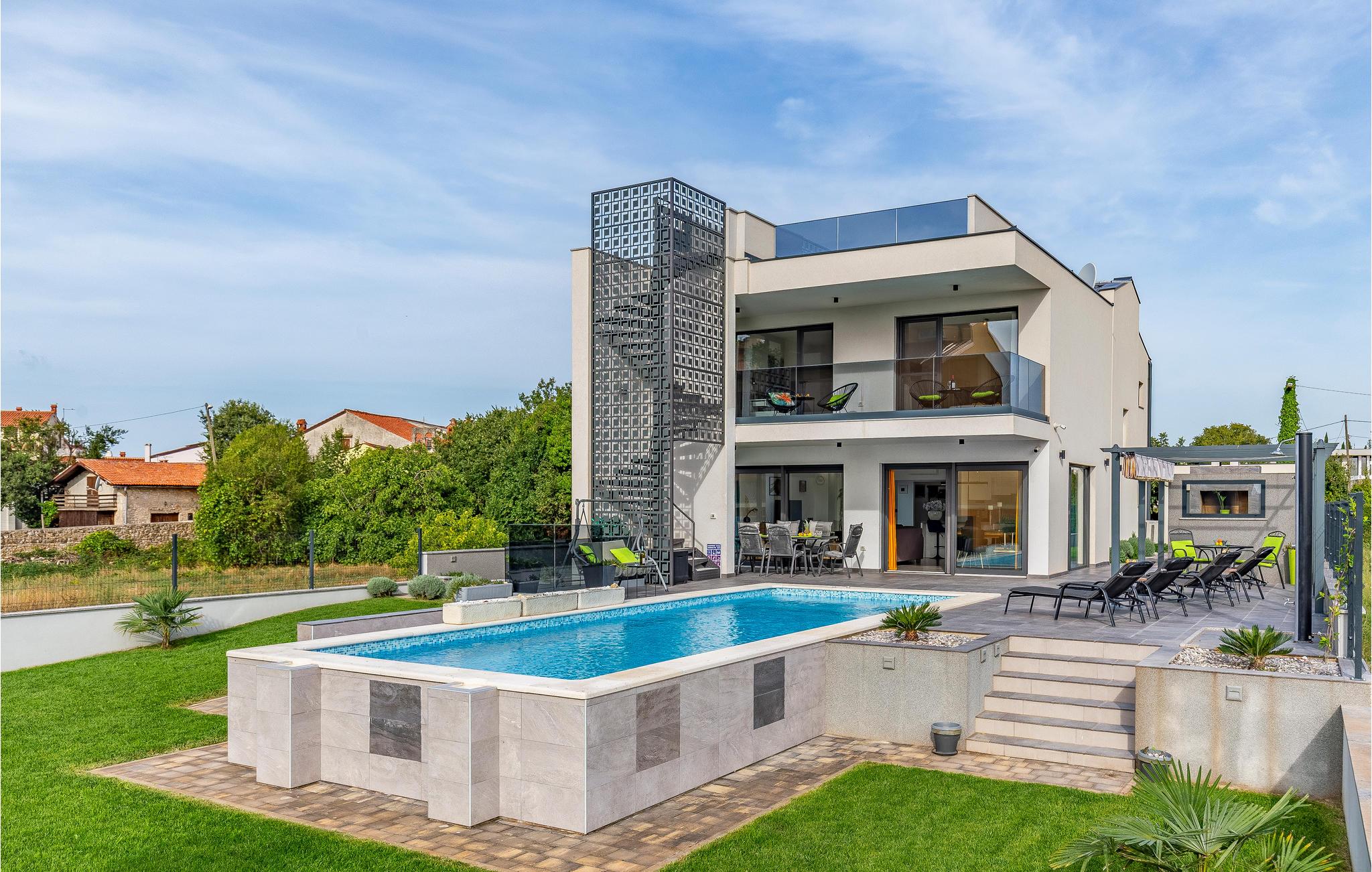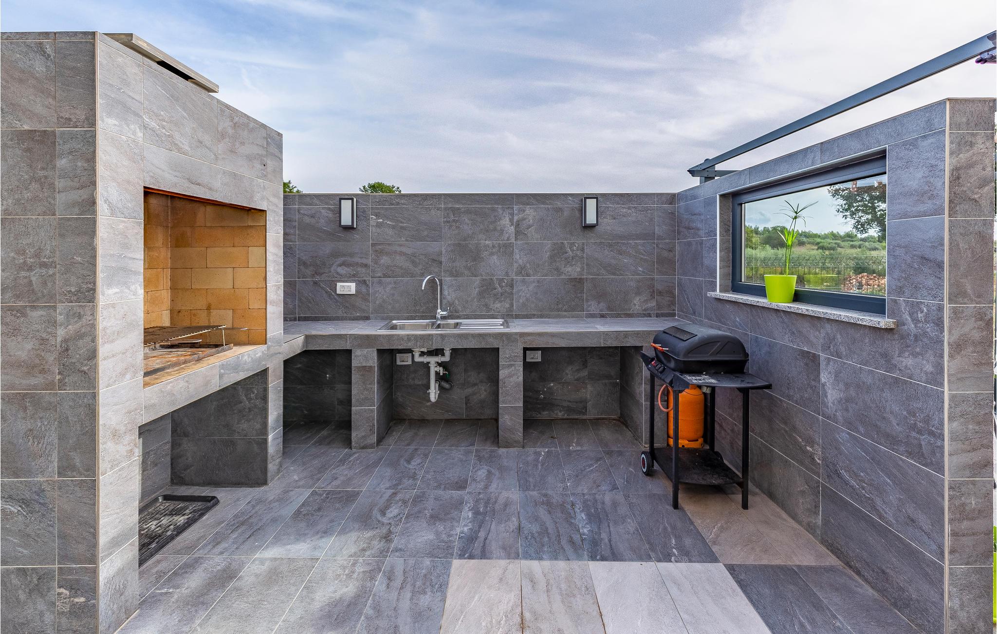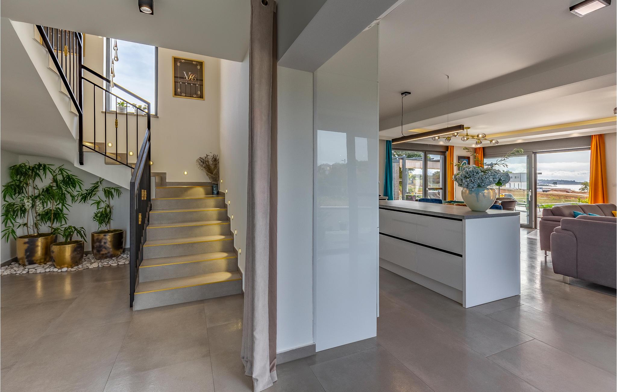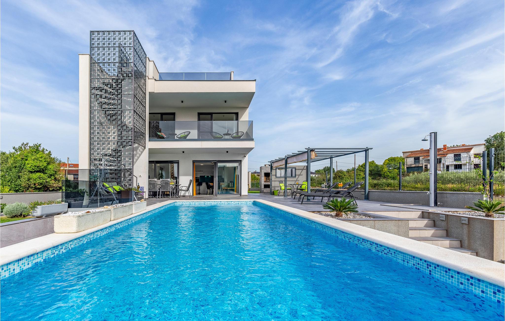 Der Außenbereich umfasst eine sehr schöne überdachte Terrasse mit Sonnendeck. Zudem führt eine Außentreppe, entlang des geräumigen Balkons im 1. Stock, hinauf zur Dachterrasse. Von hier können Sie einen fanstatischen Ausblick auf die Bucht von Pomer und Medulin genießen. Im Garten finden Ihre Kinder eine Rasenfläche zum Spielen, dennoch werden Sie sich sicherlich viele Stunden im Wasser des großen Swimmingpools aufhalten. Ein weiteres Highlight ist die Außenküche, wo Sie nach Herzenslust kochen und grillen und Ihre Mahlzeiten unter freiem Himmel einnehmen können.