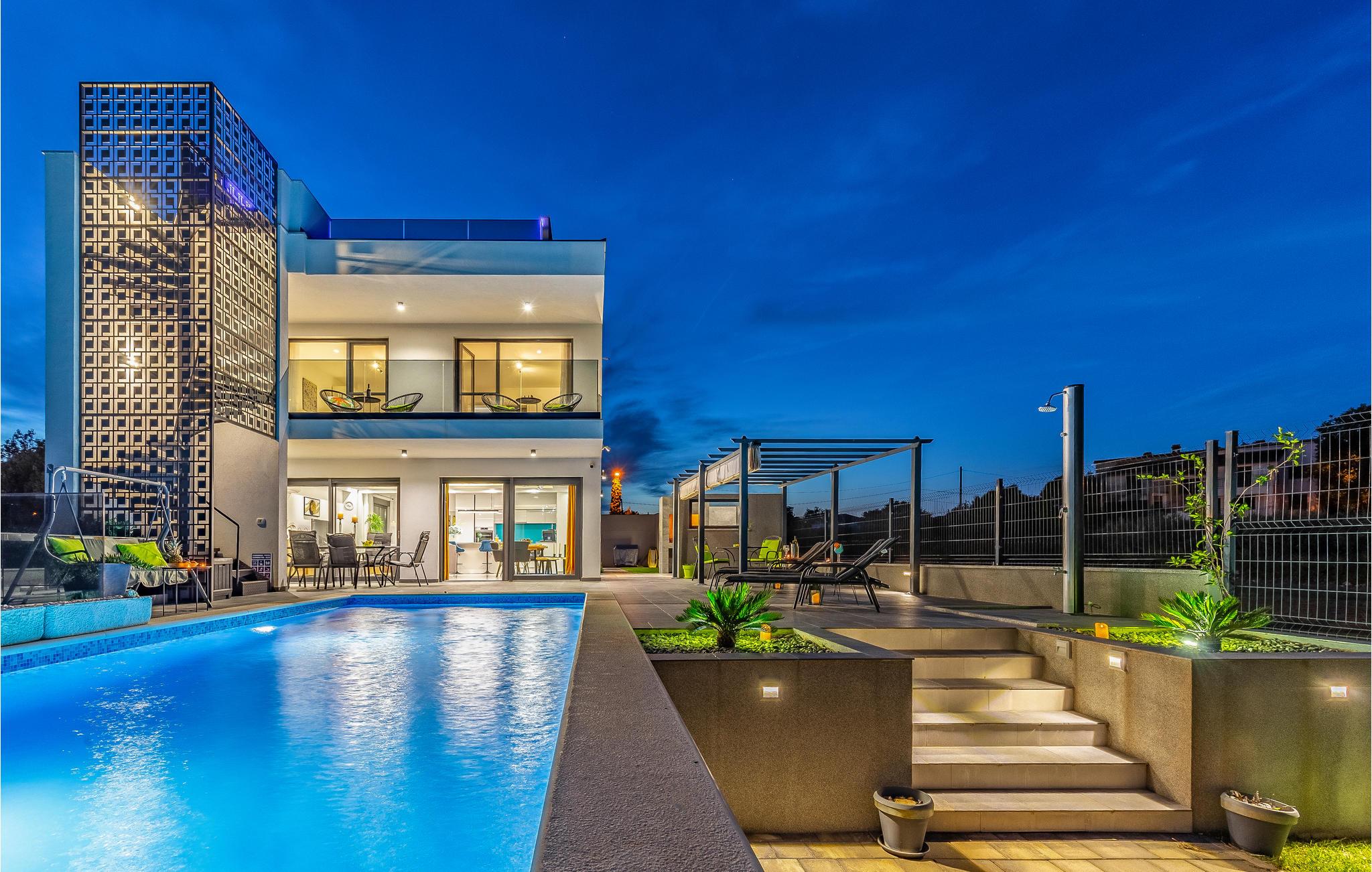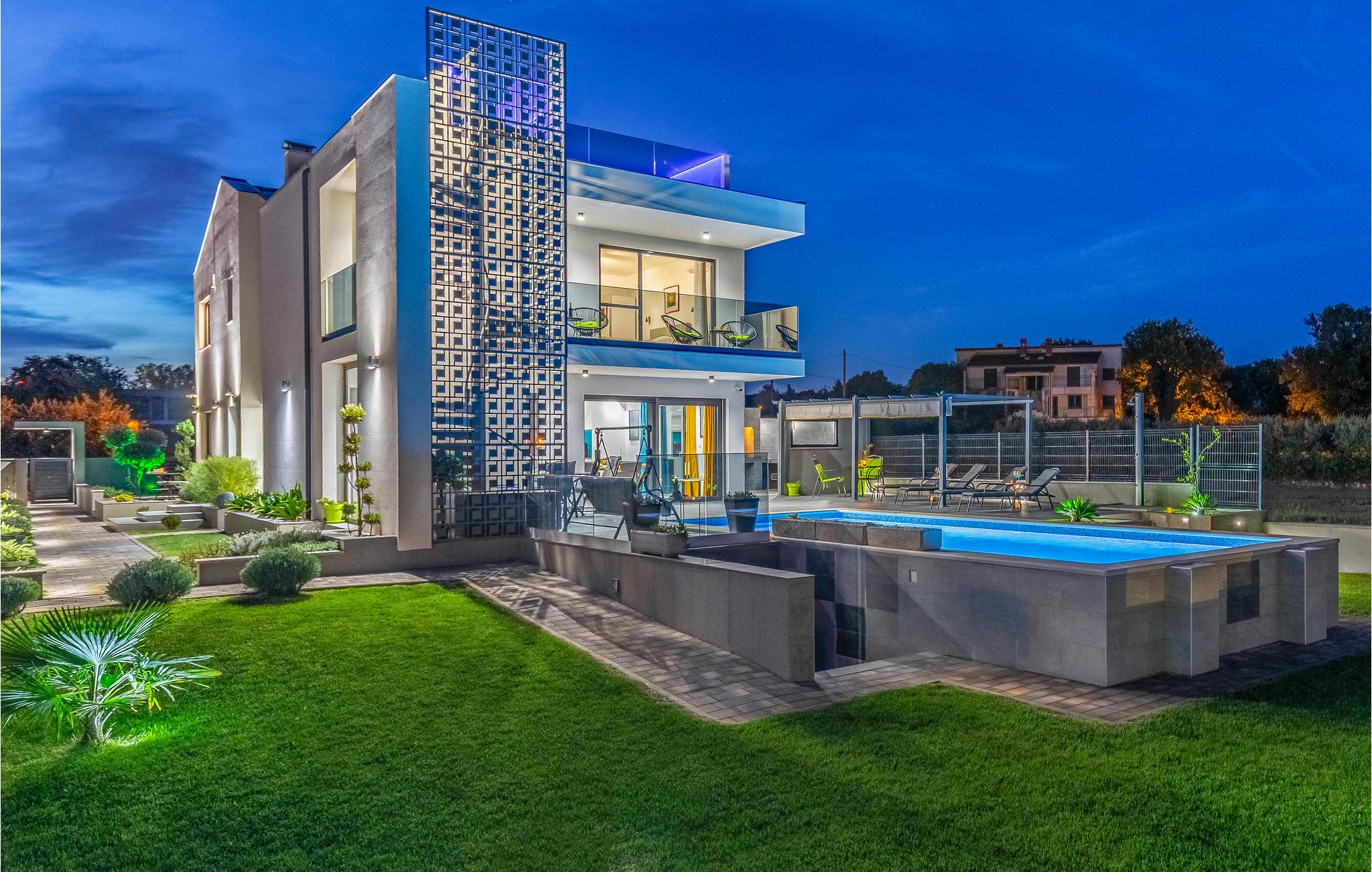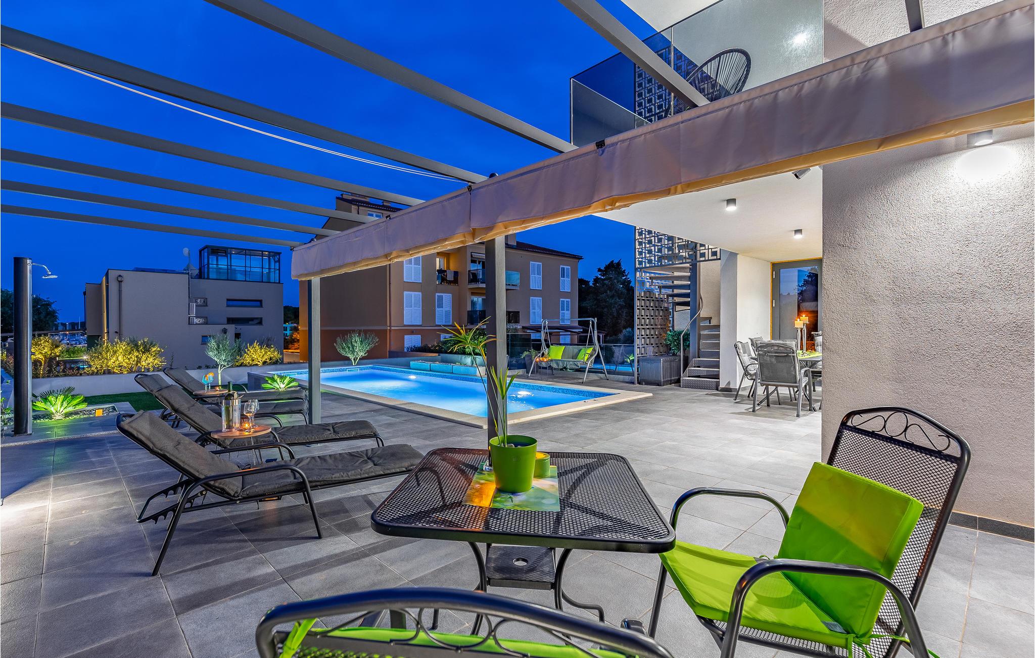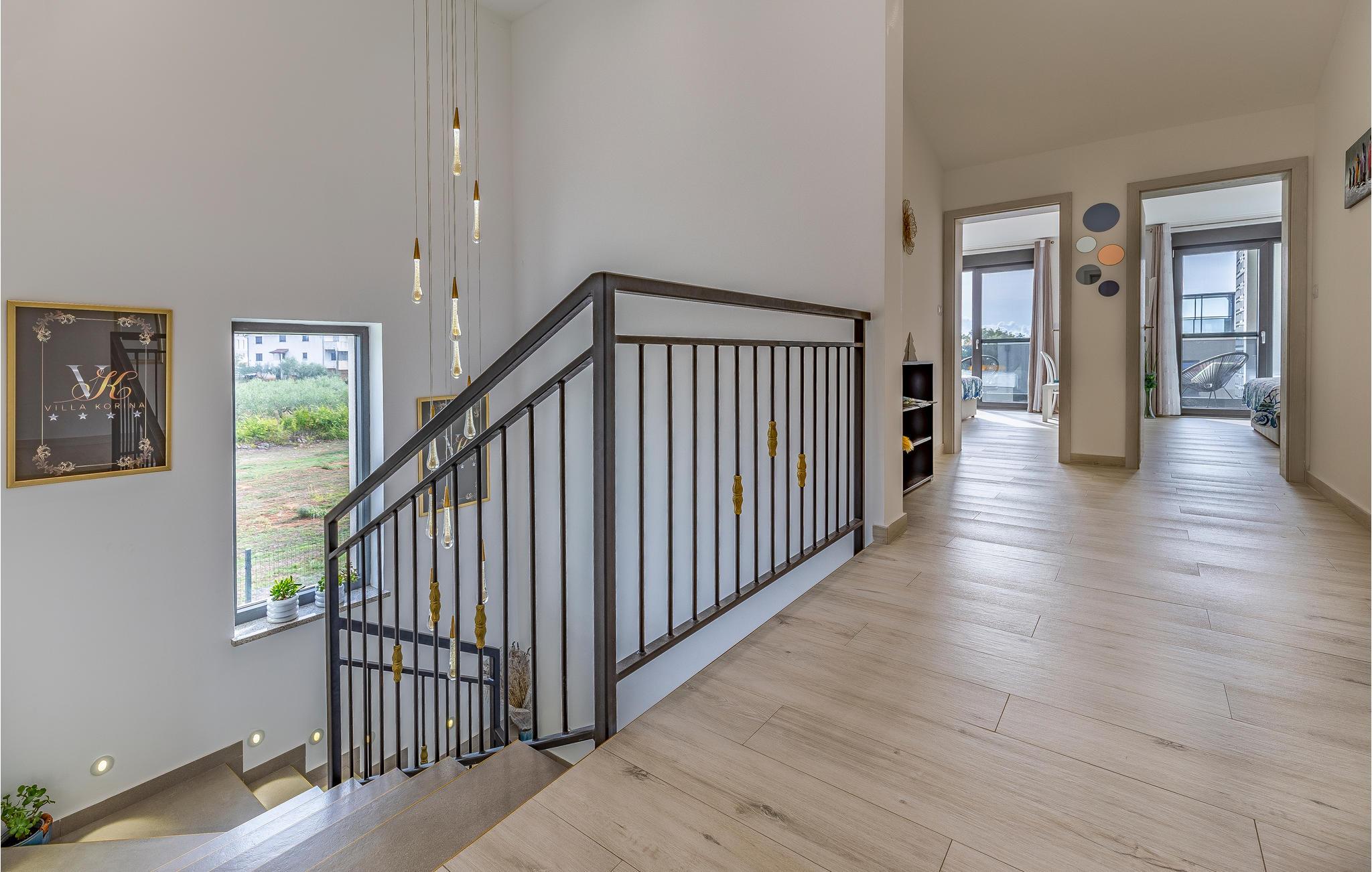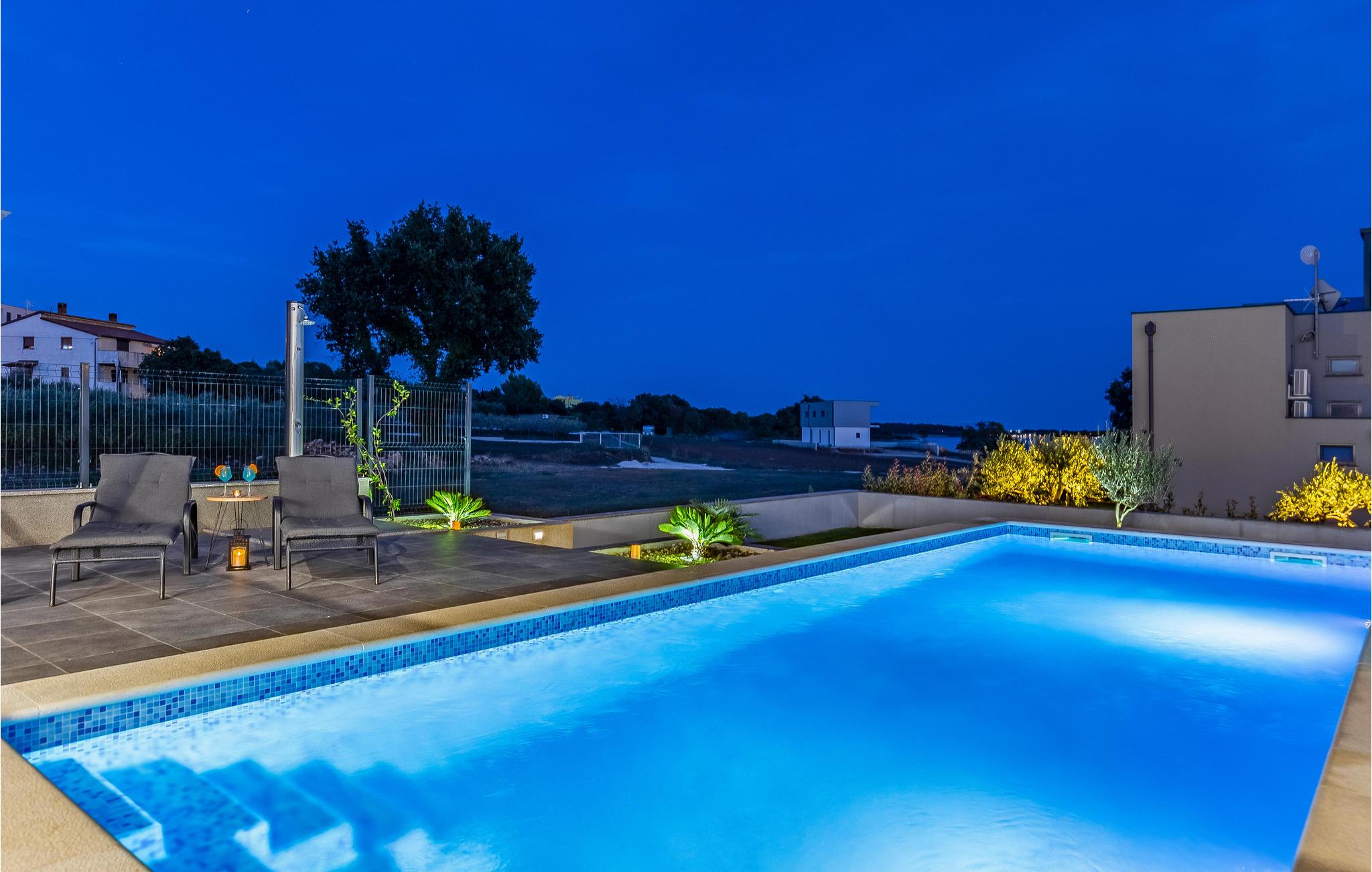 Der Außenbereich umfasst eine sehr schöne überdachte Terrasse mit Sonnendeck. Zudem führt eine Außentreppe, entlang des geräumigen Balkons im 1. Stock, hinauf zur Dachterrasse. Von hier können Sie einen fanstatischen Ausblick auf die Bucht von Pomer und Medulin genießen. Im Garten finden Ihre Kinder eine Rasenfläche zum Spielen, dennoch werden Sie sich sicherlich viele Stunden im Wasser des großen Swimmingpools aufhalten. Ein weiteres Highlight ist die Außenküche, wo Sie nach Herzenslust kochen und grillen und Ihre Mahlzeiten unter freiem Himmel einnehmen können.
