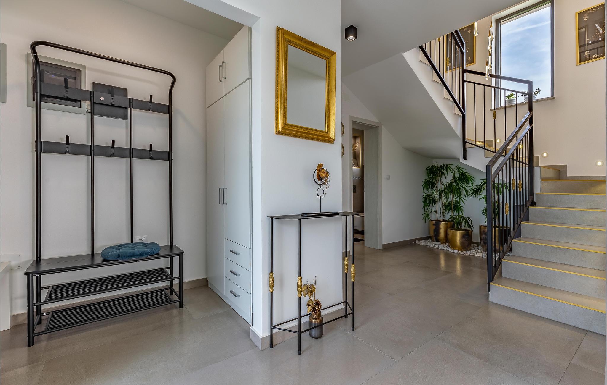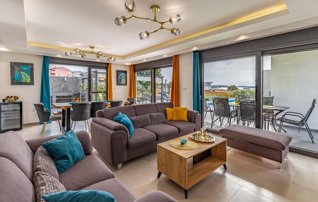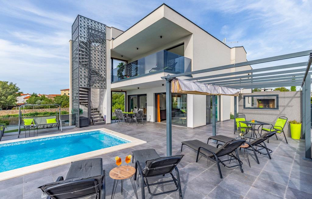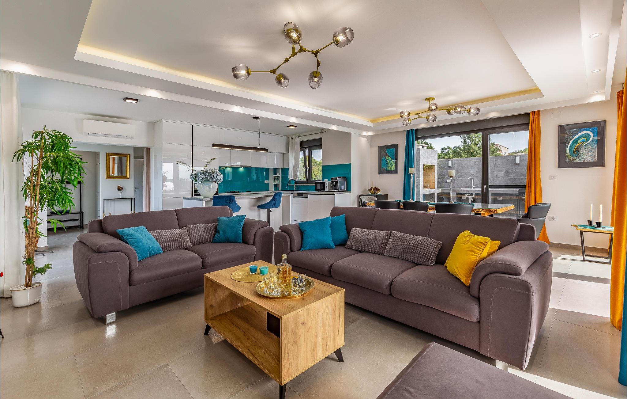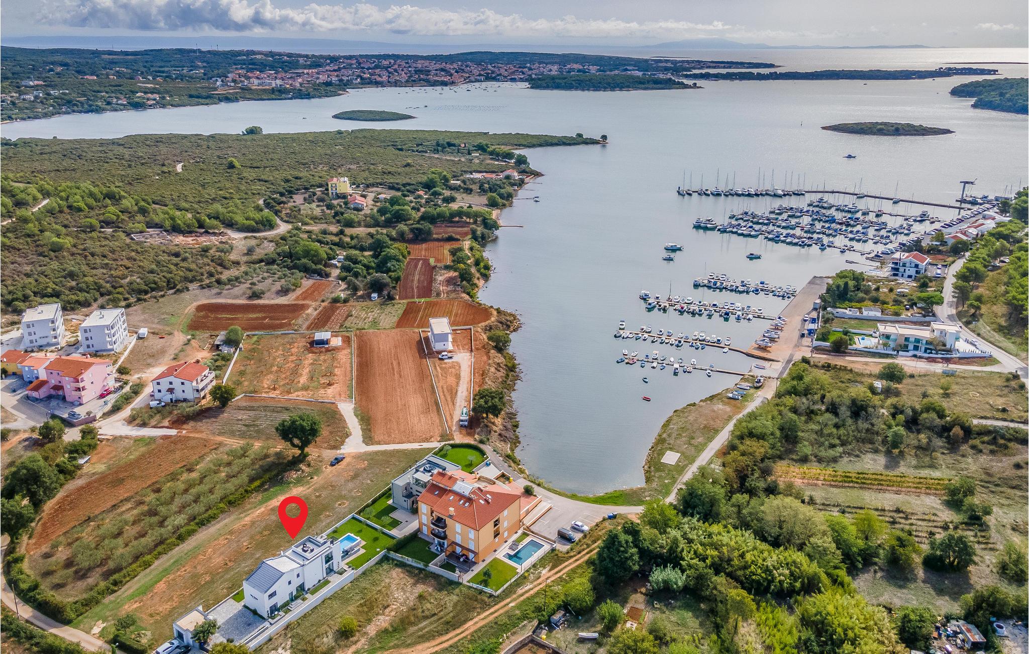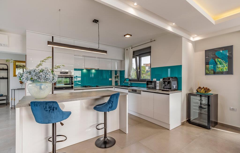 Der Außenbereich umfasst eine sehr schöne überdachte Terrasse mit Sonnendeck. Zudem führt eine Außentreppe, entlang des geräumigen Balkons im 1. Stock, hinauf zur Dachterrasse. Von hier können Sie einen fanstatischen Ausblick auf die Bucht von Pomer und Medulin genießen. Im Garten finden Ihre Kinder eine Rasenfläche zum Spielen, dennoch werden Sie sich sicherlich viele Stunden im Wasser des großen Swimmingpools aufhalten. Ein weiteres Highlight ist die Außenküche, wo Sie nach Herzenslust kochen und grillen und Ihre Mahlzeiten unter freiem Himmel einnehmen können.