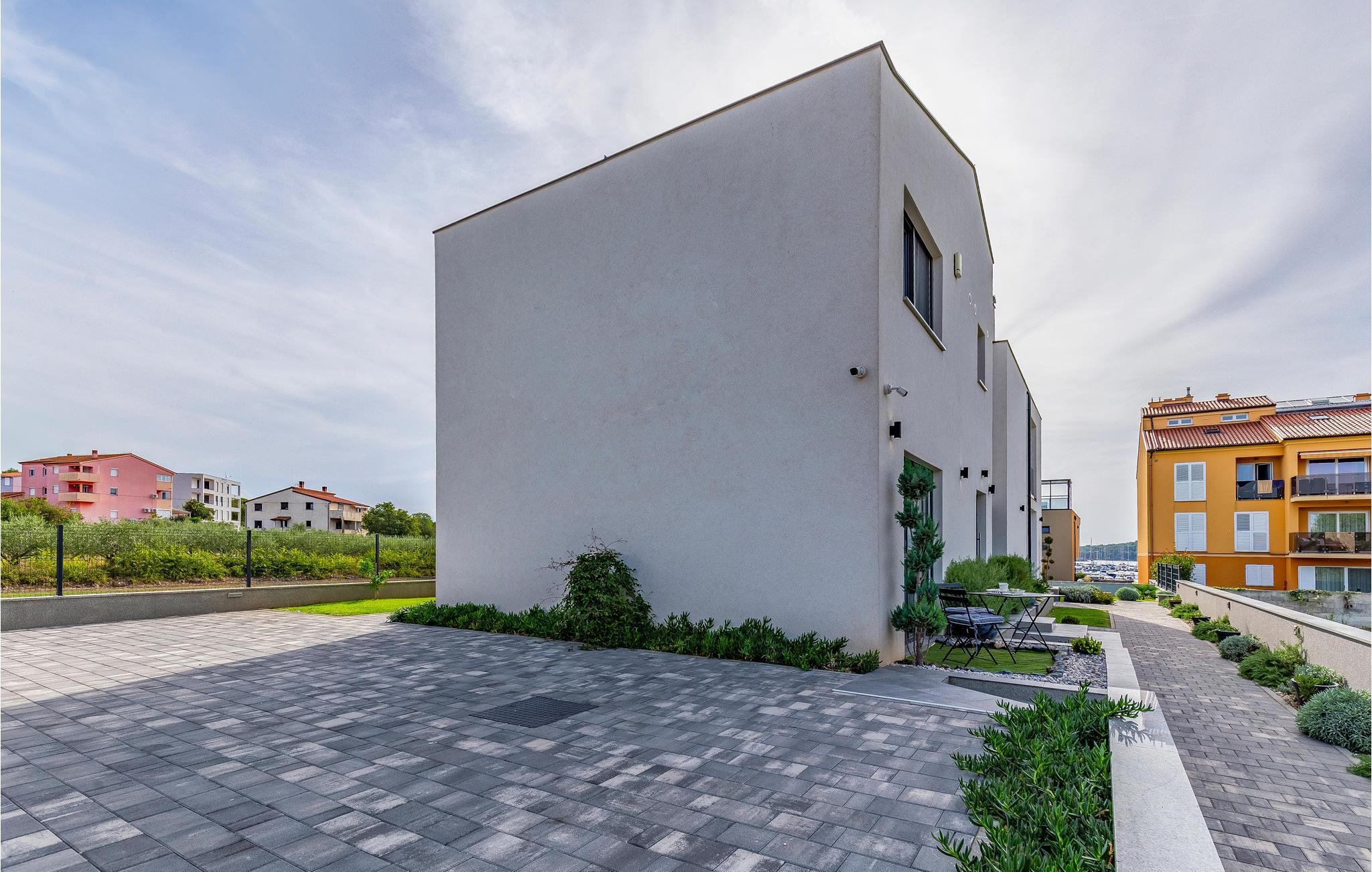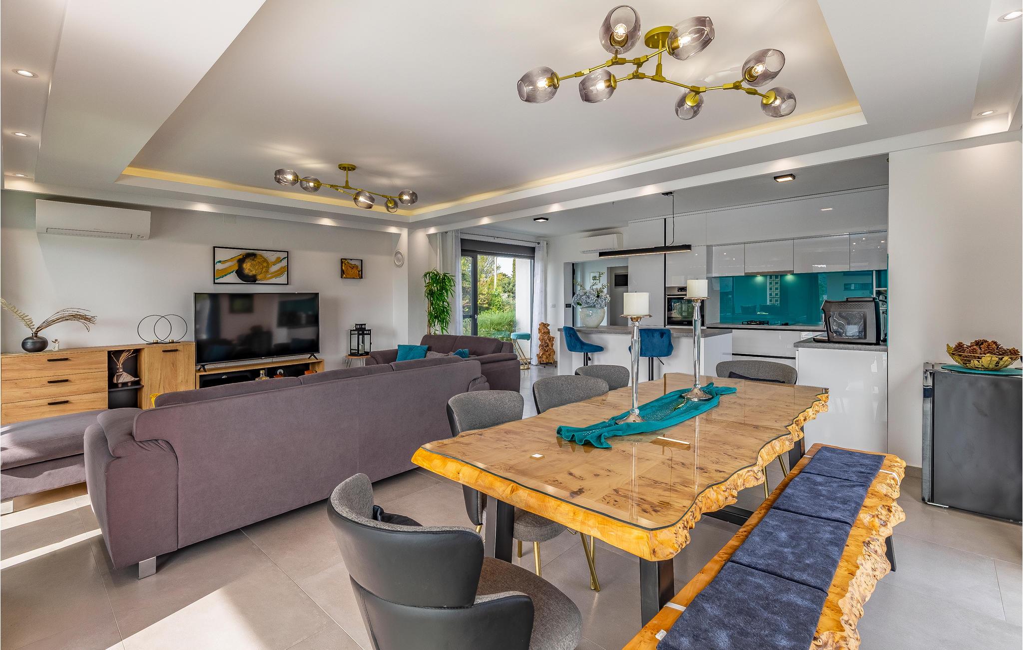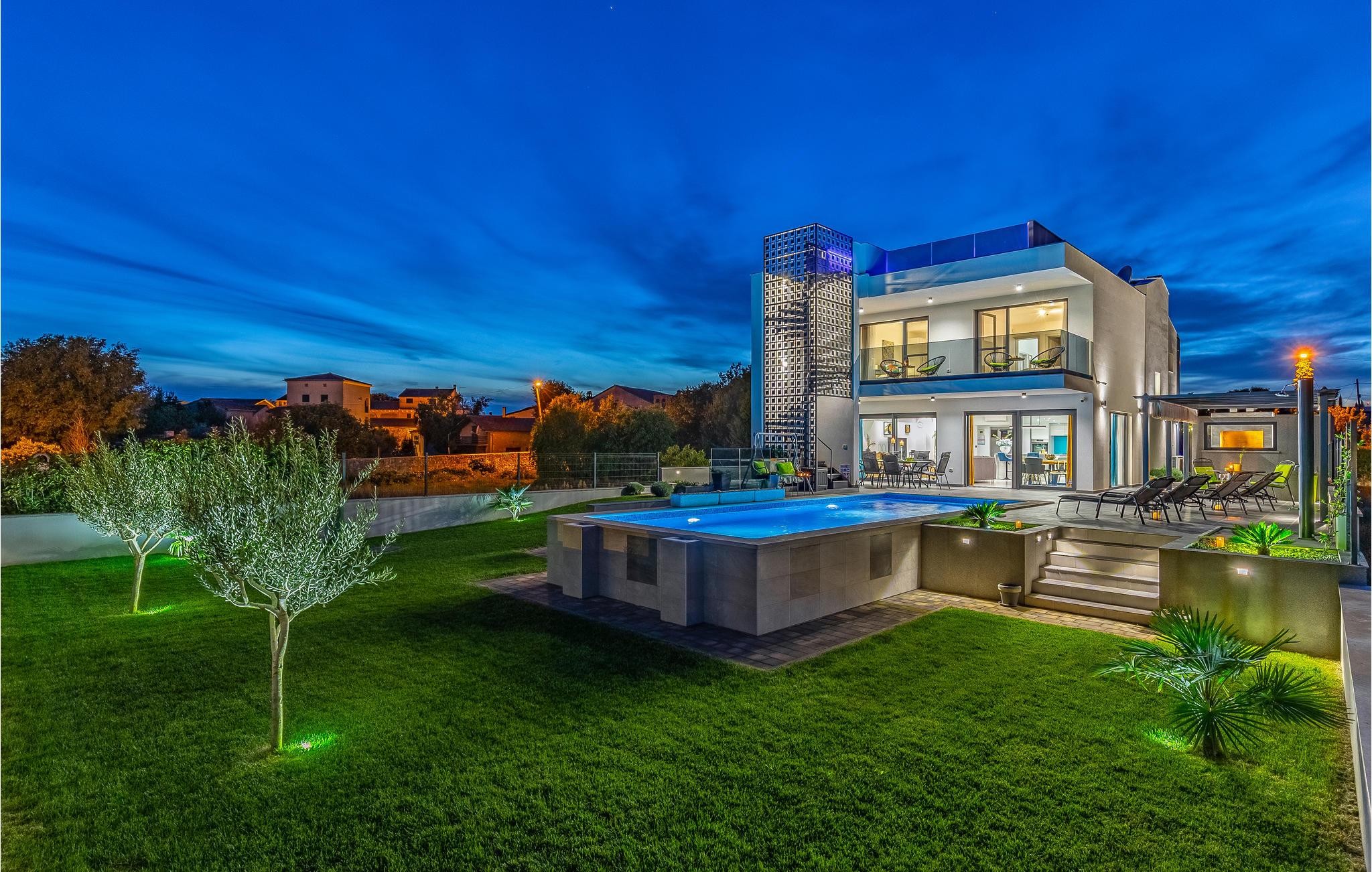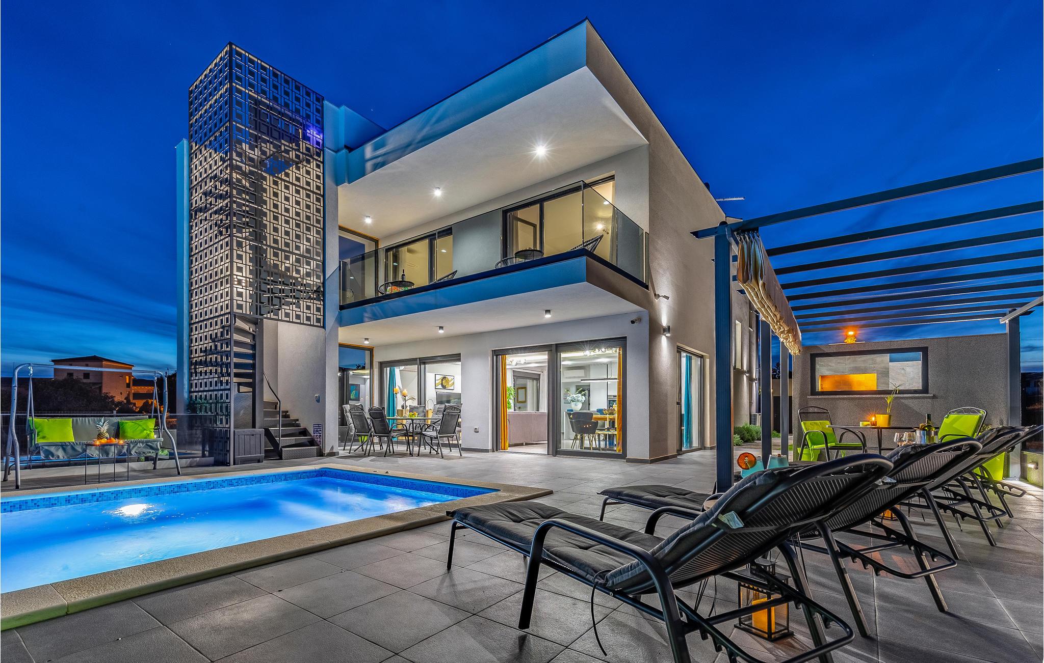 Der Außenbereich umfasst eine sehr schöne überdachte Terrasse mit Sonnendeck. Zudem führt eine Außentreppe, entlang des geräumigen Balkons im 1. Stock, hinauf zur Dachterrasse. Von hier können Sie einen fanstatischen Ausblick auf die Bucht von Pomer und Medulin genießen. Im Garten finden Ihre Kinder eine Rasenfläche zum Spielen, dennoch werden Sie sich sicherlich viele Stunden im Wasser des großen Swimmingpools aufhalten. Ein weiteres Highlight ist die Außenküche, wo Sie nach Herzenslust kochen und grillen und Ihre Mahlzeiten unter freiem Himmel einnehmen können.