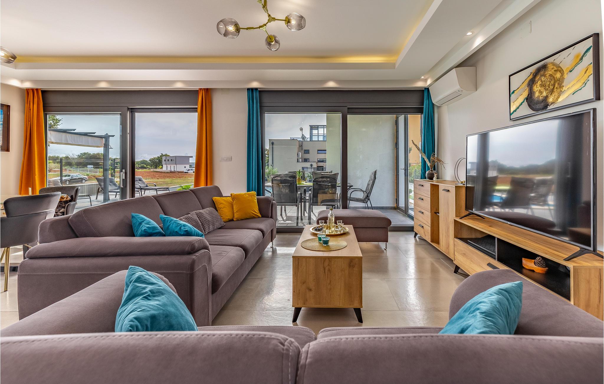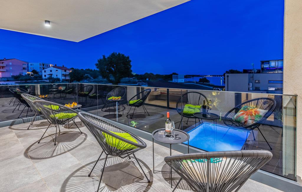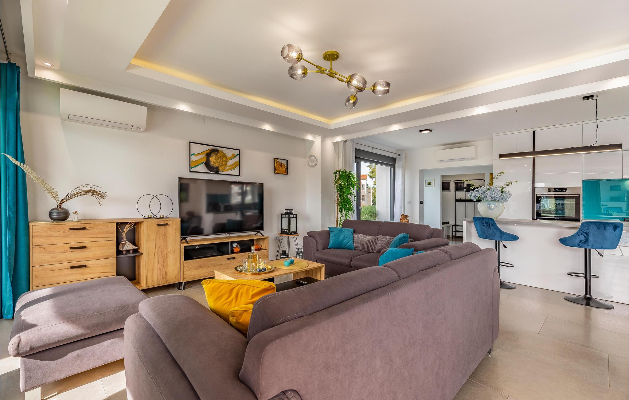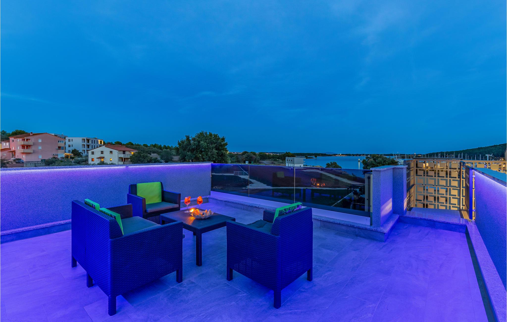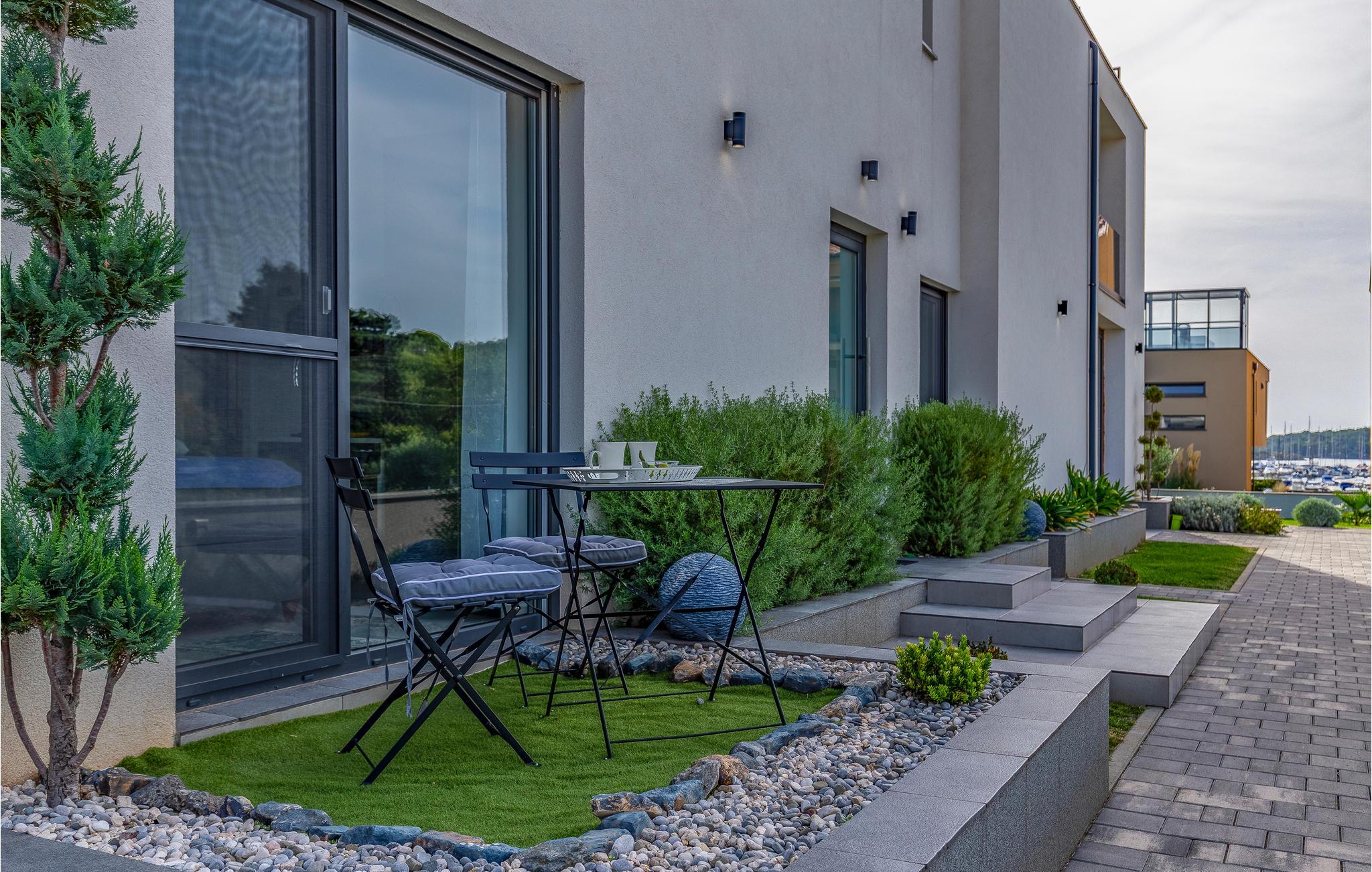 Der Außenbereich umfasst eine sehr schöne überdachte Terrasse mit Sonnendeck. Zudem führt eine Außentreppe, entlang des geräumigen Balkons im 1. Stock, hinauf zur Dachterrasse. Von hier können Sie einen fanstatischen Ausblick auf die Bucht von Pomer und Medulin genießen. Im Garten finden Ihre Kinder eine Rasenfläche zum Spielen, dennoch werden Sie sich sicherlich viele Stunden im Wasser des großen Swimmingpools aufhalten. Ein weiteres Highlight ist die Außenküche, wo Sie nach Herzenslust kochen und grillen und Ihre Mahlzeiten unter freiem Himmel einnehmen können.
