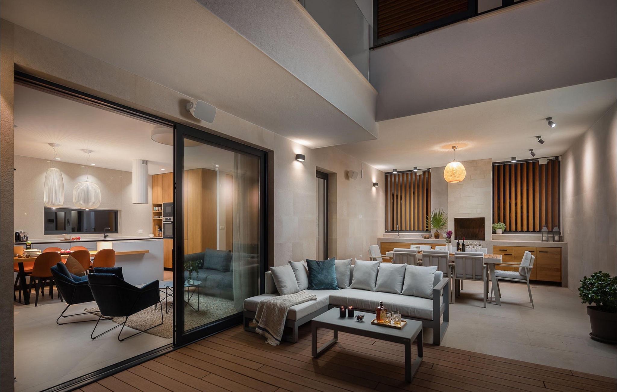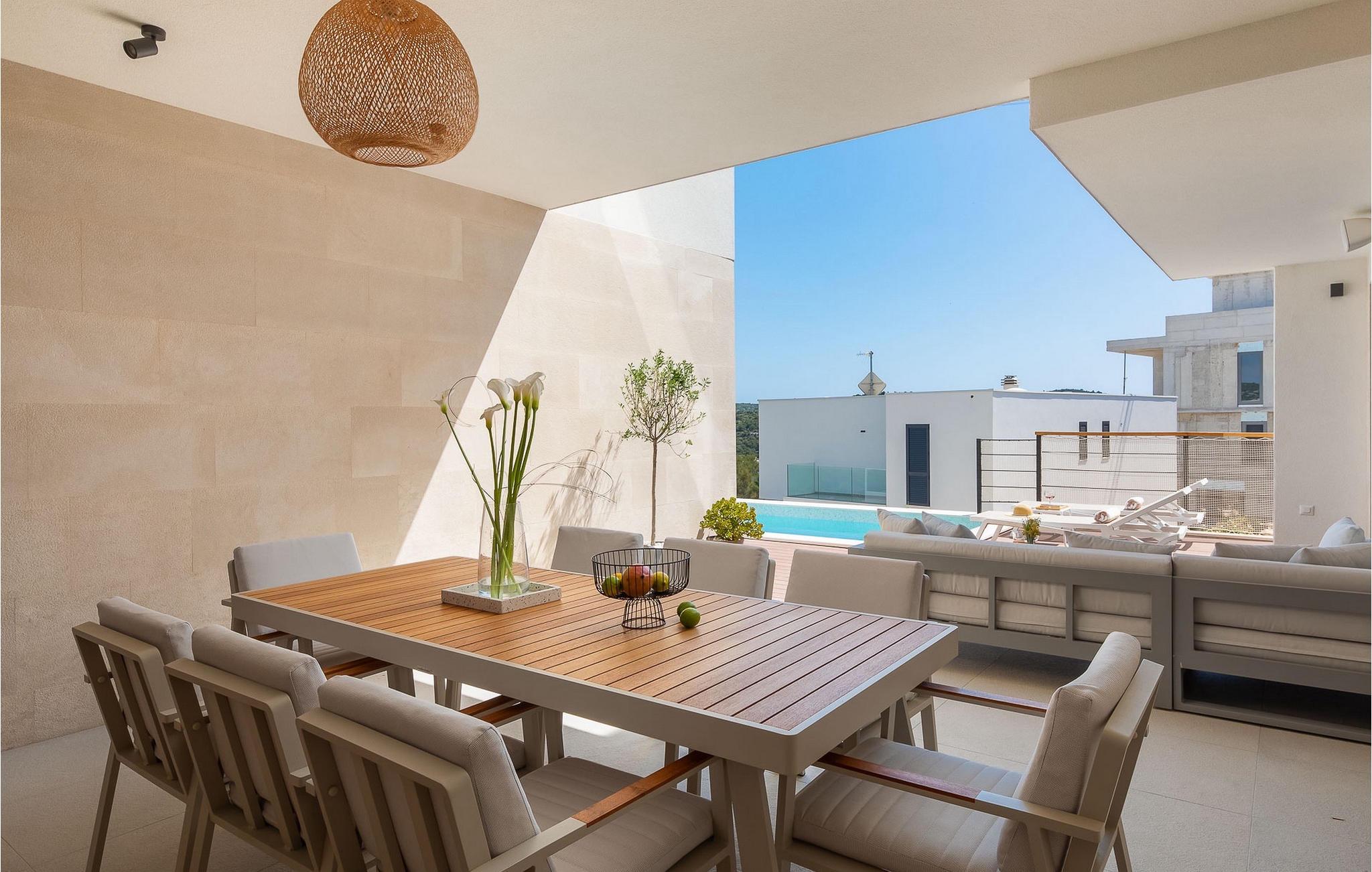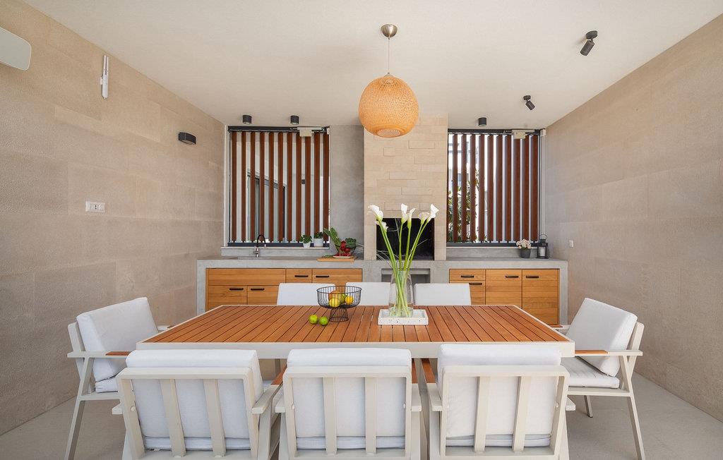 Holzdetails und Farbakzente begleiten die Dekoration dieser Villa, insbesondere den offenen Grundriss des Erdgeschosses mit Wohnzimmer, Küche und Esszimmer. Vom Wohnzimmer aus gibt es auch einen direkten Ausgang zur Außenterrasse. Familien mit Kindern werden sich auch über die Option eines Schlafzimmers im Erdgeschoss freuen, die noch mehr Komfor bietet. Es ist wichtig zu beachten, dass in dieser Villa sogar drei Schlafzimmer über ein eigenes Bad verfügen, für maximalen Komfort während Ihres Aufenthalts, wobei ein separates Badezimmer und 2 weitere Toiletten ebenfalls vorhanden sind.