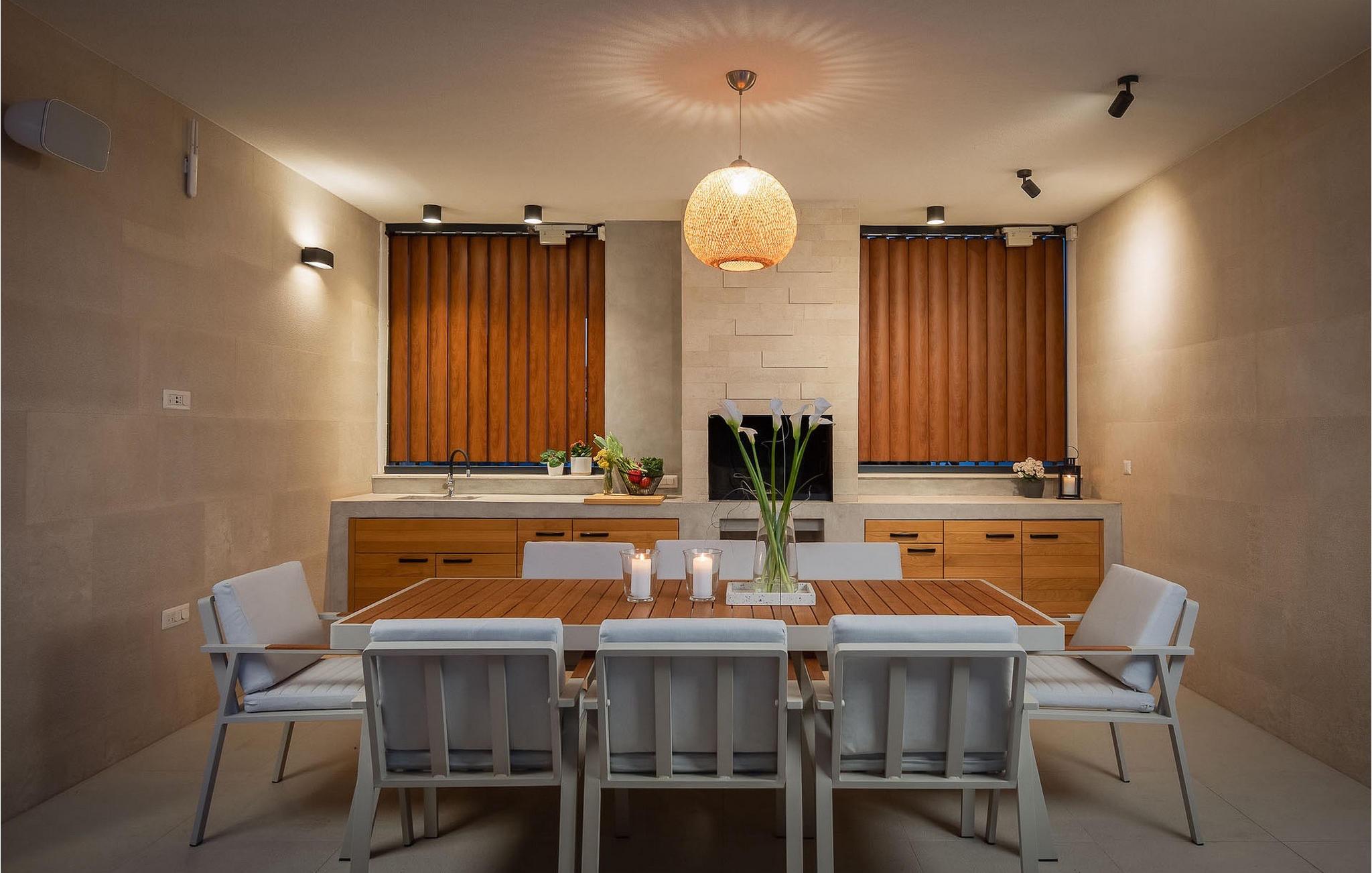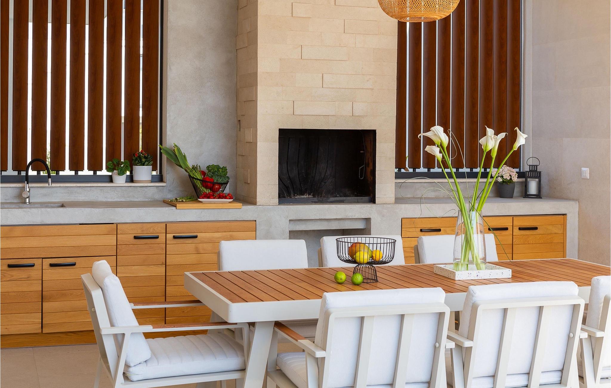 Genießen Sie im Erdgeschoss den privaten Pool mit Hydromassage mit einem unumgänglichen Blick auf das Meer. Nach der Abkühlung können Sie sich auf den Liegestühlen sonnen oder auf den Gartenmöbeln ausruhen. Ob tagsüber oder abends, die Terrasse am Pool mit großem Esstisch ist perfekt für gemeinsame Mahlzeiten, die Sie sofort in der ausgestatteten Außenküche zubereiten können.