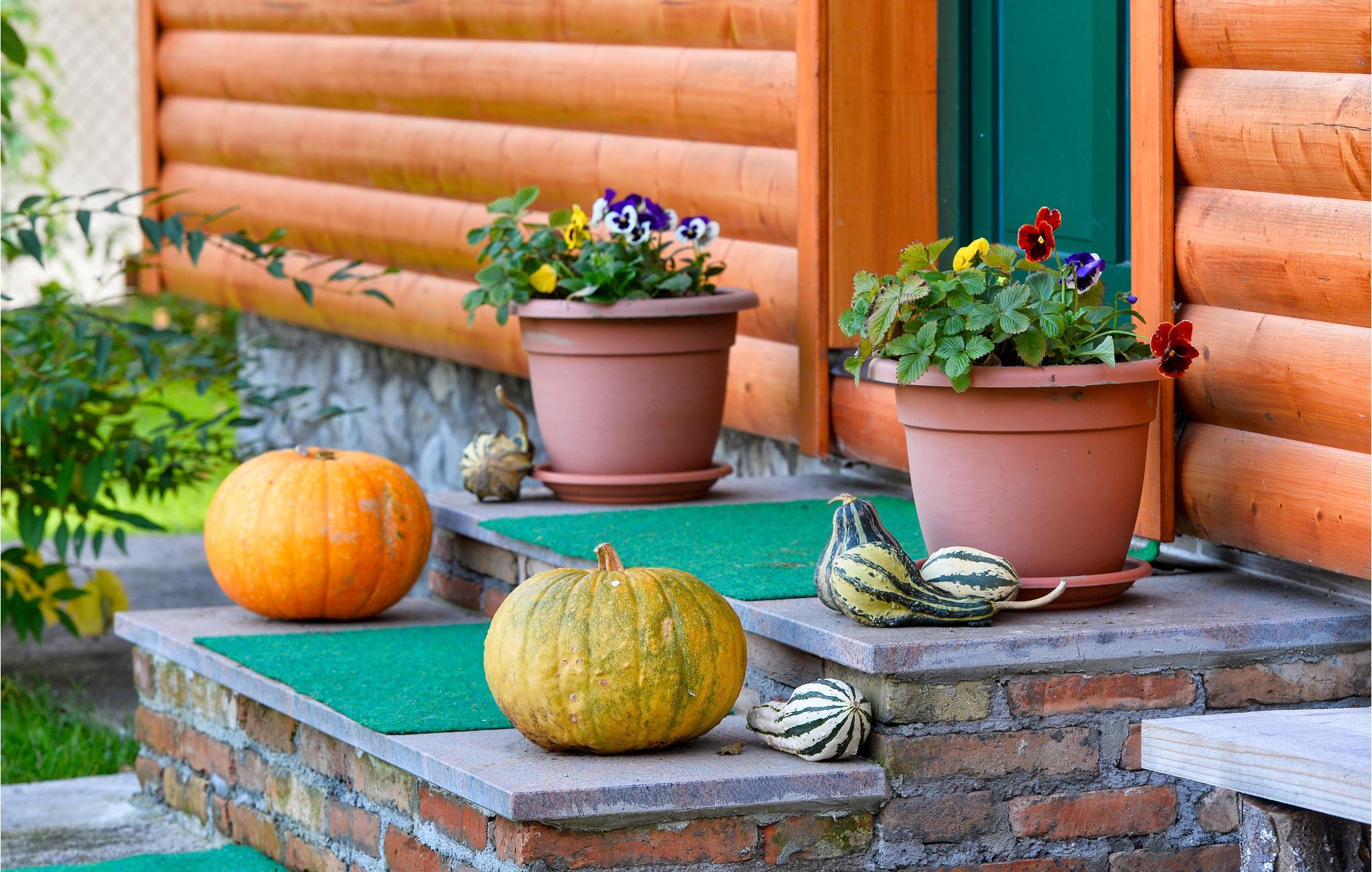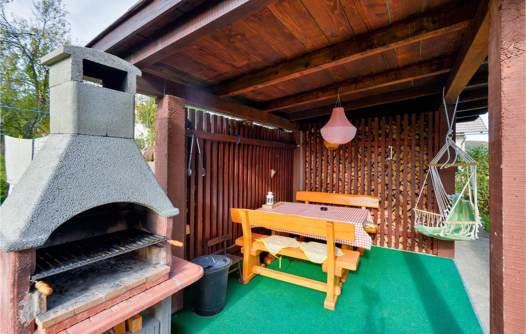 Vor der Hütte, die ansehnlich mit Holz verkleidet ist, finden Sie eine kleine Essecke mit Grillofen und einen gepflegten, netten Garten.