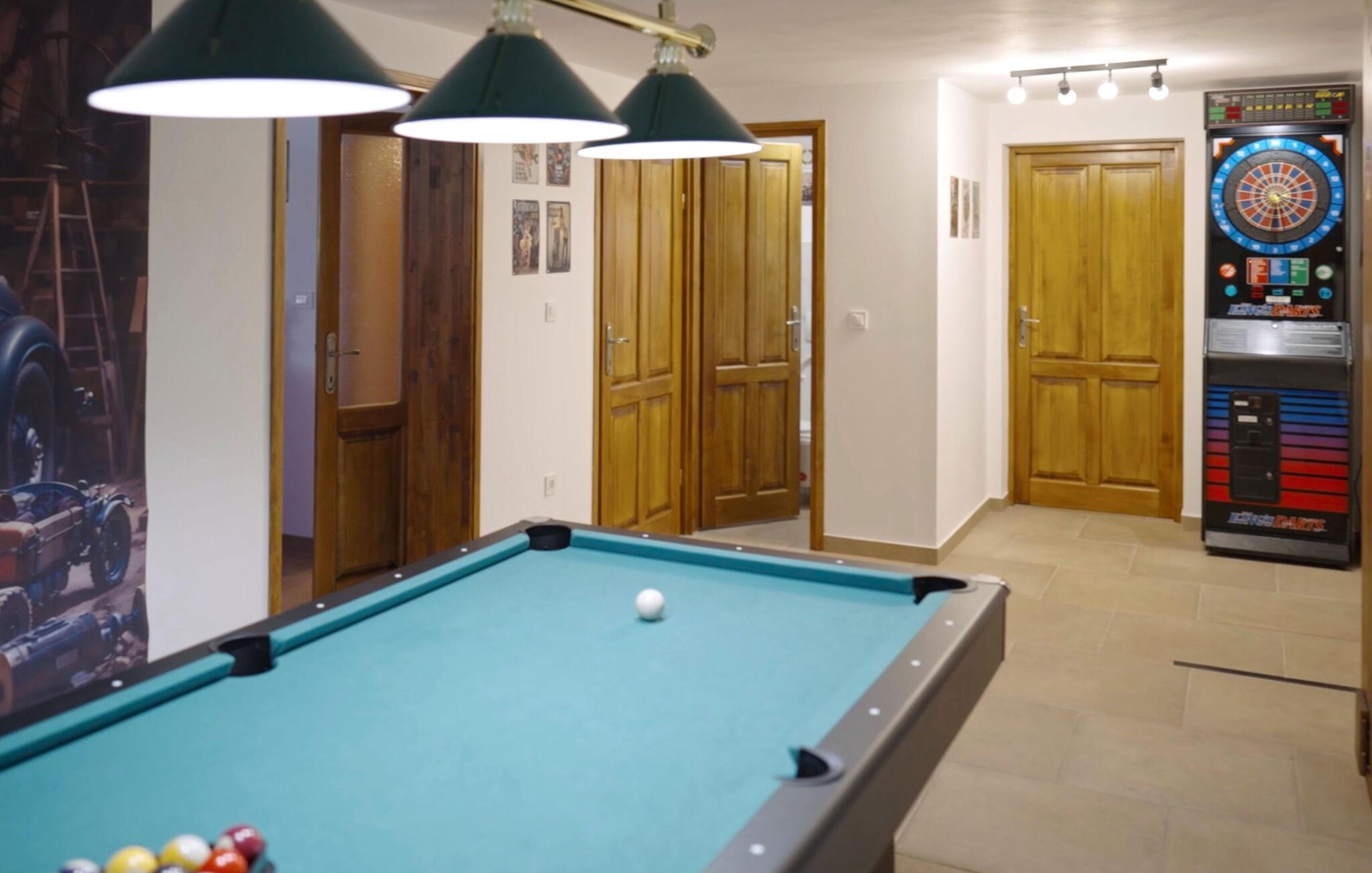 Der Außenbereich des Hauses ist ebenso beeindruckend wie der Innenbereich. Der große Swimmingpool lädt Sie zum Erfrischen und Entspannen im Grünen ein, während der Whirlpool für zusätzliche Entspannung sorgt. Für diejenigen, die einen aktiven Urlaub genießen, gibt es ein Spielzimmer mit verschiedenen Einrichtungen, darunter Billard.
