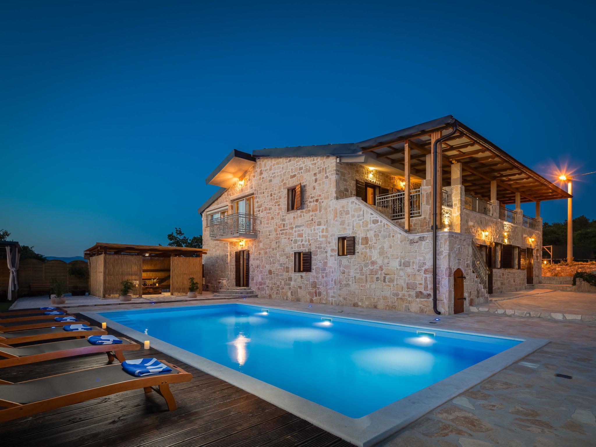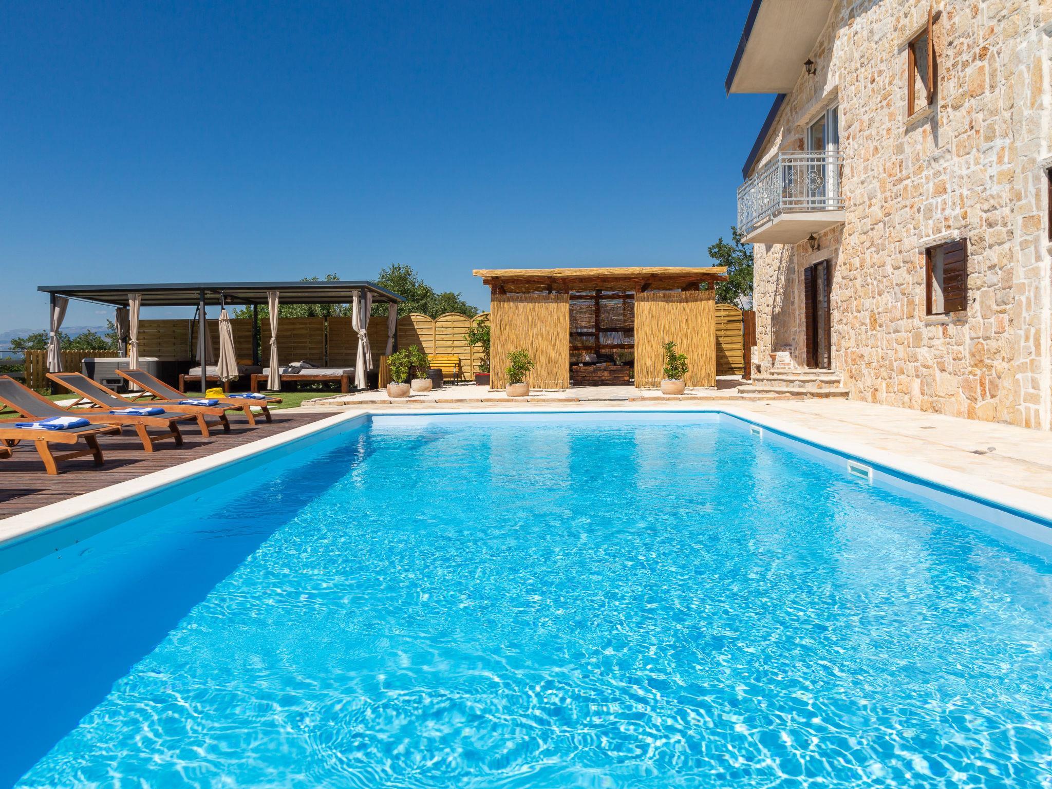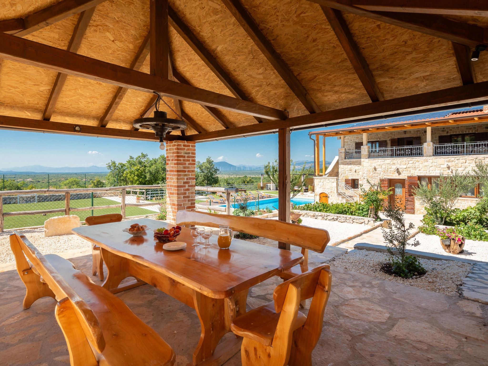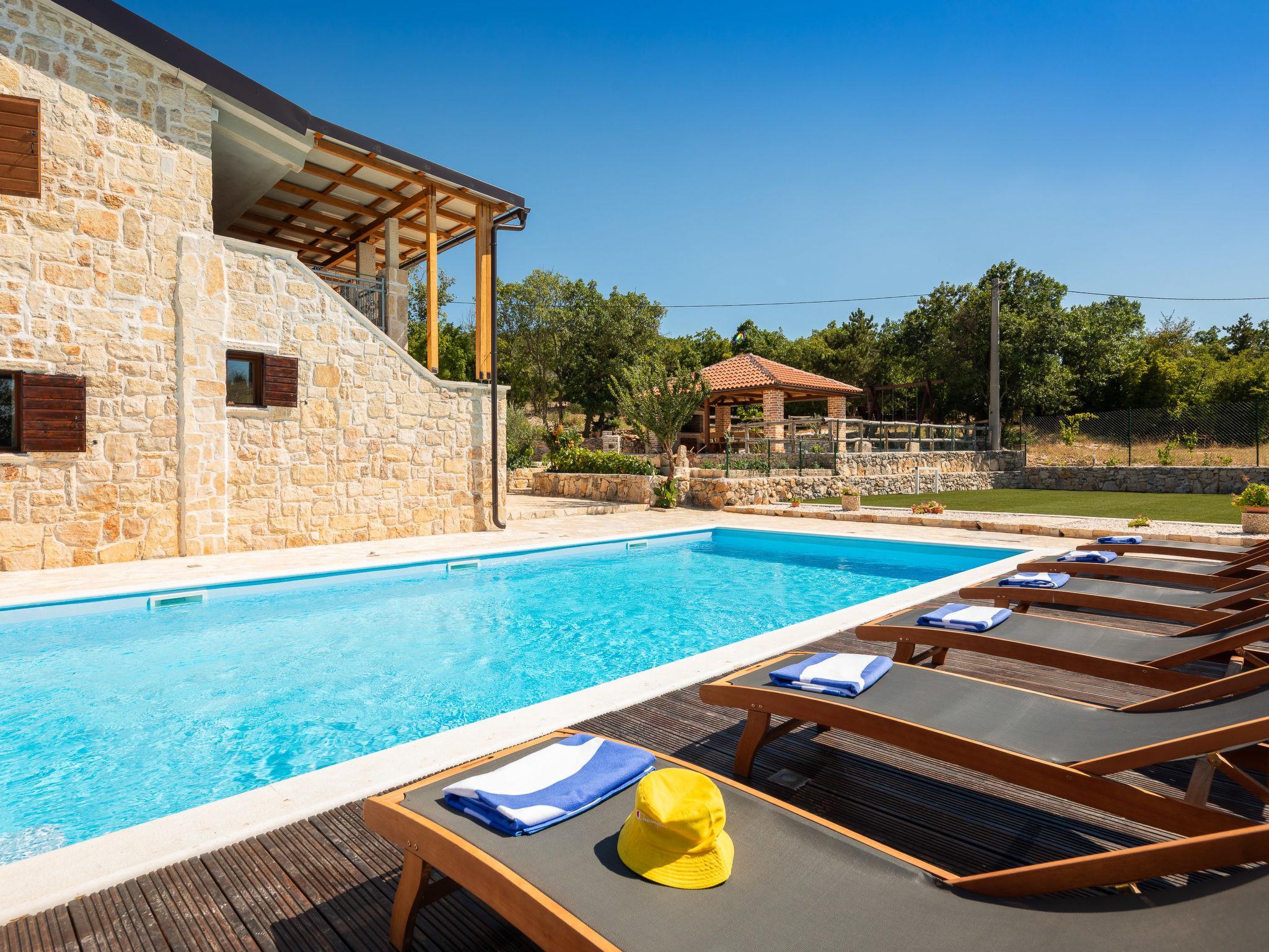Lukar 3 km von Oklaj: Einfamilienhaus "Perva". Ruhige, sonnige Lage, 48 km vom Meer, im Grünen. Zur Alleinbenutzung: Grundstück 3'500 m2 (eingezäunt), Schwimmbad eckig, beheizt (10 x 5 m, 150 cm tief, saisonale Verfügbarkeit: 15.Mai. - 30.Sep.) mit Innentreppe. Aussendusche, Sprudelbad, Tischtennis, Laube (30 m2), Terrasse (30 m2), Gartenmöbel, Grill, Kinderspielplatz (Schaukel). Im Hause: Internetzugang, Fitnessraum, Trampolin, Waschmaschine, Wäschetrockner. Parkplatz (für 6 Autos) beim Haus auf dem Grundstück. Einkaufsgeschäft 3 km, Restaurant 17 km, Café 3 km, Bushaltestelle 3.5 km, Kieselstrand 48 km. Radweg 2 km. Nahe gelegene Sehenswürdigkeiten: NP Krka 28 km.