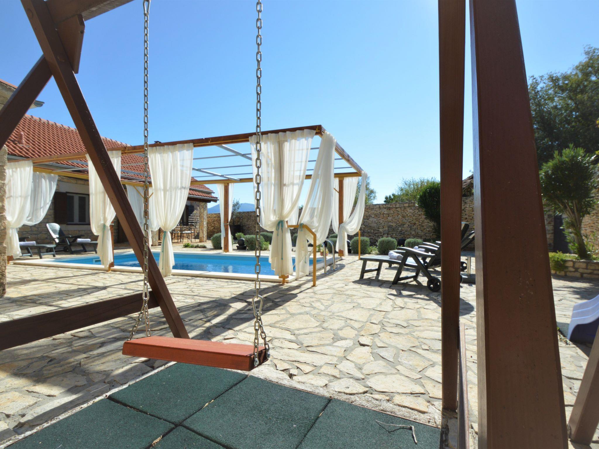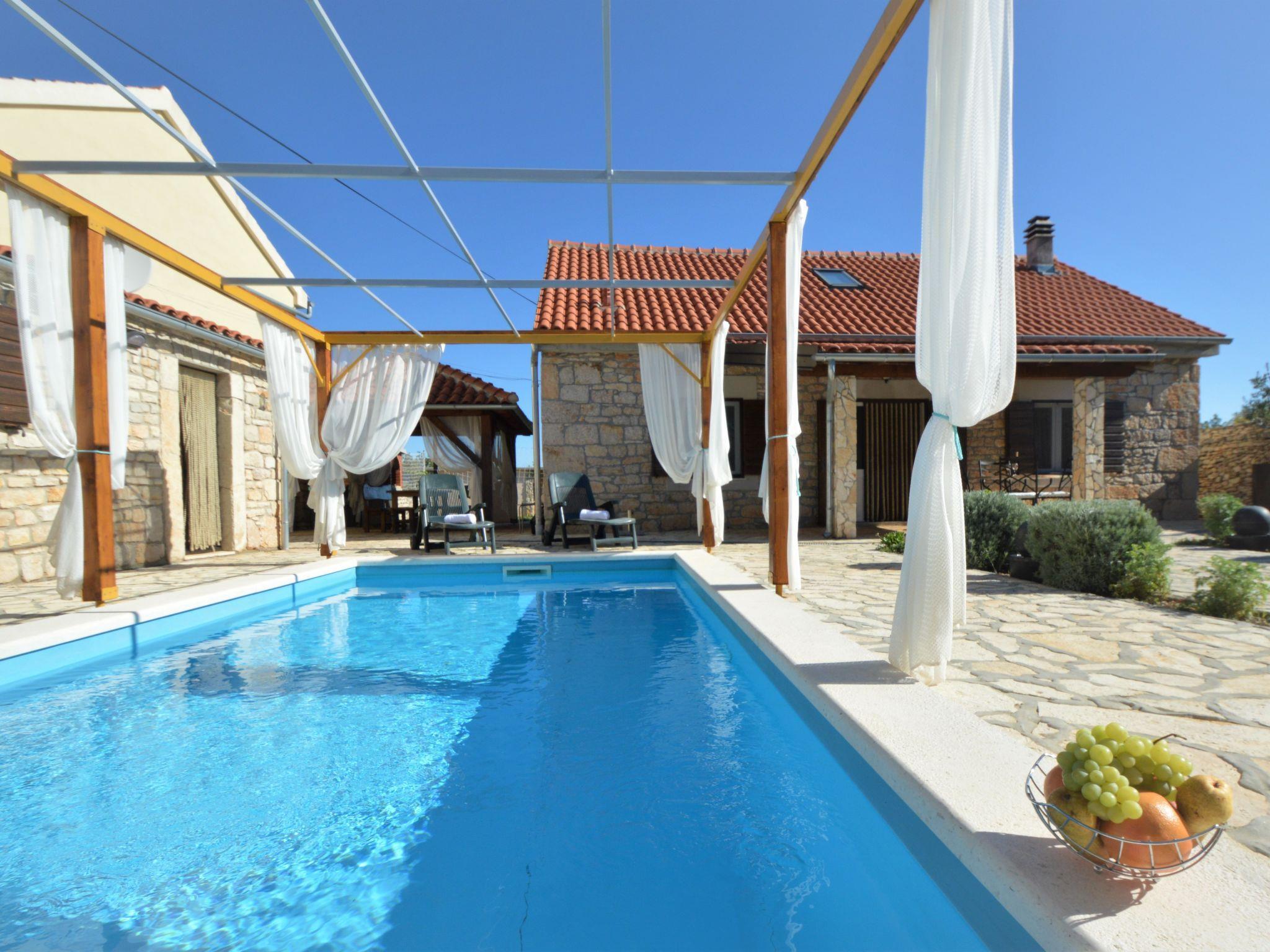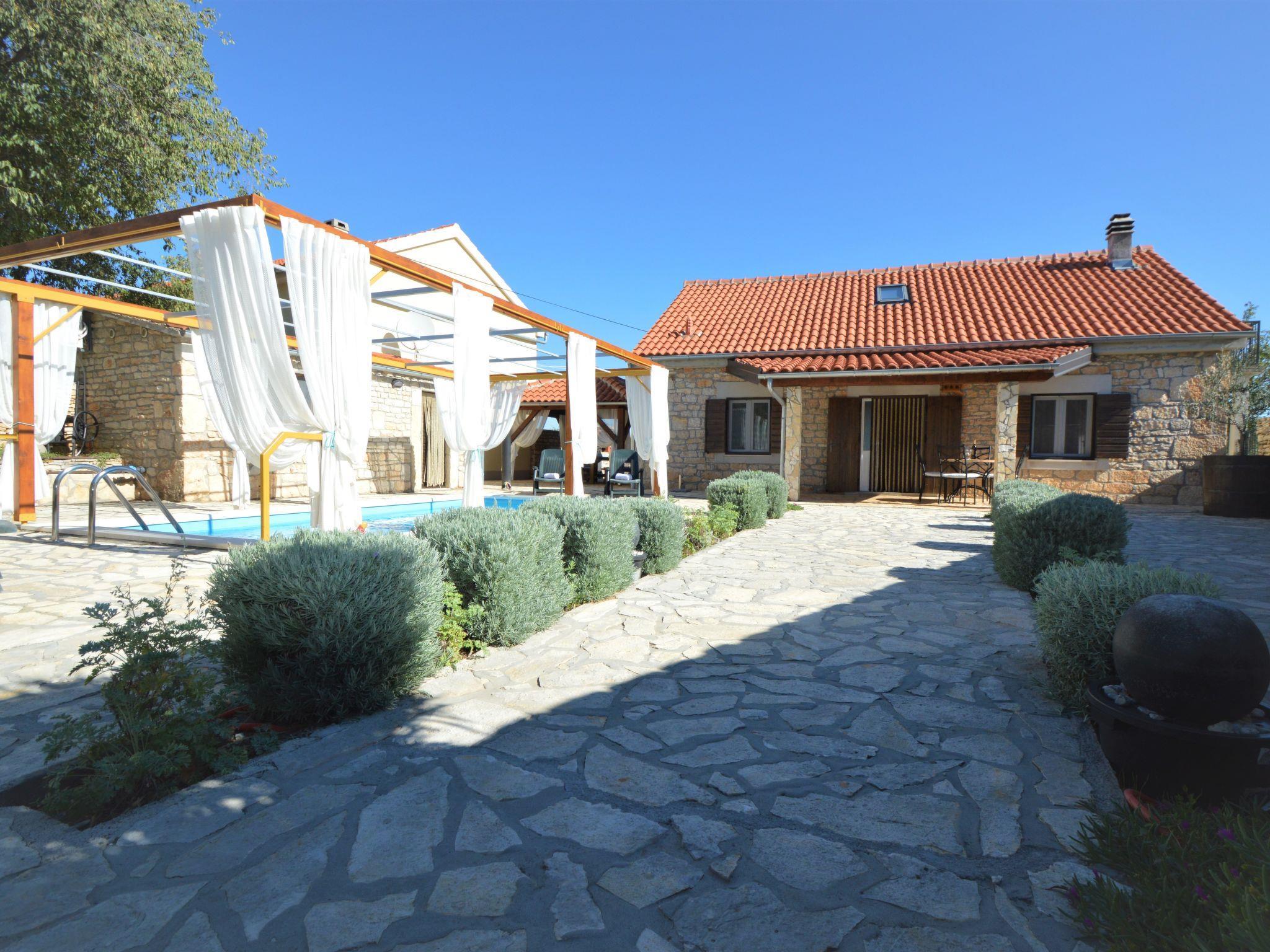 Bogatic 10 km von Oklaj: Kinderfreundliches, schönes Einfamilienhaus "Marija", auf 2 Stockwerken. Ruhige, sonnige Lage, 44 km vom Meer. Zur Alleinbenutzung: Grundstück 700 m2 (eingezäunt), Schwimmbad eckig (6 x 3 m, 18 m2, 150 cm tief, saisonale Verfügbarkeit: 15.Apr. - 15.Okt.). Aussendusche, Boccia, Badminton, Volleyballfeld, Terrasse (6 m2), Gartenmöbel, Grill, Kinderspielplatz (Rutschbahn, Schaukel). Im Hause: Internetzugang, Sauna, Billard, Waschmaschine. Zur Verfügung: Fahrräder (2), Kinderfahrräder (1). Zufahrt bis zum Haus (800 m Naturweg). Parkplatz (für 2 Autos) beim Haus auf dem Grundstück. Einkaufsgeschäft 10 km, Restaurant 6 km, Bushaltestelle 22.7 km, Kieselstrand 44 km. Nahe gelegene Sehenswürdigkeiten: NP Krka 6 km. Jugendgruppen nur auf Anfrage. Bei Jugendgruppen wird bei der Ankunft eine doppelte Kaution verlangt. Das Organisieren einer Party ist nicht erlaubt. Kleines Haus (15 m2) am Pool, mit Sauna und Klimaanlage.