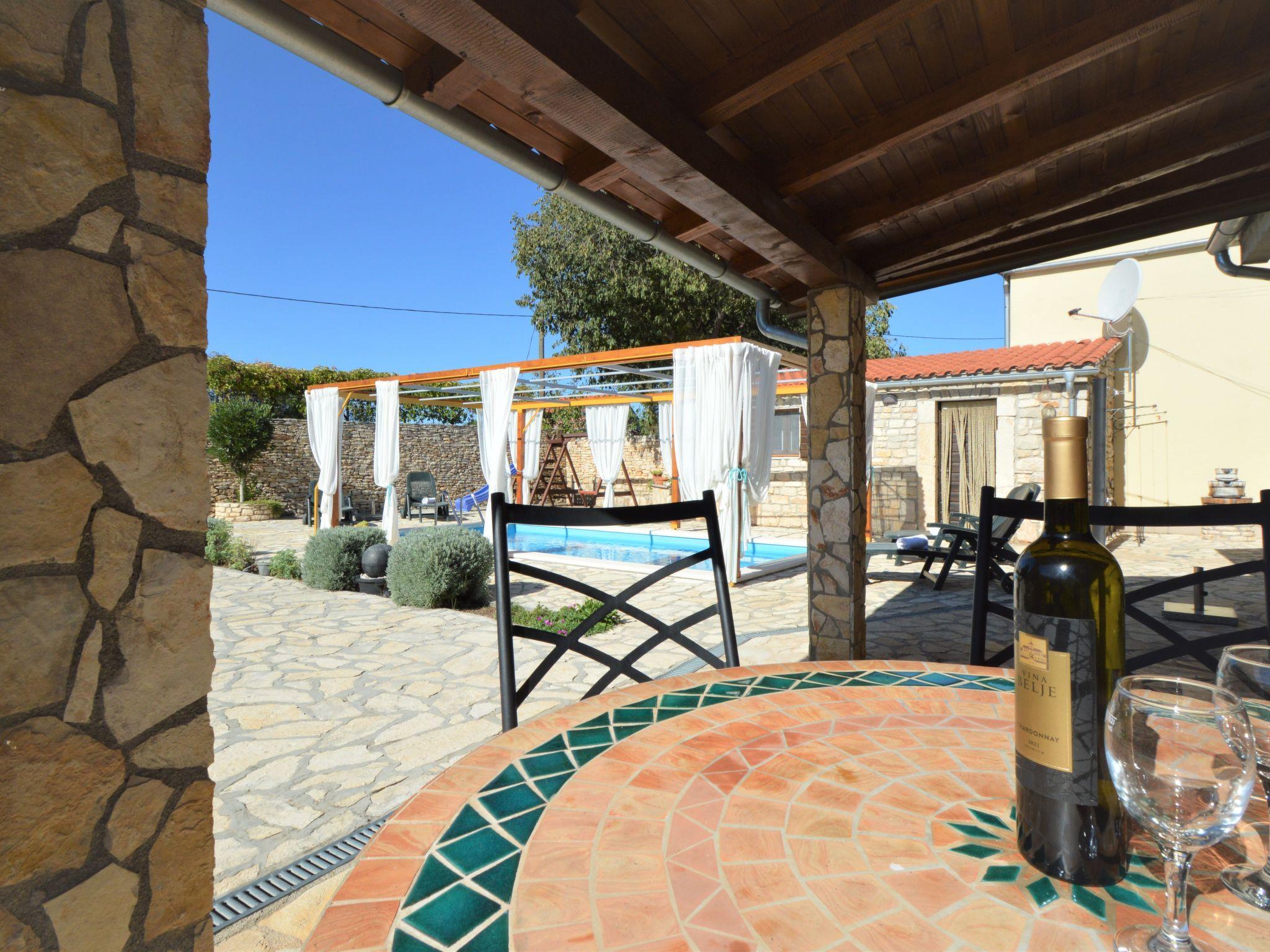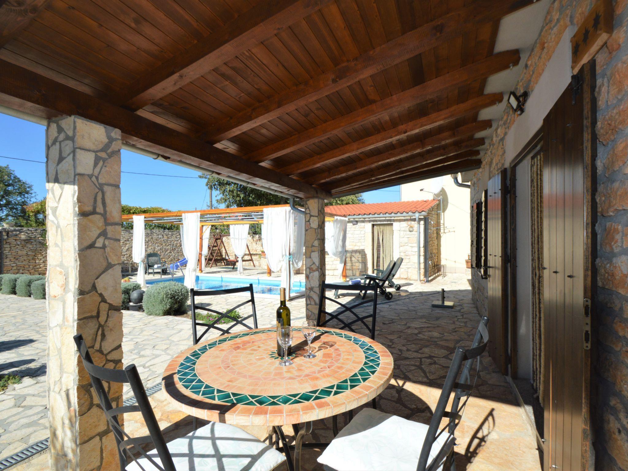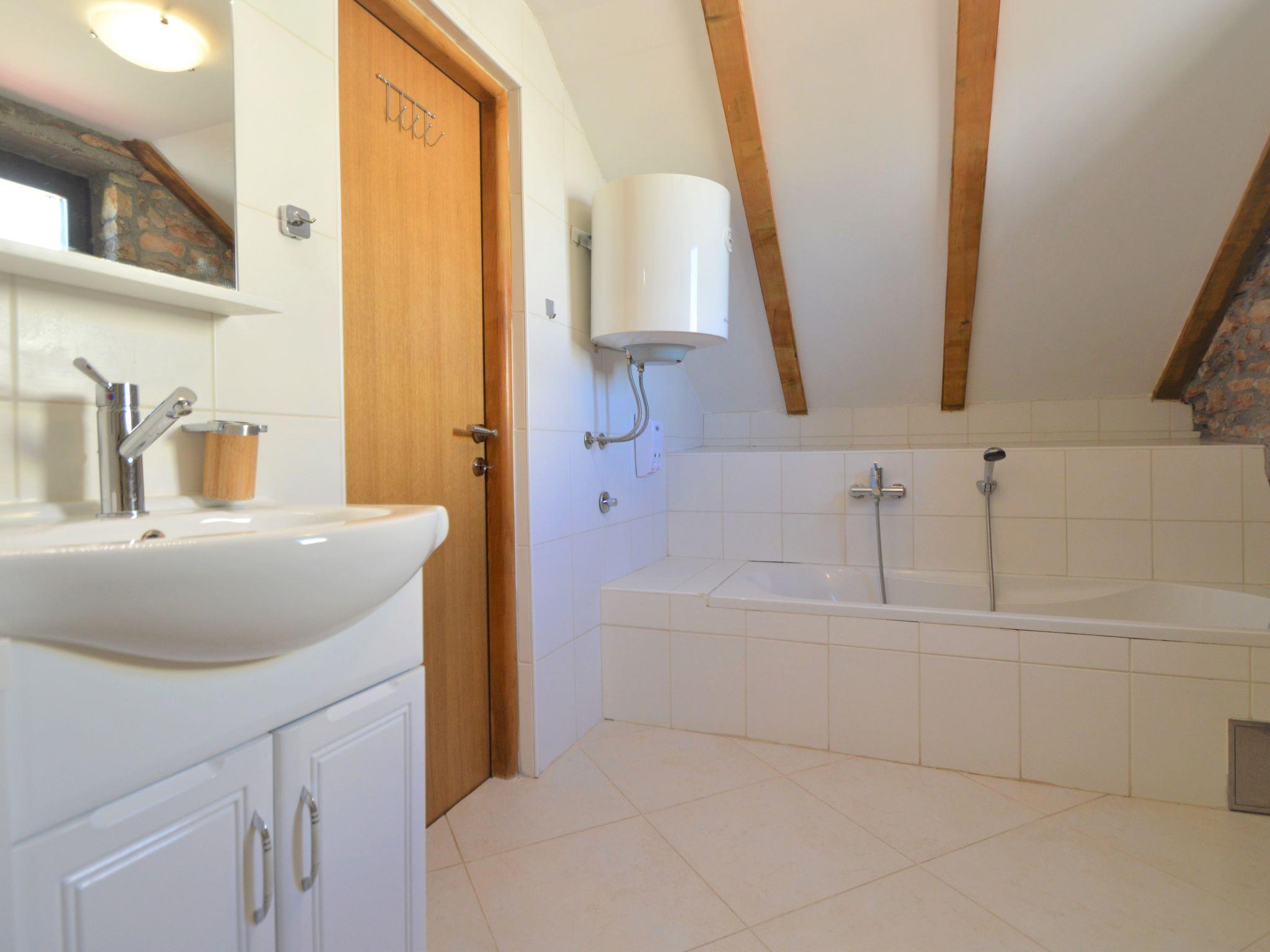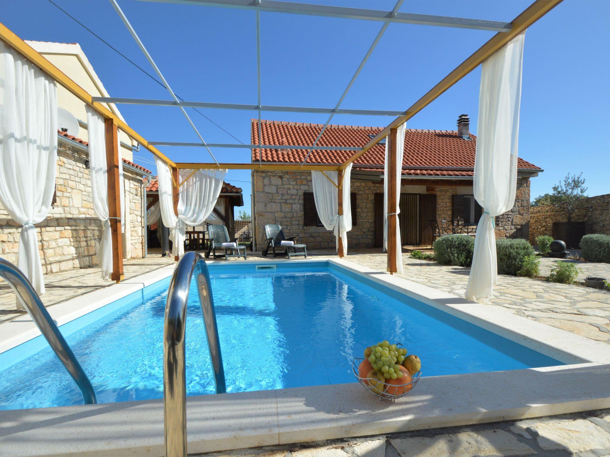 Bogatic 10 km von Oklaj: Kinderfreundliches, schönes Einfamilienhaus "Marija", auf 2 Stockwerken. Ruhige, sonnige Lage, 44 km vom Meer. Zur Alleinbenutzung: Grundstück 700 m2 (eingezäunt), Schwimmbad eckig (6 x 3 m, 18 m2, 150 cm tief, saisonale Verfügbarkeit: 15.Apr. - 15.Okt.). Aussendusche, Boccia, Badminton, Volleyballfeld, Terrasse (6 m2), Gartenmöbel, Grill, Kinderspielplatz (Rutschbahn, Schaukel). Im Hause: Internetzugang, Sauna, Billard, Waschmaschine. Zur Verfügung: Fahrräder (2), Kinderfahrräder (1). Zufahrt bis zum Haus (800 m Naturweg). Parkplatz (für 2 Autos) beim Haus auf dem Grundstück. Einkaufsgeschäft 10 km, Restaurant 6 km, Bushaltestelle 22.7 km, Kieselstrand 44 km. Nahe gelegene Sehenswürdigkeiten: NP Krka 6 km. Jugendgruppen nur auf Anfrage. Bei Jugendgruppen wird bei der Ankunft eine doppelte Kaution verlangt. Das Organisieren einer Party ist nicht erlaubt. Kleines Haus (15 m2) am Pool, mit Sauna und Klimaanlage.