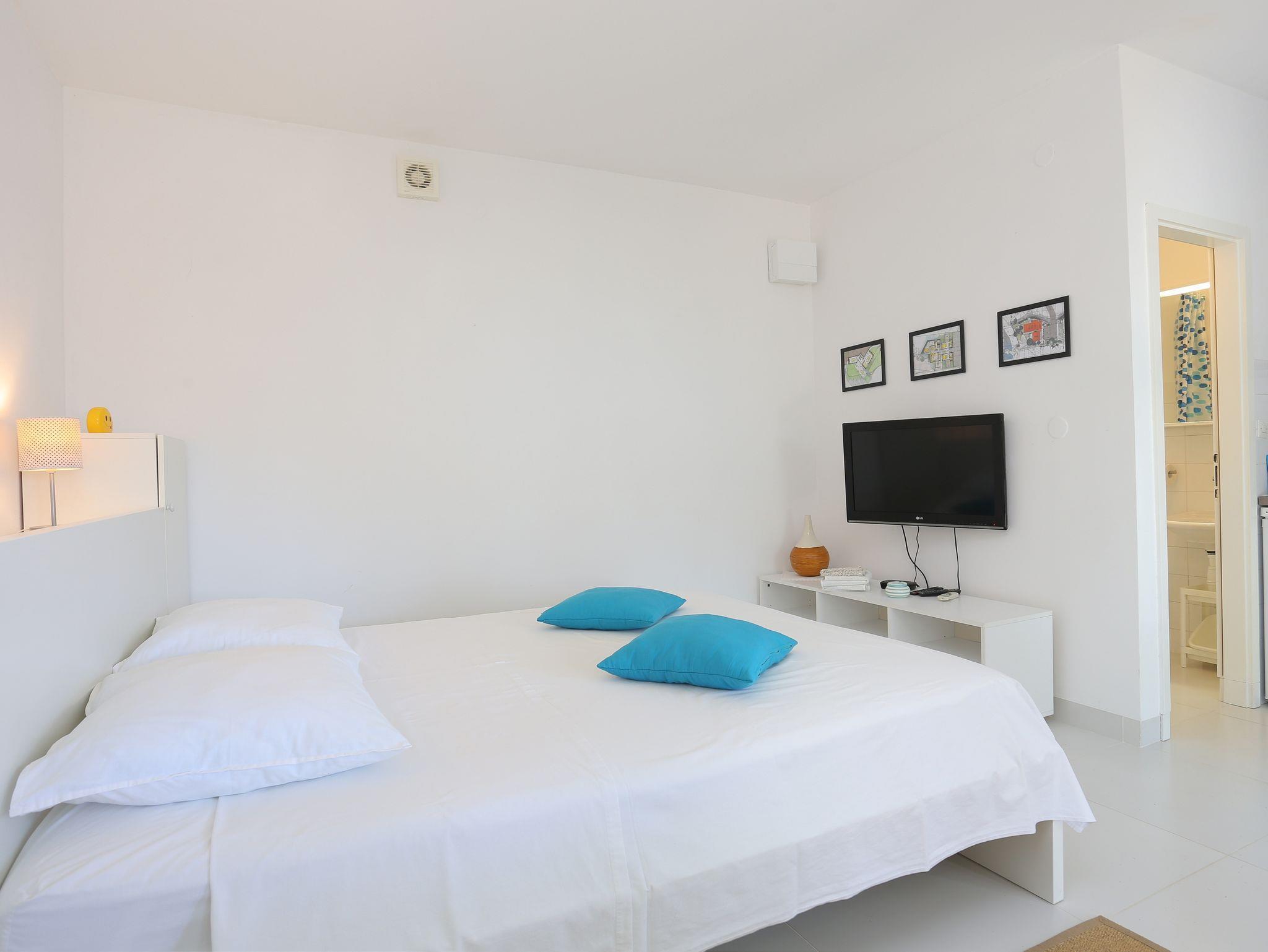 Studio bietet Platz für 2 Gäste. Die Betten sind in Schlafzimmern, die es 1 gibt, innerhalb einer Gesamtfläche von 20m2, angeordnet. Die Gäste haben eine eigene Terrasse zur Verfügung, auf der sie in warmen Sommernächten genießen können. Das Studio-Apartment bietet Meerblick. Es ist erlaubt, Speisen auf dem Gemeinschafts-Grill vorzubereiten. In der Unterkunftseinheit besteht die Möglichkeit des Mitbringens von Haustieren gegen Aufpreis. IM PREIS INBEGRIFFEN: Kurtaxe, Endreinigung, Klimatisierung, Parkplatz, Internet, Bootsanlegeplatz. VERBINDLICHE ZUSÄTZLICHE KOSTEN: Aufzahlung für Kurzaufenthalte (prozentualer Zuschlag pro Nächtigungsanzahl: 30% - 1, 20% - 2, 10% - 3). UNVERBINDLICHE ZUSÄTZLICHE KOSTEN: Haustiere (5,00 € pro Nacht). Die Verfügbarkeit zusätzlicher Dienstleistungen in Ihrem reservierten Termin und die Preise derselben (falls nicht aufgeführt) müssen im Voraus überprüft werden. Zusätzliche Dienstleistungen die in der Zahlungsaufforderung nicht aufgeführt sind werden direkt beim Vermieter bezahlt, angenommen der Gast nutzt auch diese. Ermäßigung auf den Grundpreis: Gratistag 21=19 (bei einem Aufenthalt von 21 Tagen oder mehr erhalten Sie 2 Gratistage für den Aufenthalt bis 31.12.26).
