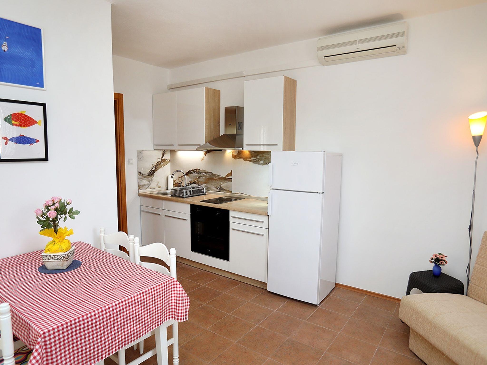 Ferienwohnung bietet Platz für 4 Gäste. Die Betten sind in Schlafzimmern, die es 1 gibt, und in Wohnzimmer, innerhalb einer Gesamtfläche von 33m2, angeordnet. Die Gäste haben einen eigenen Balkon zur Verfügung, auf der sie in warmen Sommernächten genießen können. IM PREIS INBEGRIFFEN: Kurtaxe, Endreinigung, Klimatisierung, Parkplatz, Garage, Internet, Kinderbett, Bügeleisen, Bügelbrett, Föhn. VERBINDLICHE ZUSÄTZLICHE KOSTEN: Aufzahlung für Kurzaufenthalte (prozentualer Zuschlag pro Nächtigungsanzahl: 30% - 1, 20% - 2, 10% - 3). Die Verfügbarkeit zusätzlicher Dienstleistungen in Ihrem reservierten Termin und die Preise derselben (falls nicht aufgeführt) müssen im Voraus überprüft werden. Zusätzliche Dienstleistungen die in der Zahlungsaufforderung nicht aufgeführt sind werden direkt beim Vermieter bezahlt, angenommen der Gast nutzt auch diese.