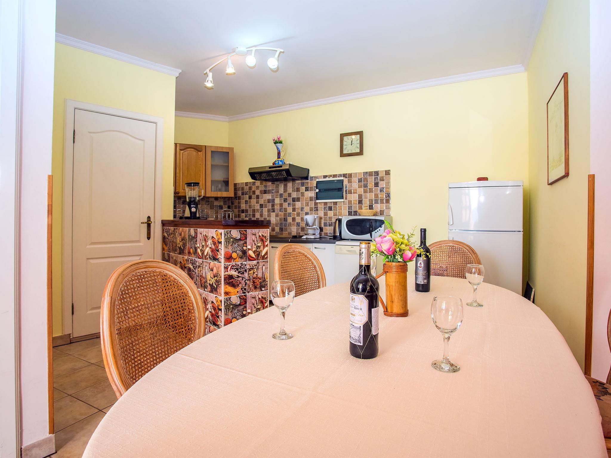8-Zimmer-Haus 250 m2 auf 3 Stockwerken. Wohn-/Esszimmer mit Sat-TV (Flachbildschirm), Klimaanlage. Ausgang zur Terrasse. 2 Zimmer, jedes Zimmer mit 1 franz. Bett (180 cm, Länge 200 cm). 1 Zimmer mit 2 x 1 Etagenbetten (80 cm, Länge 200 cm). Offene Küche (2 Kochplatten, Backofen, Geschirrspüler, Mikrowelle, Tiefkühler, elektrische Kaffeemaschine). Dusche, sep. WC. Keine Heizmöglichkeit. Obergeschoss: (geländerlose Treppe) abgeschrägtes Wohn-/Esszimmer mit Sat-TV (Flachbildschirm), Klimaanlage. Ausgang zur Terrasse. 2 Zimmer, jedes Zimmer mit 1 franz. Bett (180 cm, Länge 200 cm). Abgeschrägt 1 Zimmer mit 2 Betten (80 cm, Länge 200 cm). Offene Küche (4 Kochplatten, Backofen, Geschirrspüler, Mikrowelle, Tiefkühler). Dusche, sep. WC. Terrasse 85 m2 teilweise überdacht Terrasse 45 m2. Terrassenmöbel, Gartengrill, Liegestühle. Herrliche Panoramasicht auf das Meer. Zur Verfügung: Haartrockner. Internet (Wireless LAN, gratis).