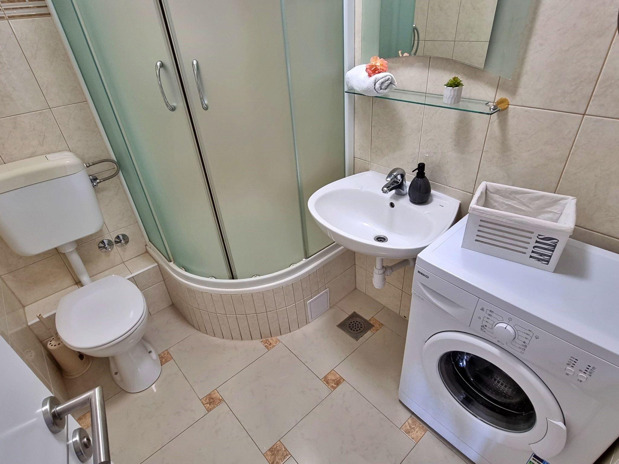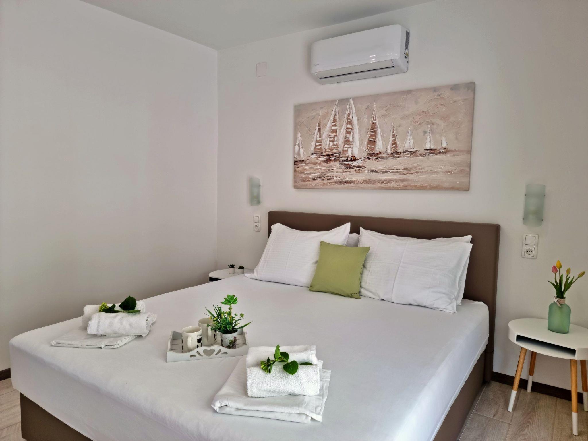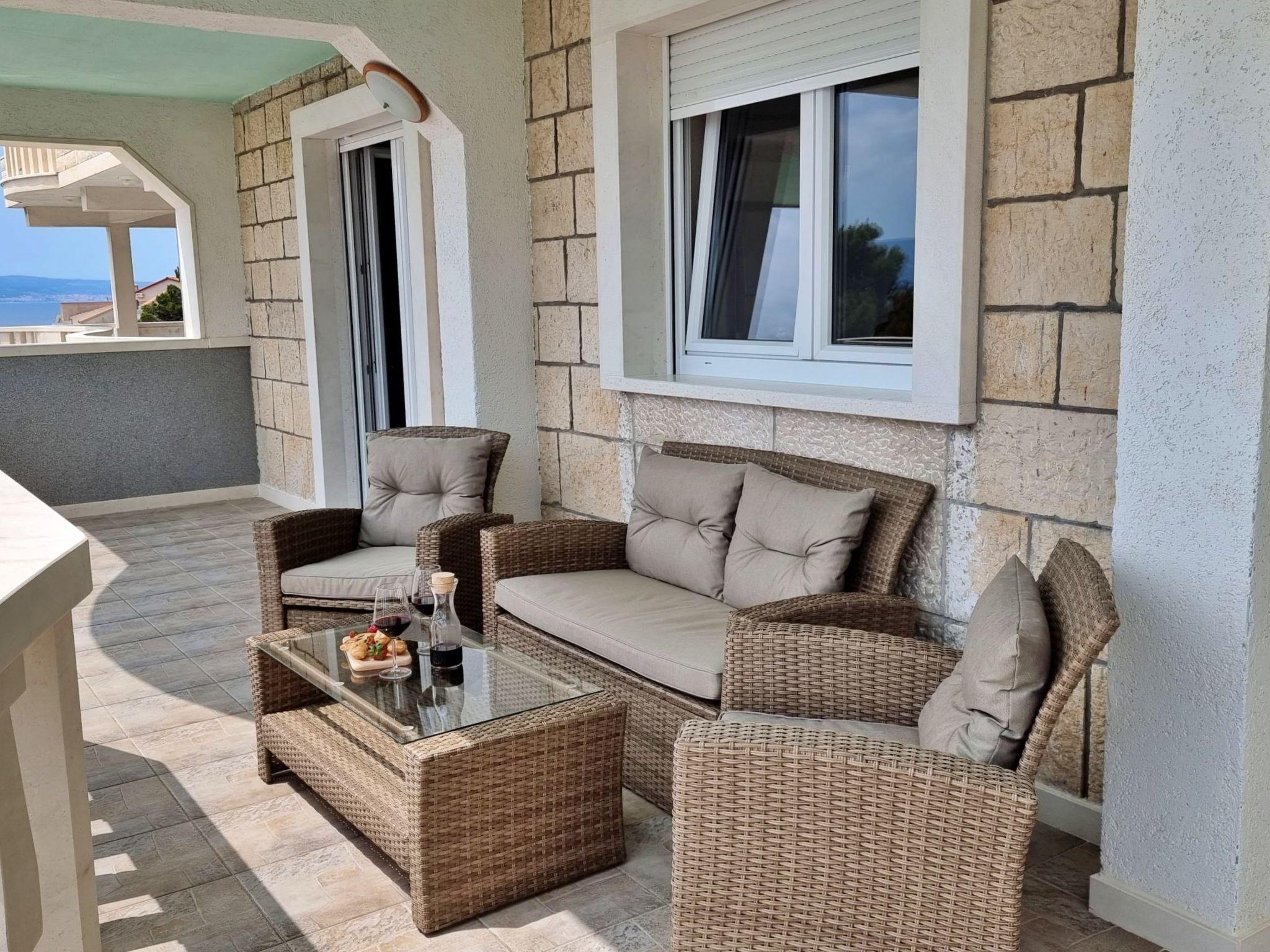 Es handelt sich um ein privates Apartment in einem Gebäude im 1. Stock, das Platz für bis zu 5 Personen bietet. Die Wohnung verfügt über zwei Schlafzimmer mit Doppelbetten, in einem davon befindet sich ein Schlafsofa für eine weitere Schlafmöglichkeit, eine ausgestattete Küche (mit Backofen, Geschirrspüler, Küchenutensilien und anderen Küchengeräten) mit einem Wohnzimmer und einem Ess-/Sitzbereich, 2 Bäder und einen Balkon mit Meerblick und einem Ess-/Sitzbereich im Freien.