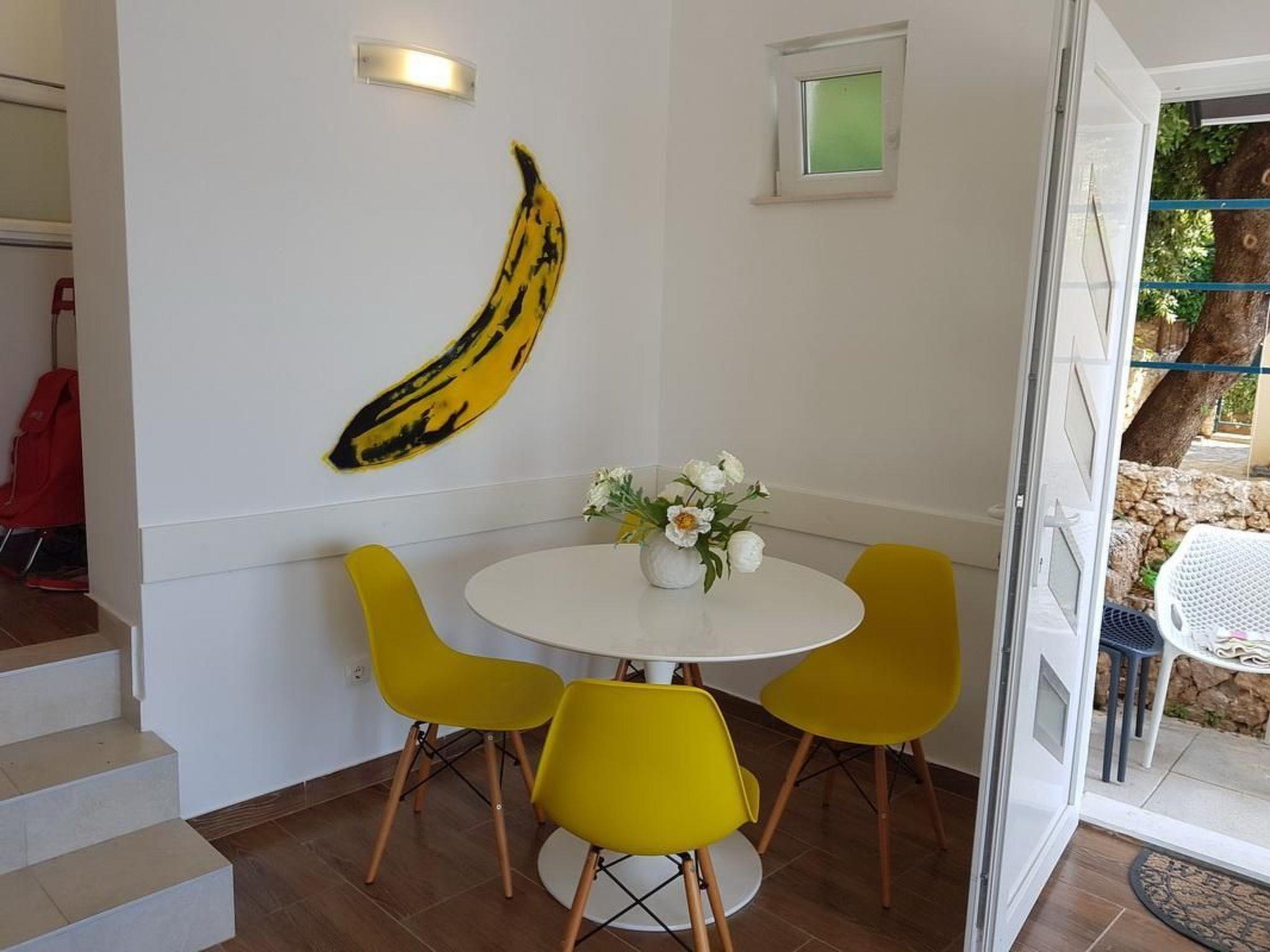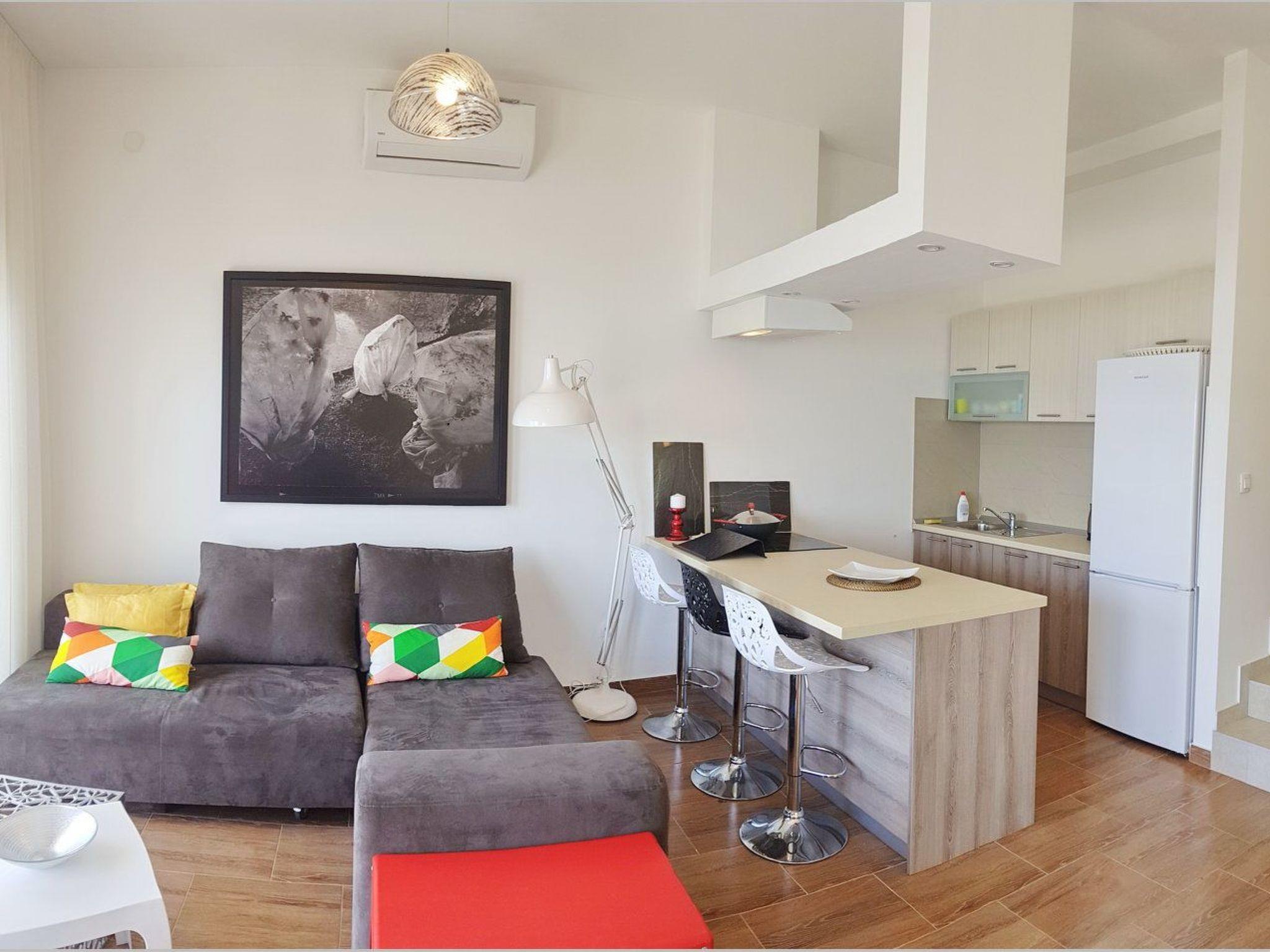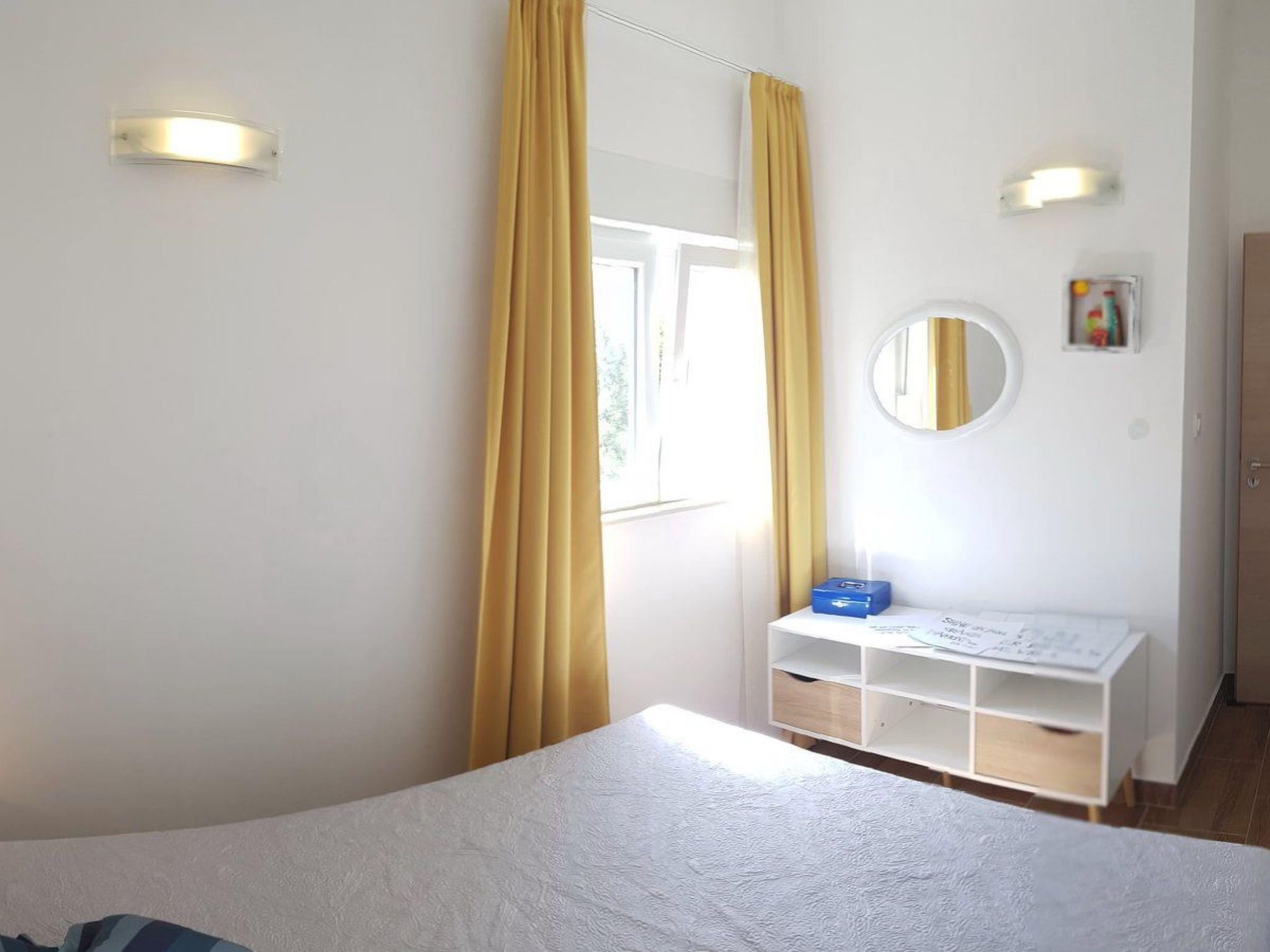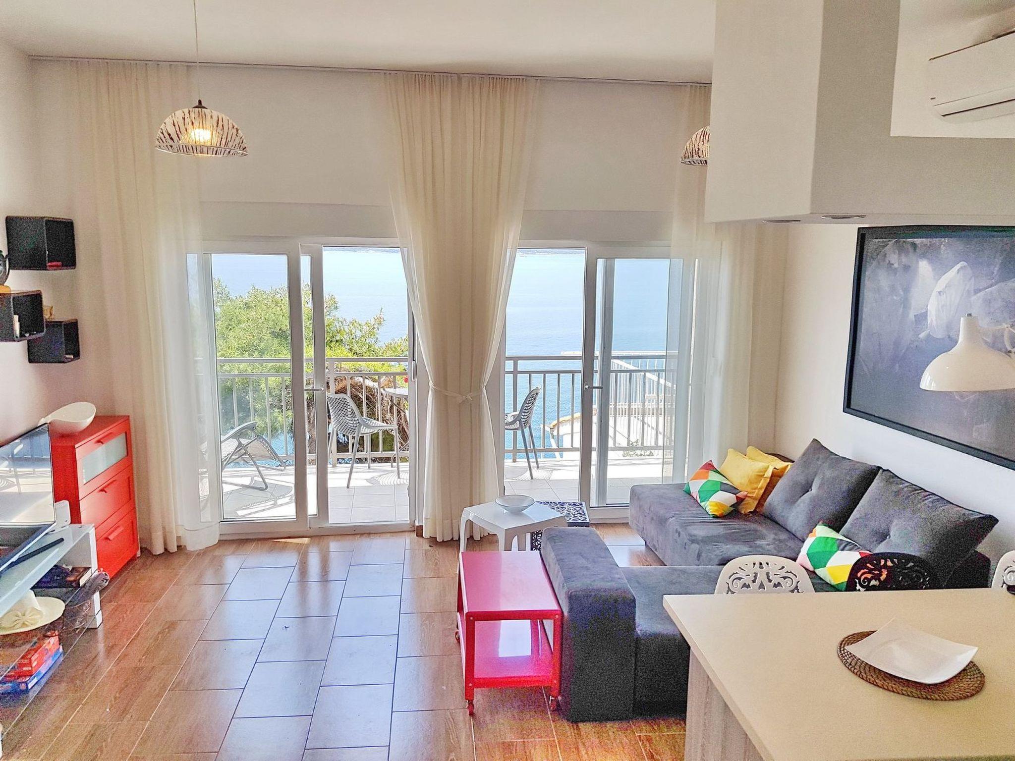 Das Apartment 1 befindet sich in der untersten Etage, mit einem Schlafzimmer (Doppelbett und Etagenbett), Wohnzimmer mit Schlafcouch für eine Person, Küche, Badezimmer mit Dusche und einem Balkon mit Meerblick.