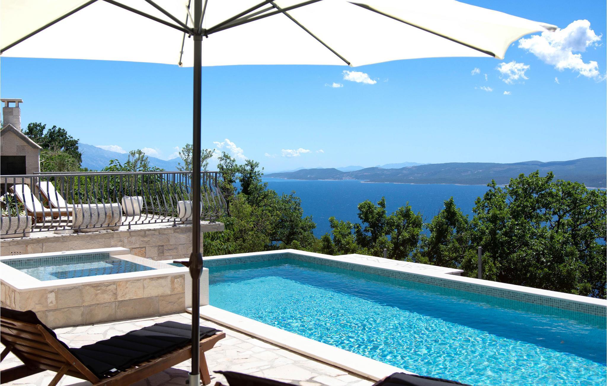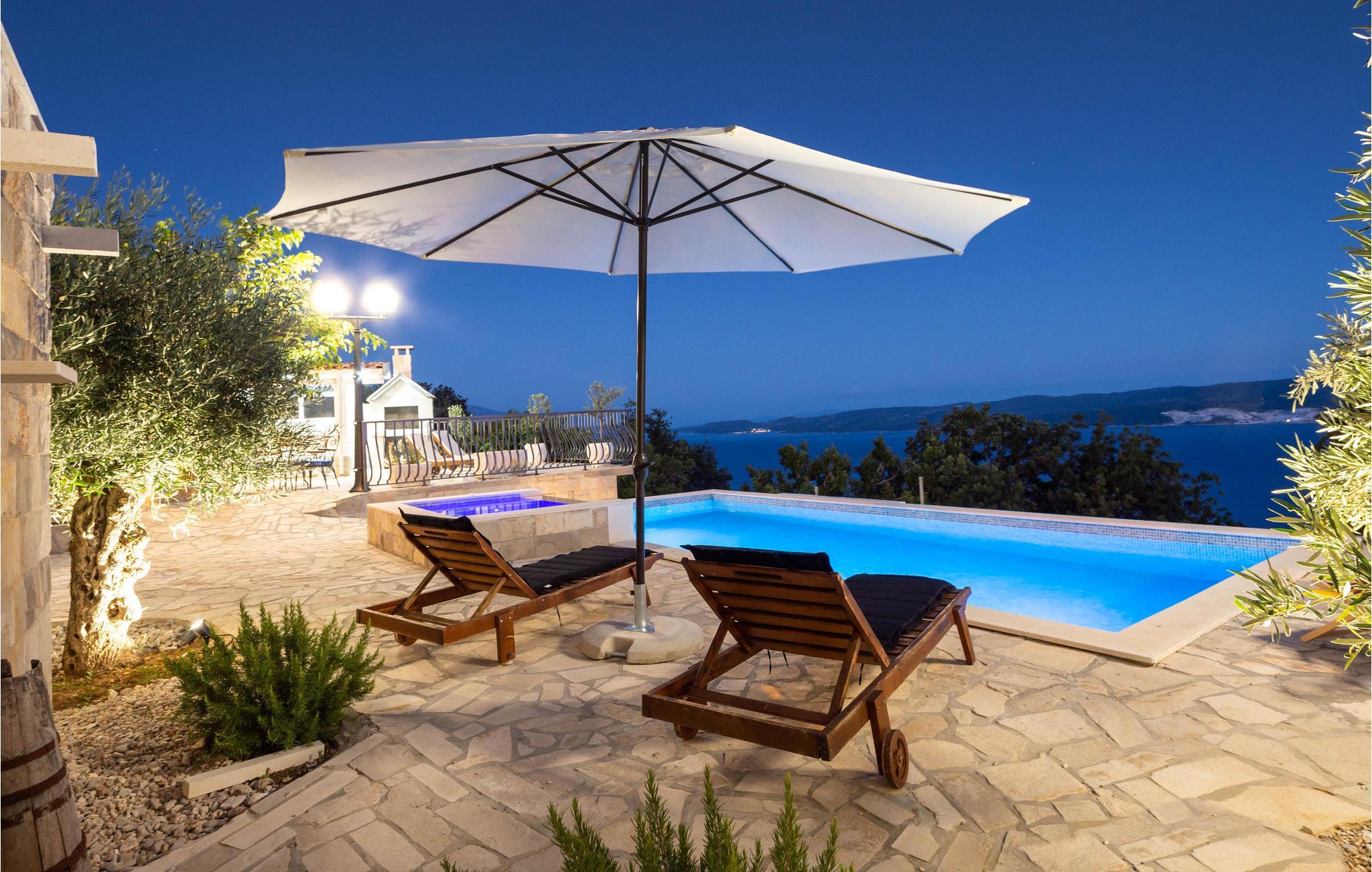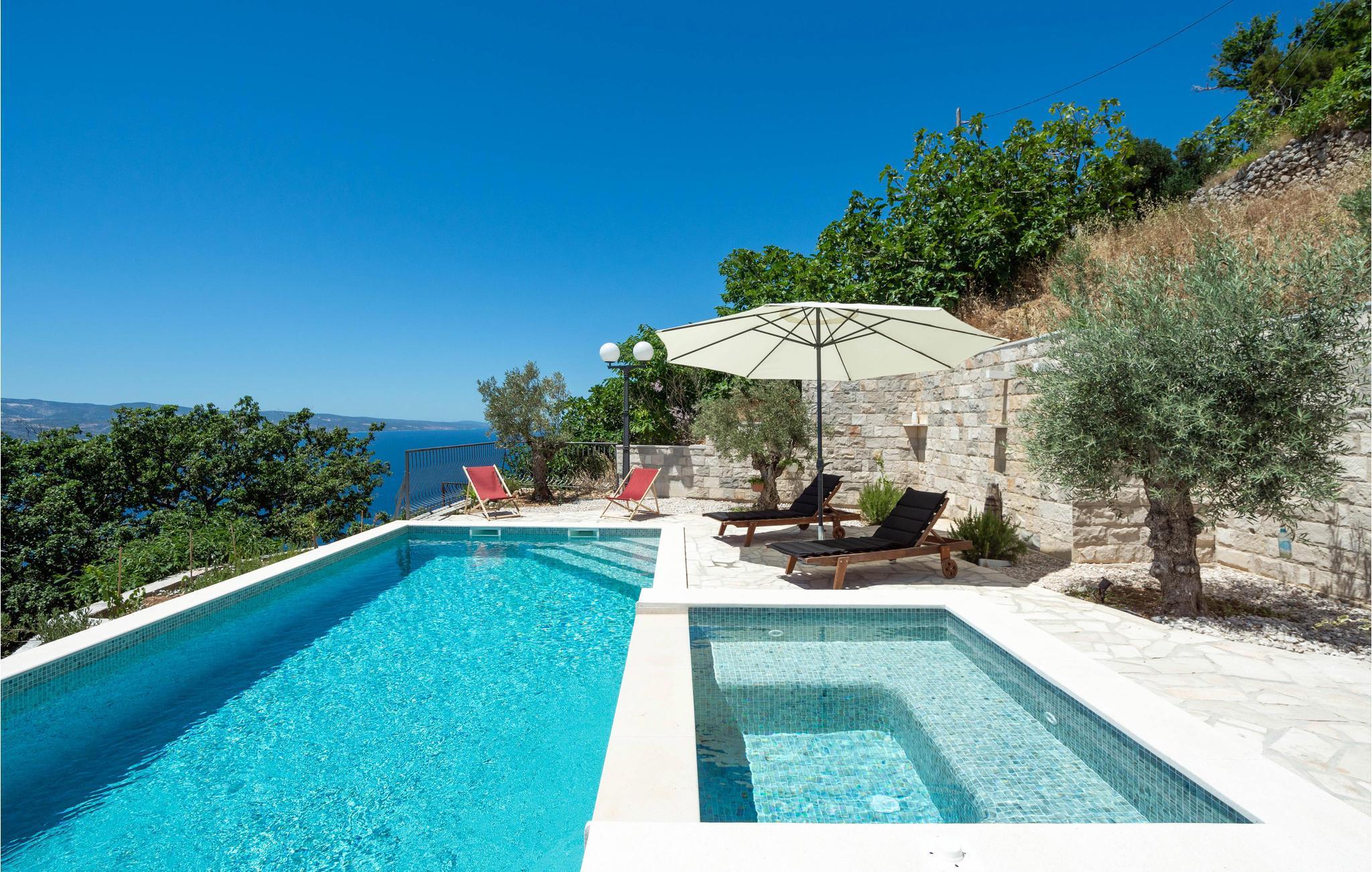 Dieses Ferienhaus mit Pool liegt an den Berghängen des Gebirges Dinara, im Herzen von Dalmatien und nicht weit von Split entfernt. Die rustikale und modern eingerichtete Ferienunterkunft besteht aus zwei Wohneinheiten und bietet Ihnen alles, was Sie für einen angenehmen Aufenthalt benötigen. Genießen Sie die herrliche Aussicht auf das offene Meer, die große Terrasse mit Pool für Ihre Erfrischung sowie den Whirlpool, in dem Sie sich entspannen können. Das Erdgeschoß mit modern ausgestatteter Küche sowie Ess- und Wohnbereich ist die Zone für geselliges Beisammensein. Der Schlafbereich befindet sich auf den oberen Etagen.