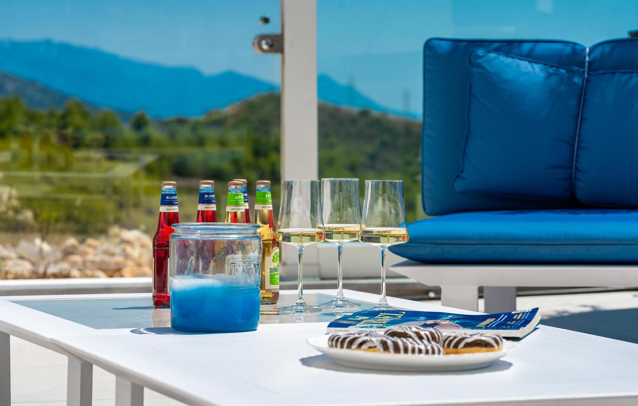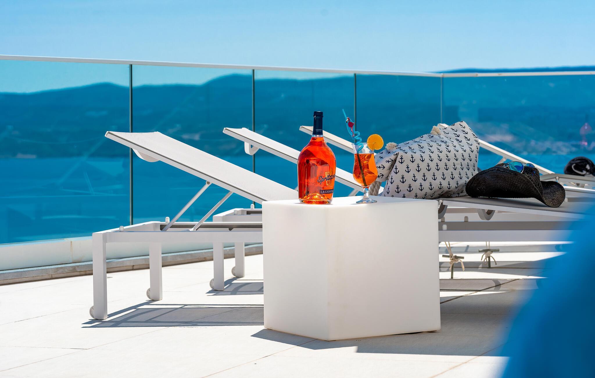 Auch im Freien finden Sie schöne Plätze, um in der Sonne zu entspannen. Machen Sie es sich mit kalten Getränken auf Balkon und Terrasse bequem, lassen Sie sich nach einer Erfrischung im Pool im Liegestuhl nieder und genießen Sie die herrliche Aussicht.