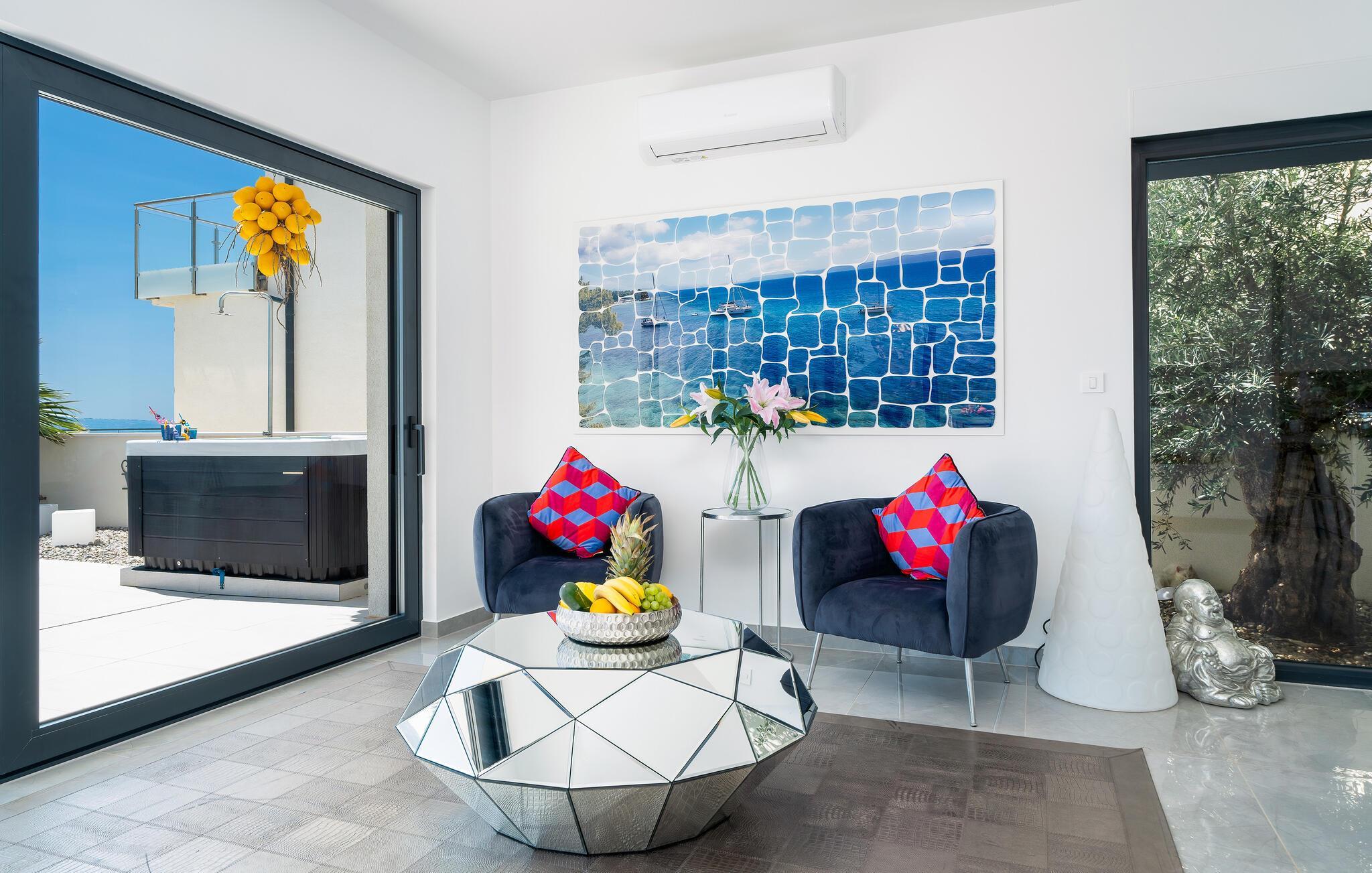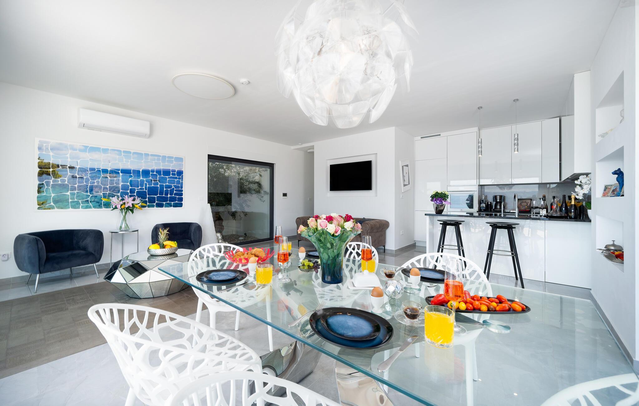 Verbringen Sie eine unvergessliche Zeit in diesem komfortablen und modernen Haus, das seine Gäste nur wenige Schritte vom Strand empfängt und alles bietet, was Sie für einen erholsamen Urlaub brauchen. Entspannen Sie in stilvollem Ambiente und machen Sie es sich nach einem spannenden Tag gemeinsam auf bequemen Sofas gemütlich, bodentiefe Fenster gewähren Ihnen bei Ihren Aktivitäten einen unvergesslichen Blick auf das Meer.