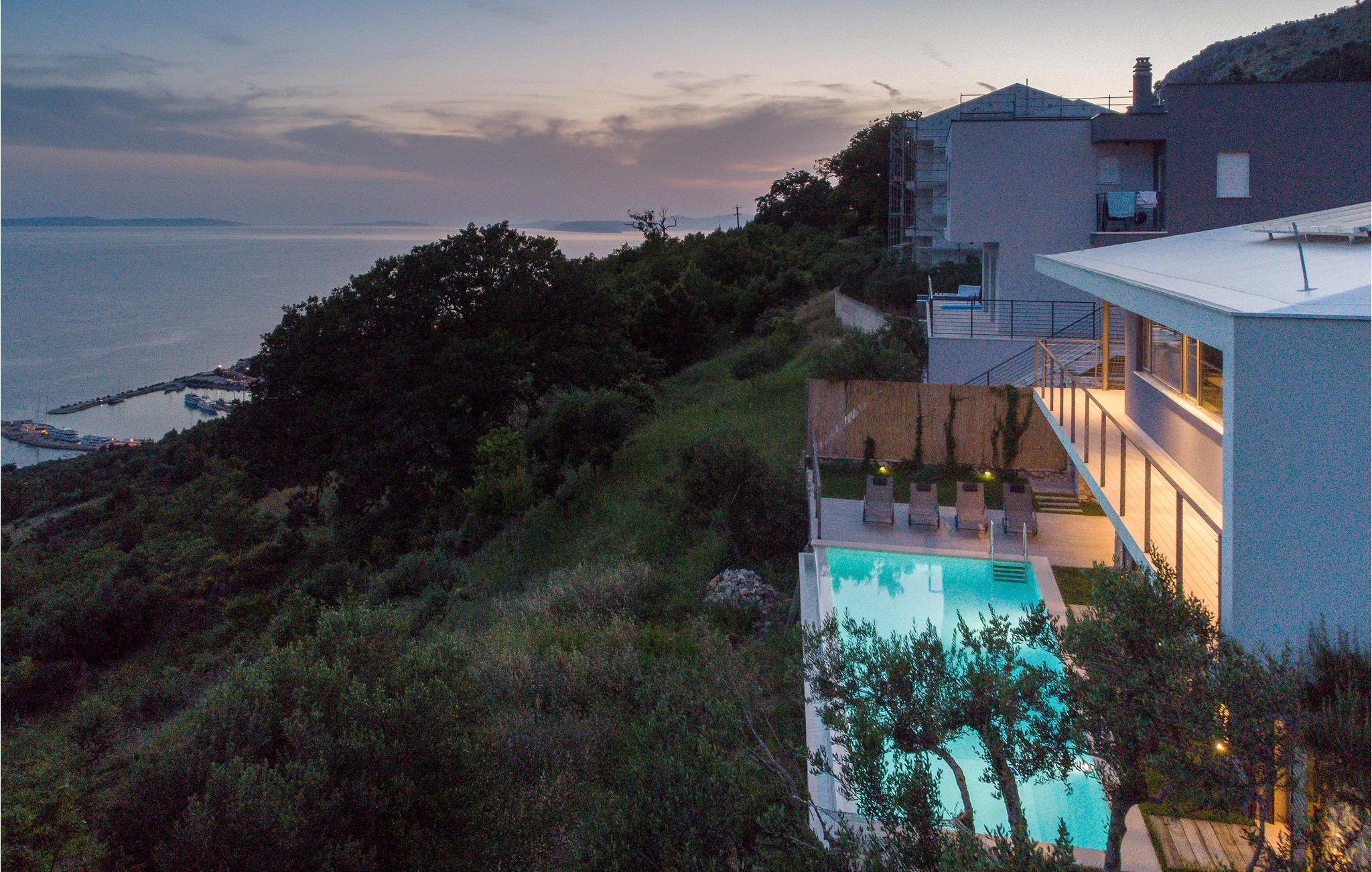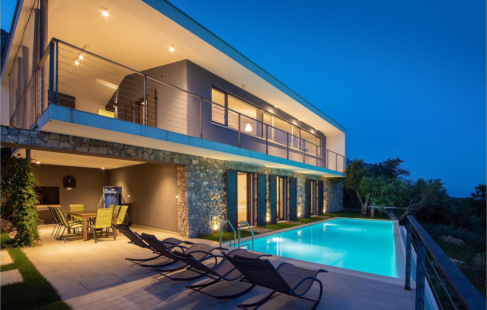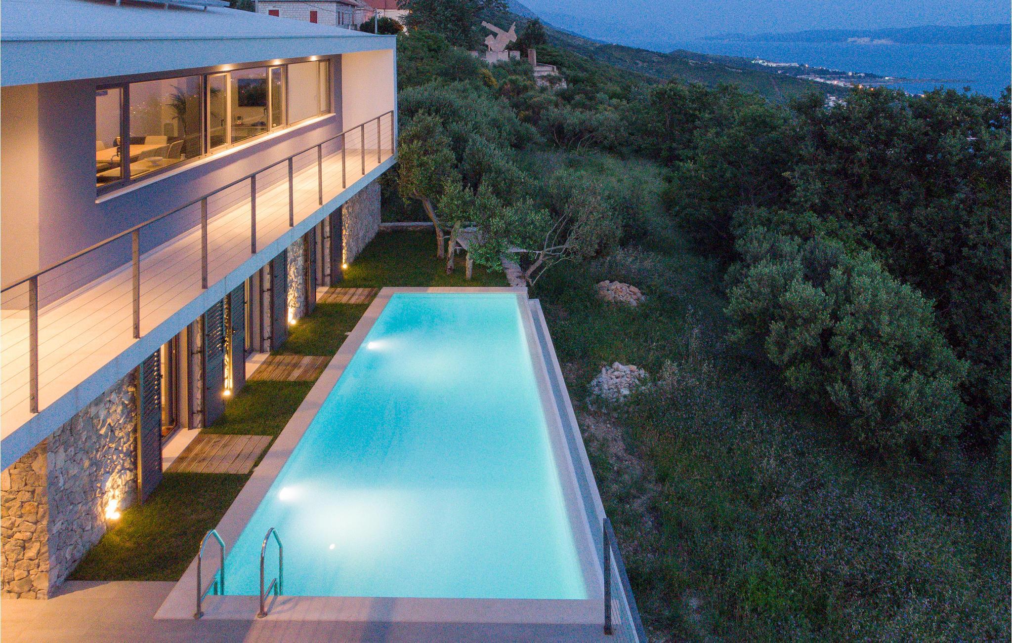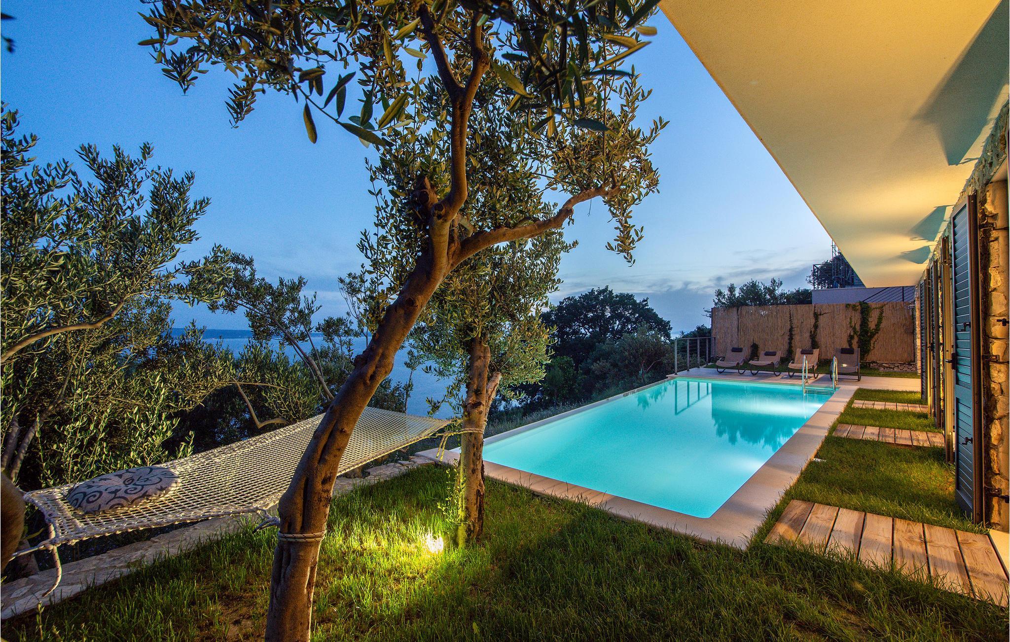 Ein grandioses Ferienhaus, das mit seinem kompletten Exterieur auf phantastische Art mediterranes Lebensgefühl im 21. Jahrhundert verkörpert. Stein, Holz, Oliven, Meer, mediterrane Heilkräuter, sind nur ein Teil dieser schönen Flairs. Das Interieur ist luxuriös und ebenso komplett ausgestattet. Das Grundstück ist terrassiert, vom Parkplatz gelangen Sie direkt in den Wohnbereich. Über Außen- sowie Innentreppen gehen Sie hinab in die Ruheoase. Dort liegt der Pool sichtgeschützt und zugleich mit herrlicher Panoramaaussicht. Auch die Schlafzimmer auf dieser Etage haben direkte Ausgänge zum Pool, so können Sie auf einfache Art eine morgendliche Schwimmtour unternehmen. Das Haus ist wirklich spektakulär und der ideale Ort um dem schnelllebigen Alltag und Verkehrslärm zu entfliehen. Die frische Luft und die Natur heilen Geist und Körper und in Kombination mit diesem Luxus bekommt Ihr Urlaub eine neue Dimension. "Laden Sie Ihre Batterien auf", an diesem unvergesslichen Ort.