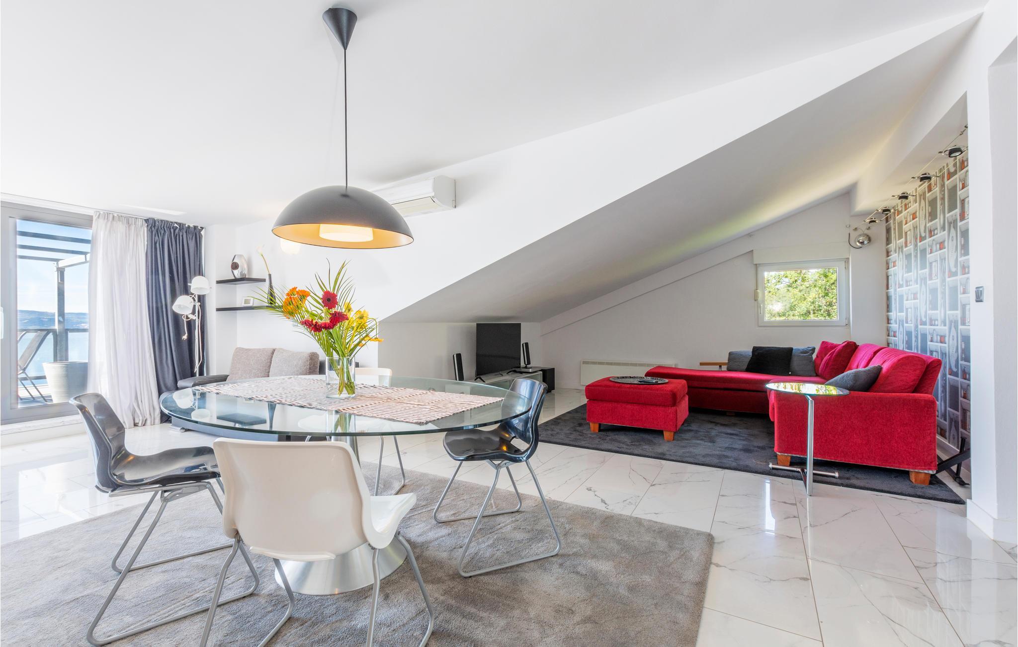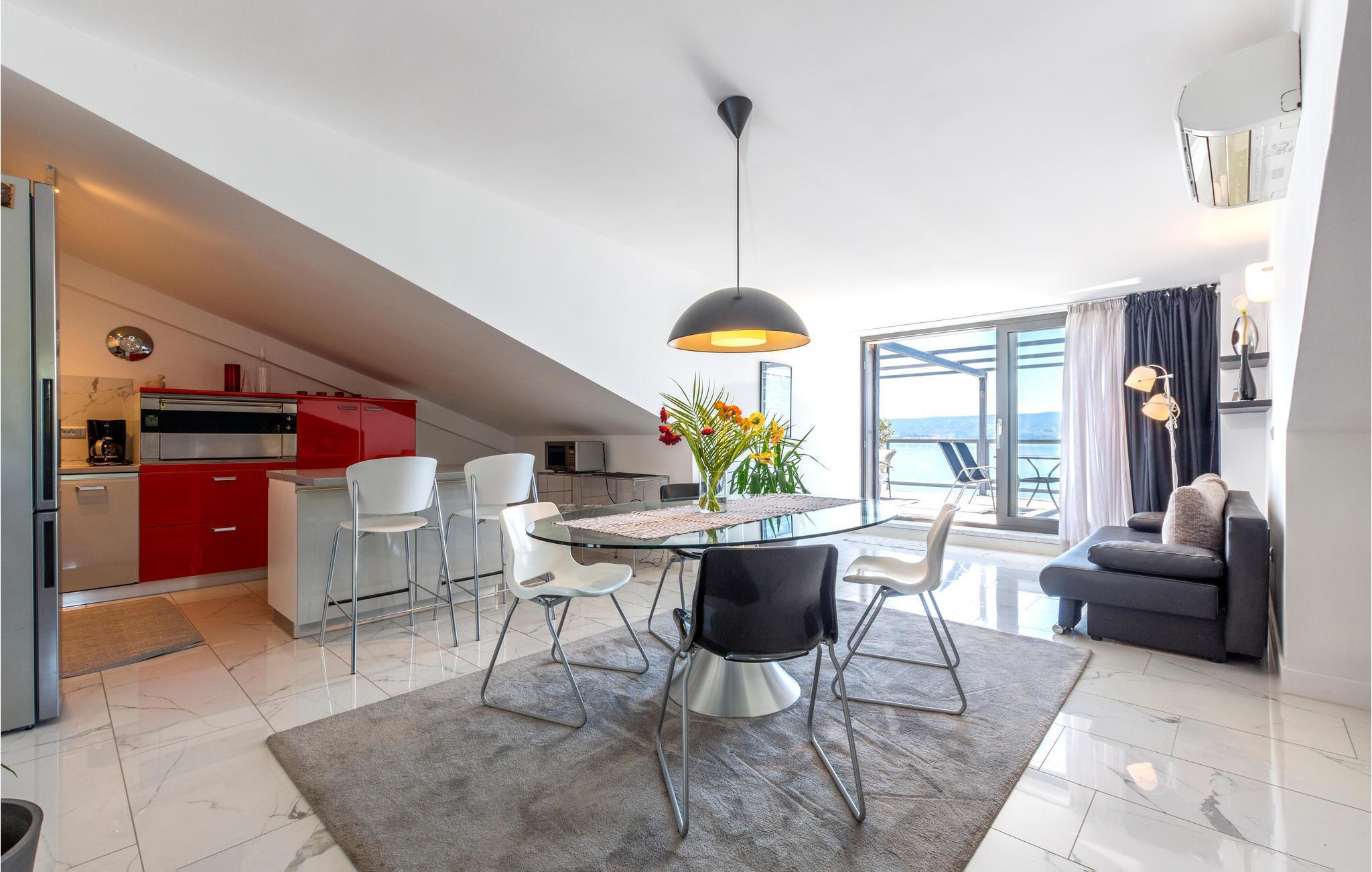 Modern, gut und geschmackvoll eingerichtete Dachgeschosswohnung (6. Stock, niedrigste Deckenhöhe 1 m) an der attraktiven Omis Riviera. An der bekannten Omis-Riviera befinden sich wunderschöne Strände, die zu Erholung und aktivem Urlaub mit zahlreichen Wassersportmöglichkeiten einladen.