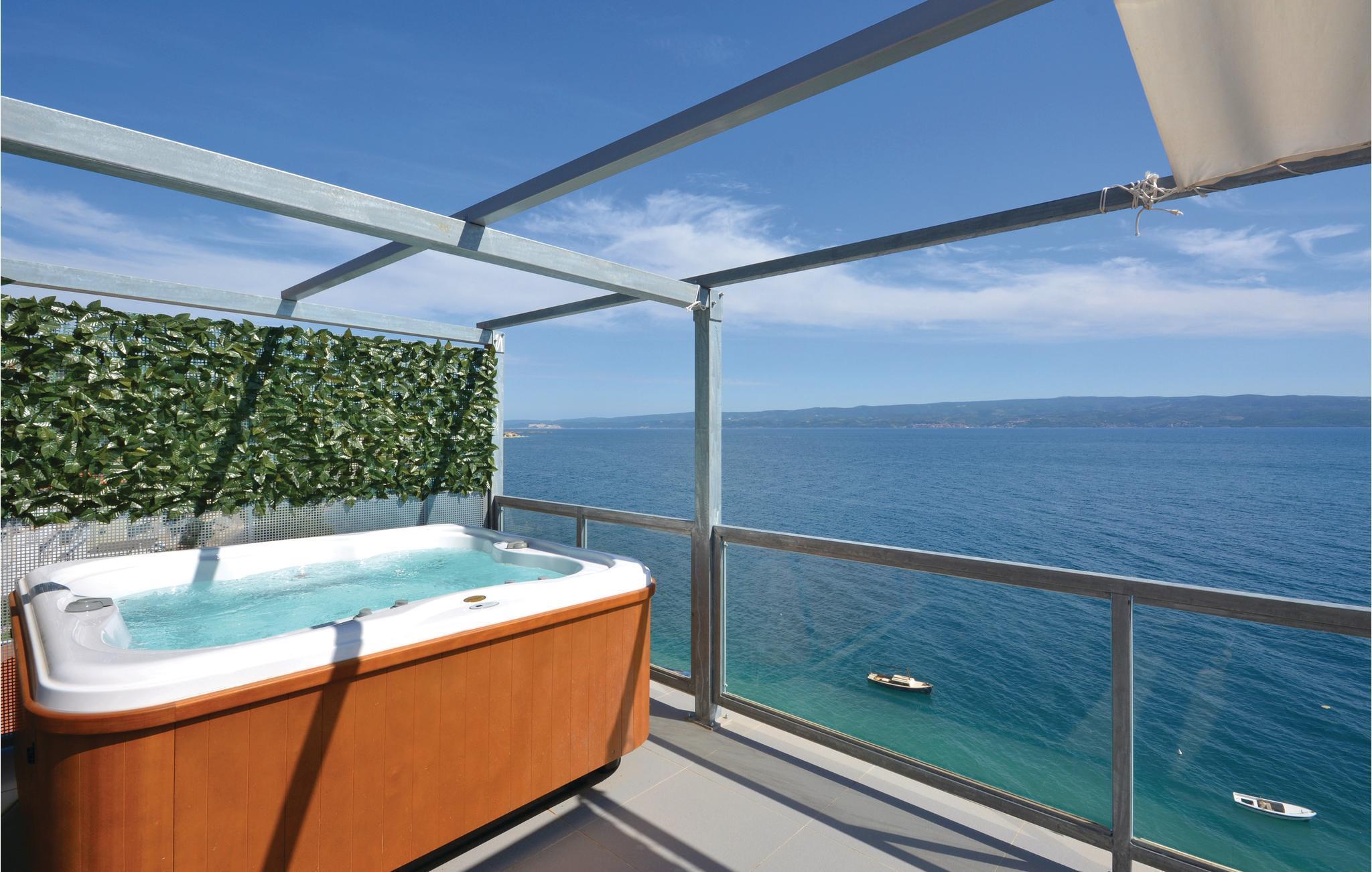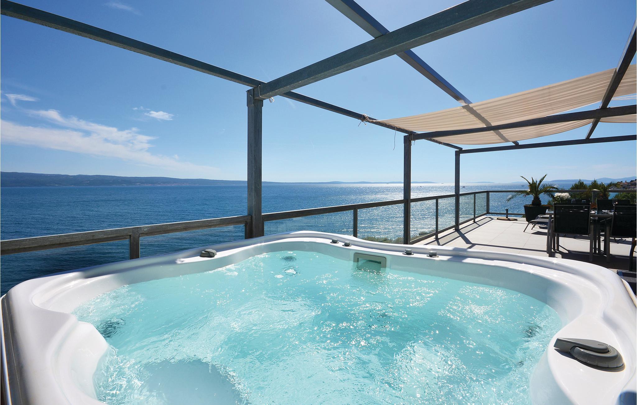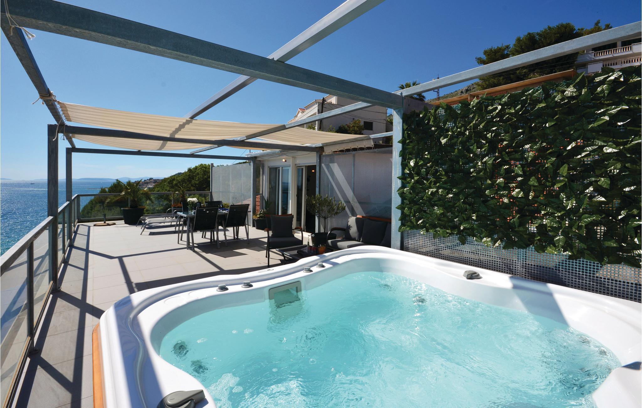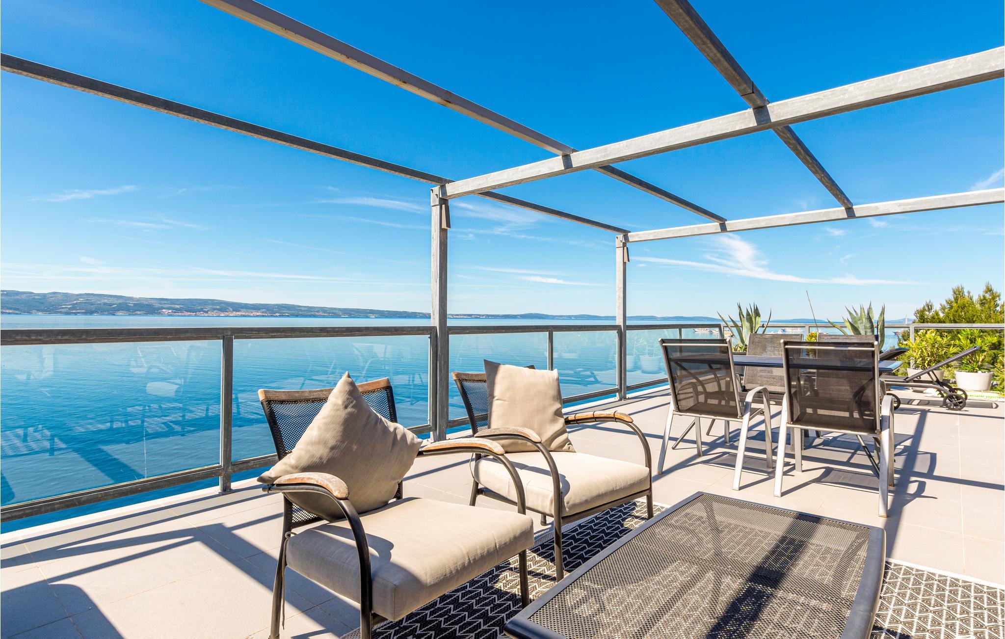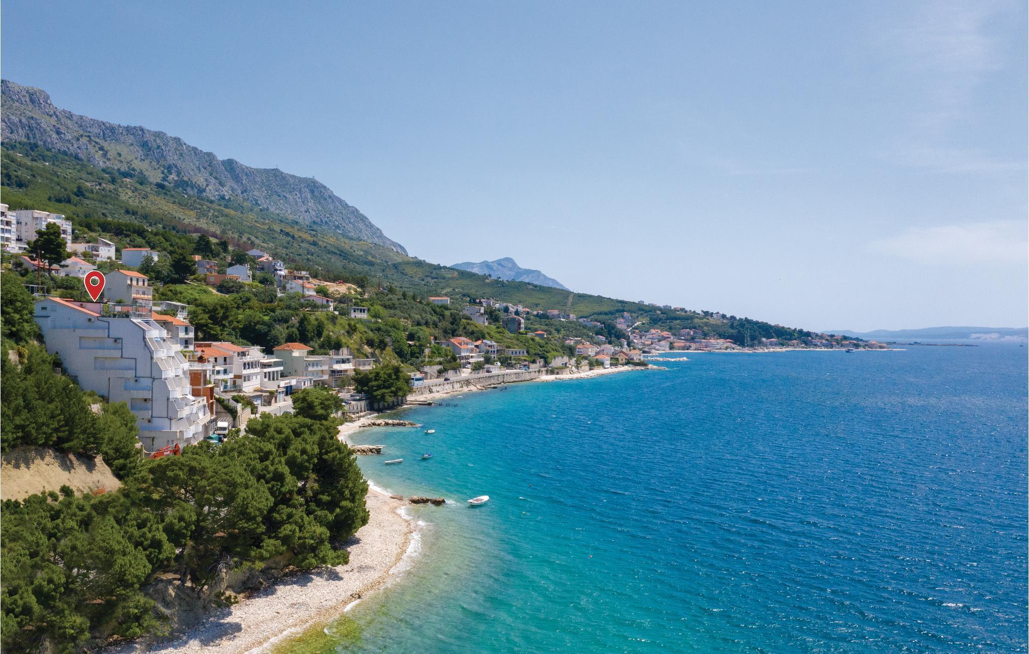 Der große Balkon mit einem wunderbaren Blick auf das Meer ist perfekt für romantische Momente zu zweit. Wohngebäude mit Treppe und Aufzug. Auf der anderen Seite der Küstenstraße genießen Sie die schönen Sommertage am Kieselstrand mit einem kristallklaren Badewasser. Besuchen Sie die beliebte Stadt Split, in der der römische Kaiser Diokletian einen großen Palast erbaut hat. 5 km vom Haus liegt Omis mit schönen, langen Sandstränden für Kinderfamilien.