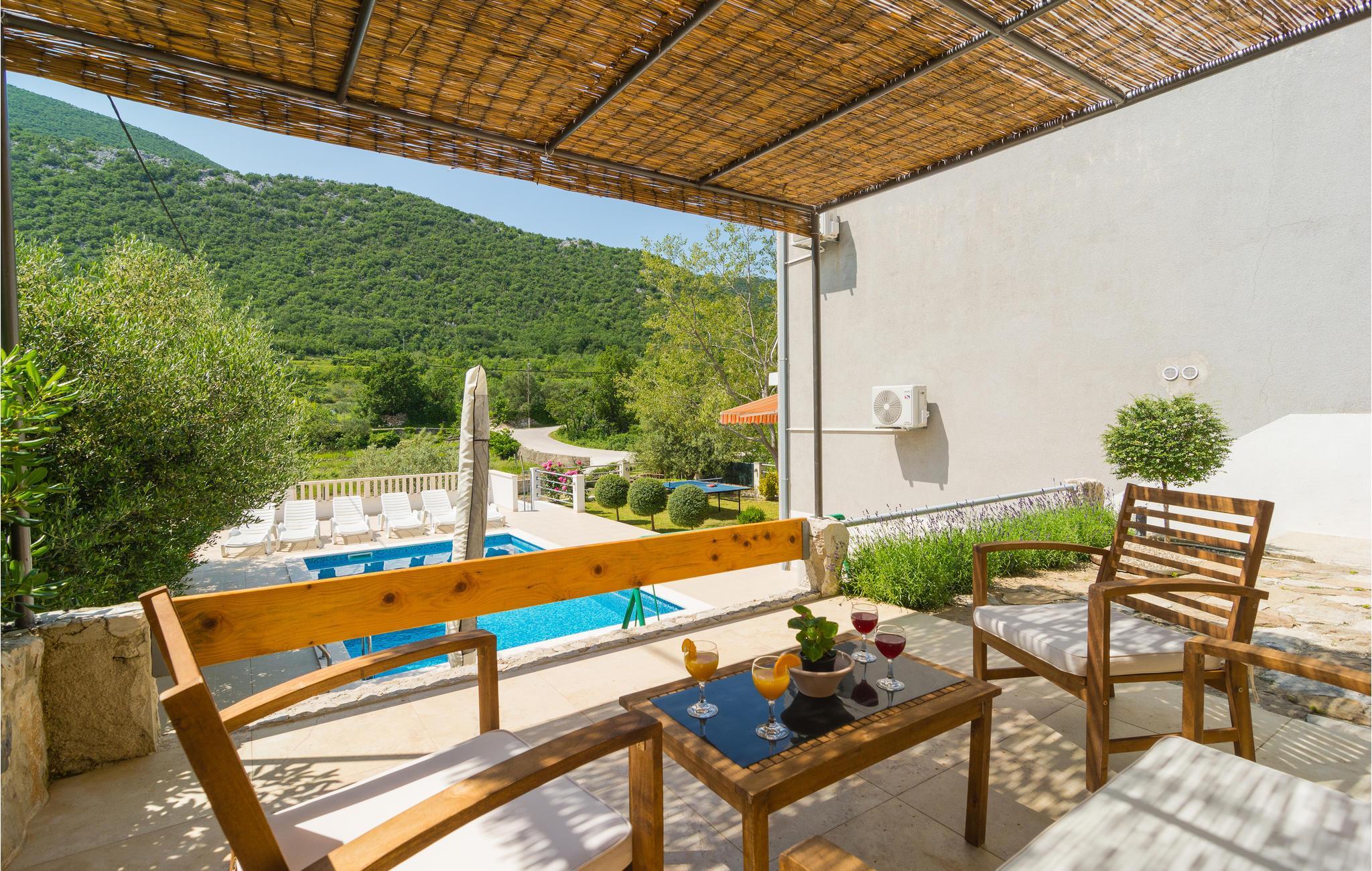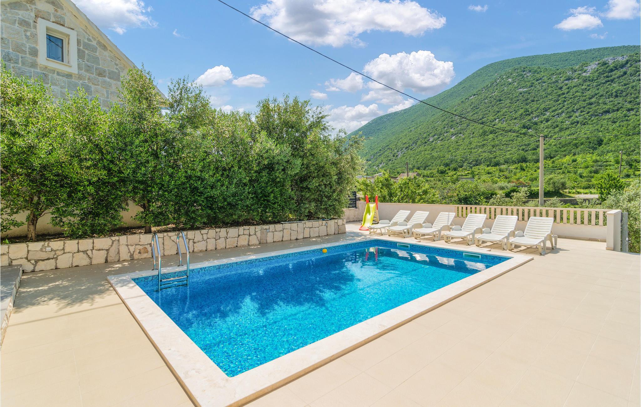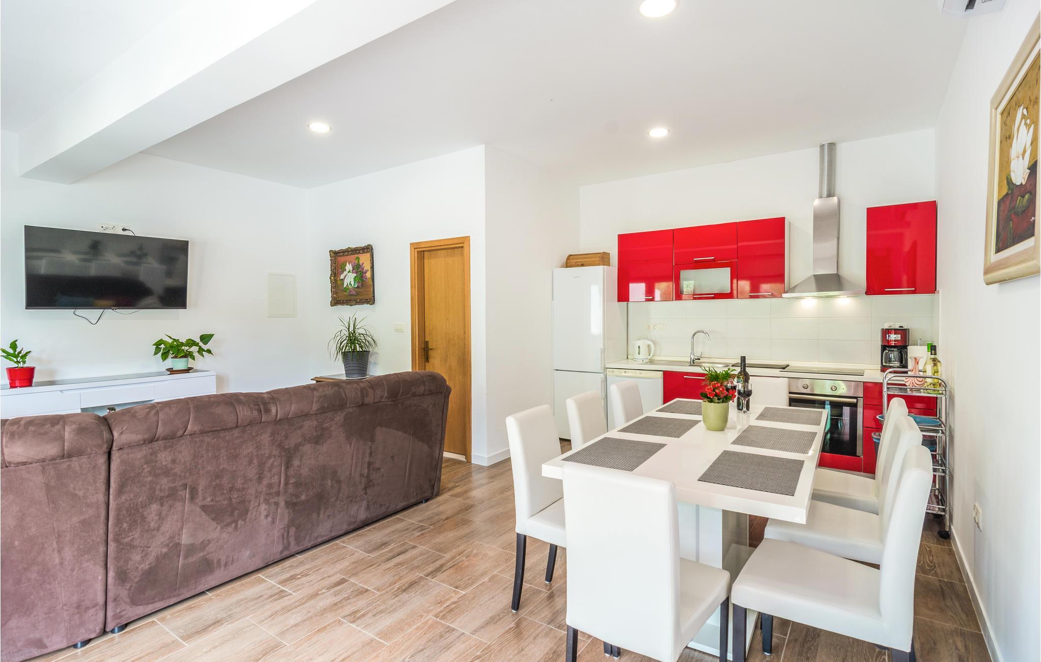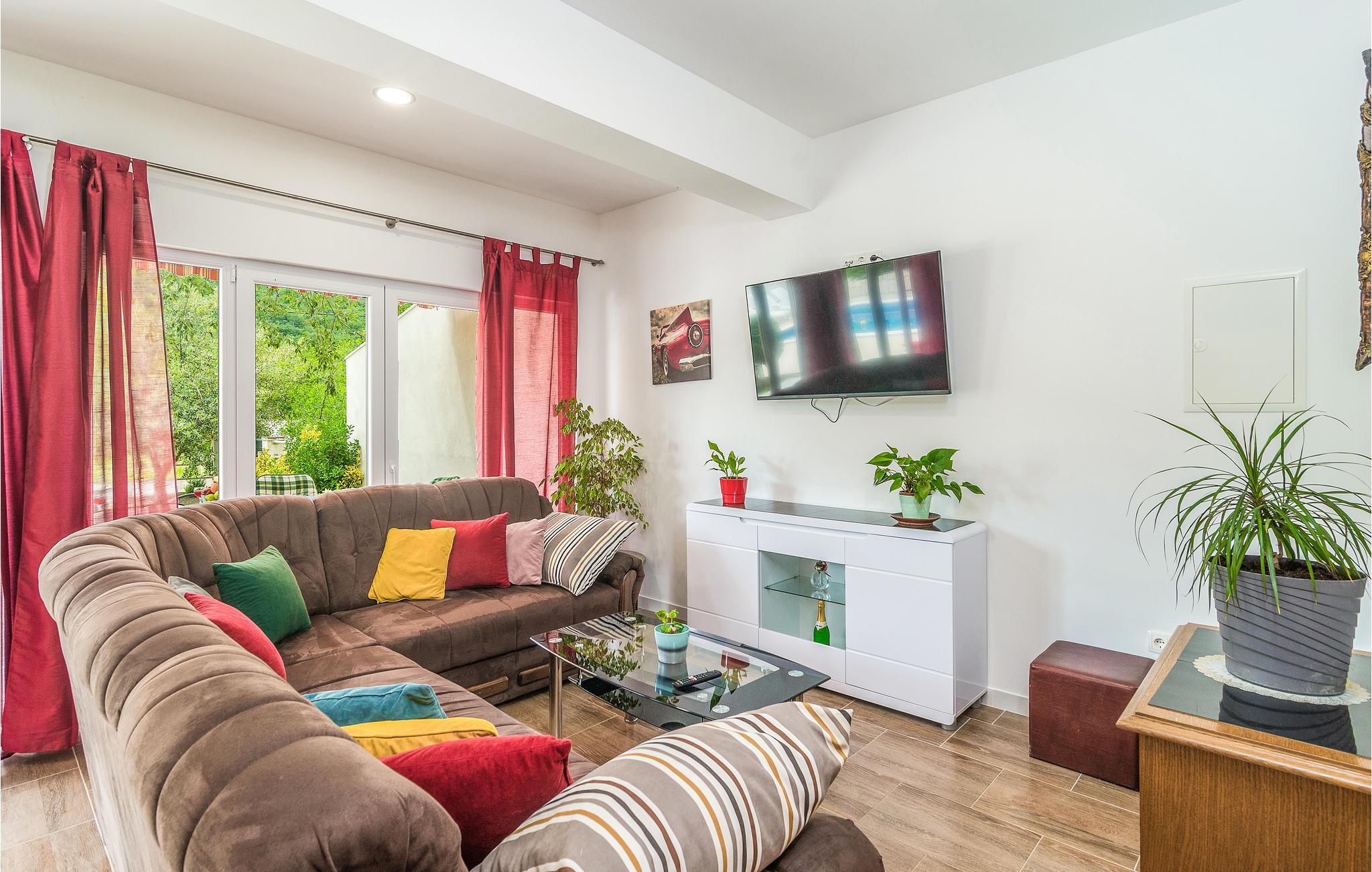Im Hinterland von Omis, neben dem Fluss Cetina und im kleinen Ort Kucice befindet sich diese freundlich eingerichtete Haushälfte. Vom Haupteingang auf der Nordseite geht es in den 1. Stock, in dem eine Küche und ein Wohnzimmer mit Terrasse sind. Zum 2. Stock gelangen Sie über Innentreppen, hier liegen die Schlafzimmer sowie eine Terrasse mit Blick auf die Landschaft. Erdgeschoss und den Poolbereich erreichbar über Außentreppen. Ebenfalls gibt es neben dem Parkplatz eine Küche mit Wohnbereich mit Glaswänden, die Sie öffnen können. So kann die Küche auch als Sommerküche dienen. Besichtigen Sie die Stadt Omis, die reich an Unterhaltungs- und Sportmöglichkeiten wie Radfahren, Rafting oder Zipline, ist.