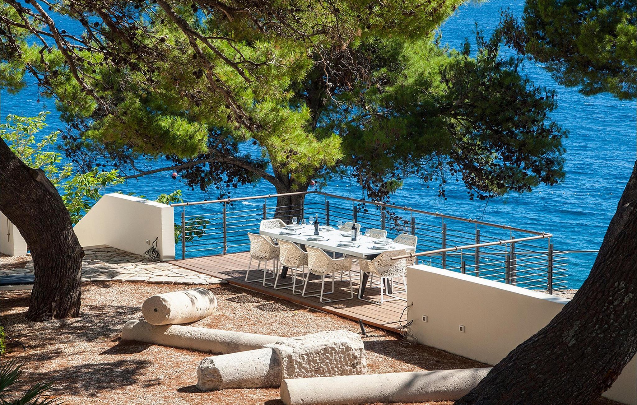 Unvergessliche Momente erwarten Sie auch im großen Pool, an dem Sie auf bequemen Liegestühlen die heißen Nachmittage im Schatten der Pinien genießen können. Servieren Sie sich kulinarische Highlights auf der herrlichen Terrasse mit Blick aufs Wasser und lauschen Sie dem Rauschen der Wellen bei Wein und Kerzenschein.